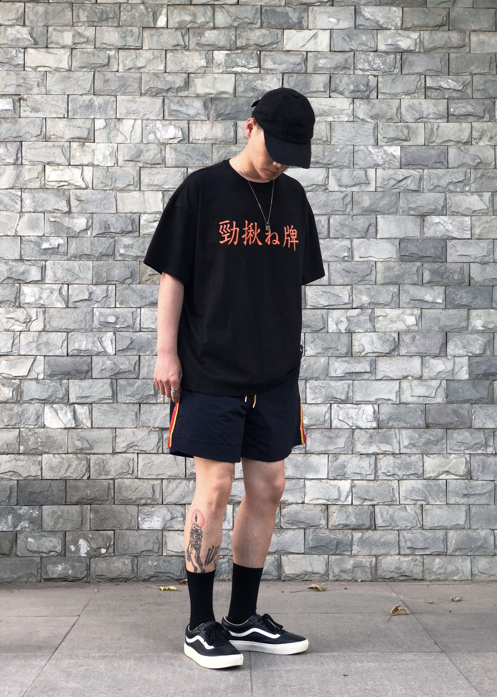 今天这套上衣穿了一件黑色宽松阔版背后字母刺绣印花圆领T恤 ⬇️ 裤子选择轻薄透气的军绿色直筒机能冰丝短裤 ⬇️ 鞋子上脚经典百搭的黑武士复古低帮板鞋 ⬇️ 最后戴一副氛围感十足的蓝牙耳机 - 今日搭配 衣服裤子:NICE LILI 鞋子:李宁