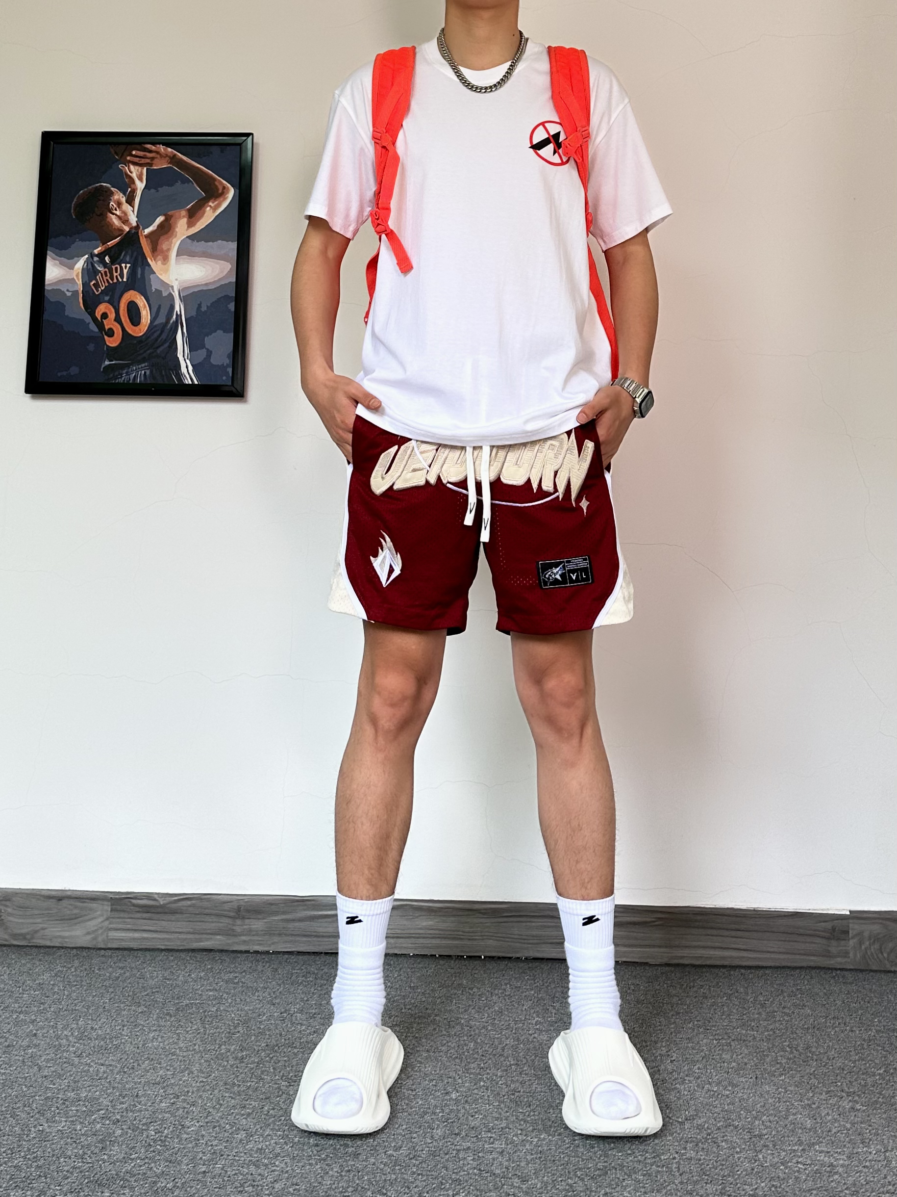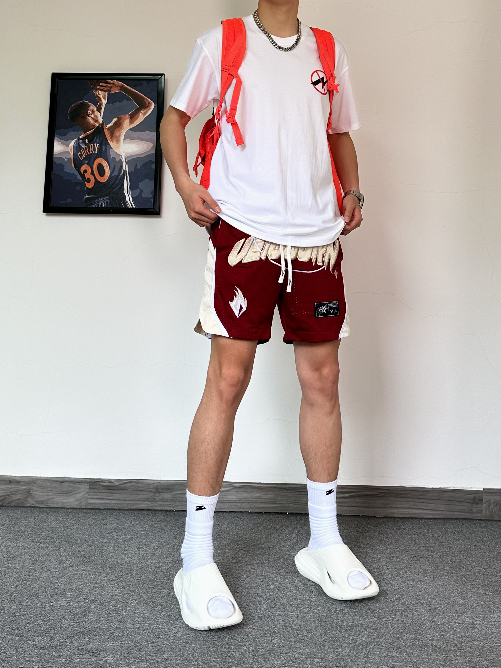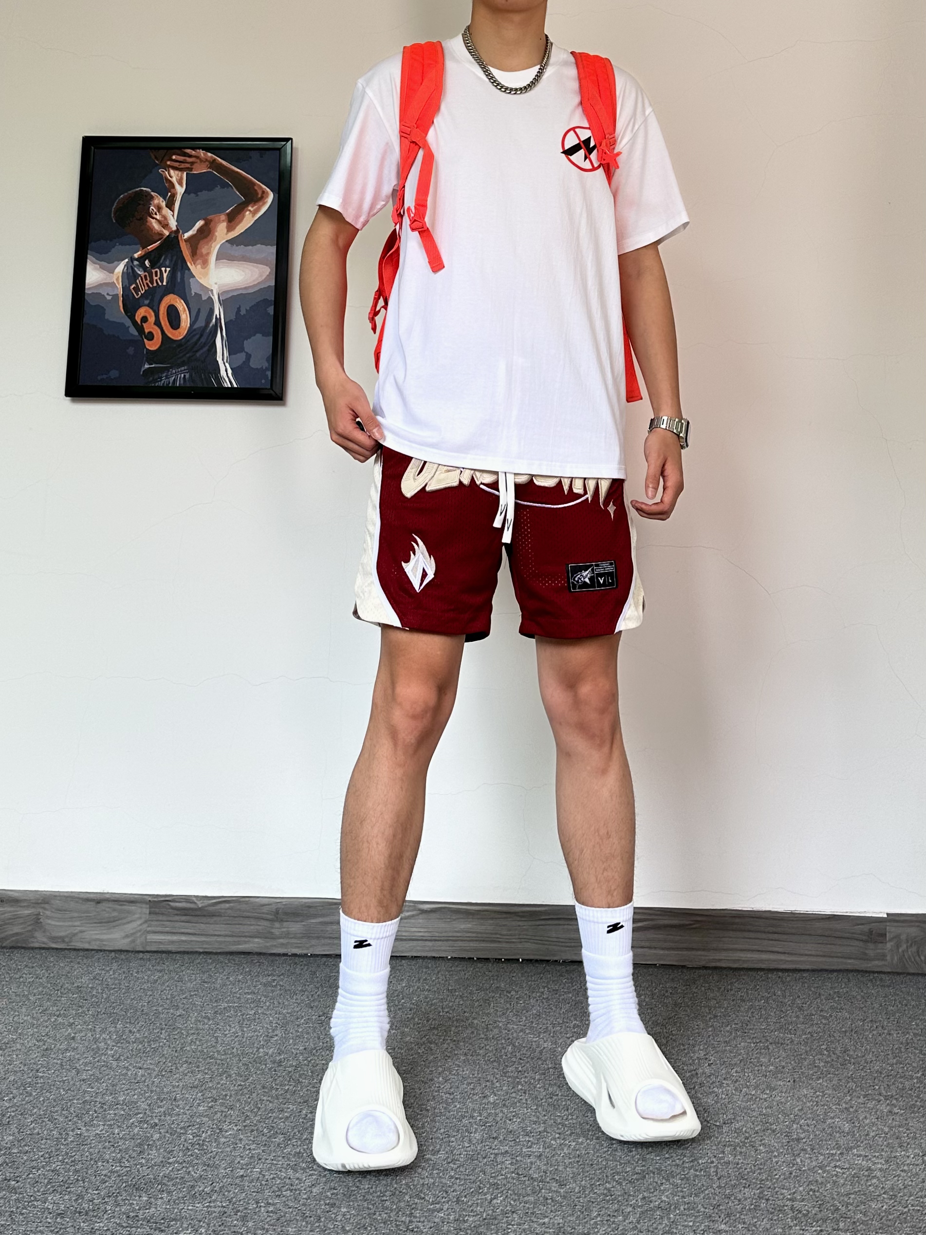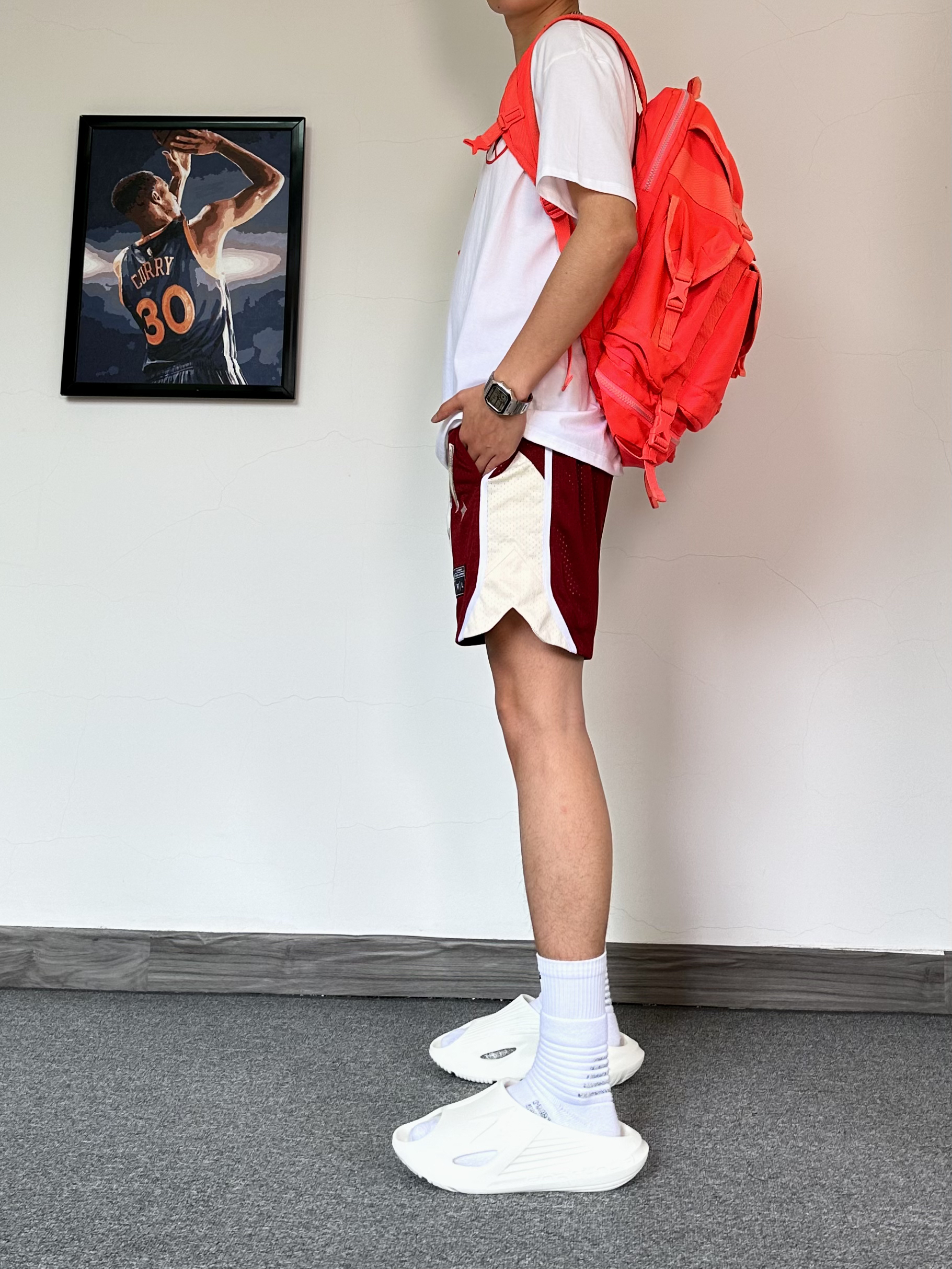 美式穿搭的尽头就是拖鞋配篮球袜 真的不要太舒服 夏天这样穿,吸汗又舒适 帅气又百搭! 一整个阳光又清爽 红色复古美式短裤 也是运动感十足!