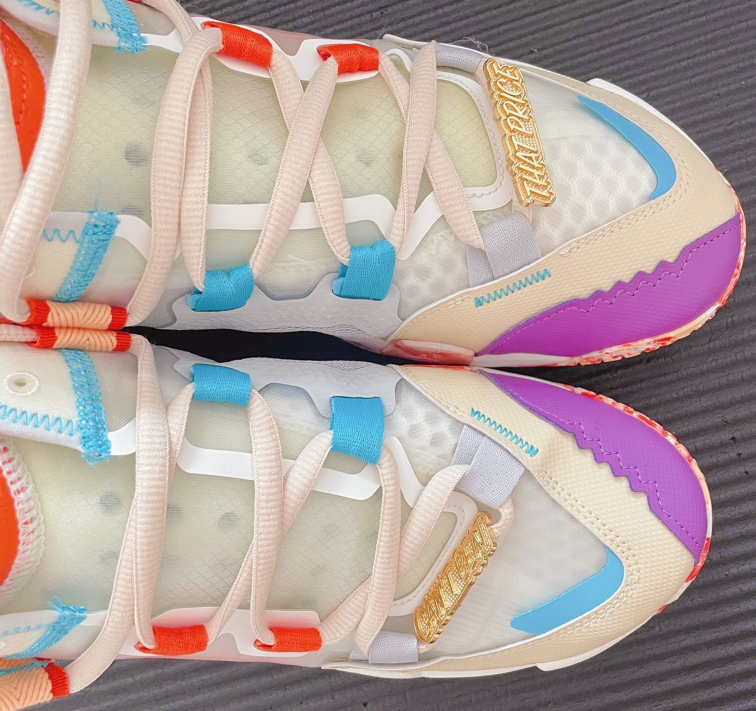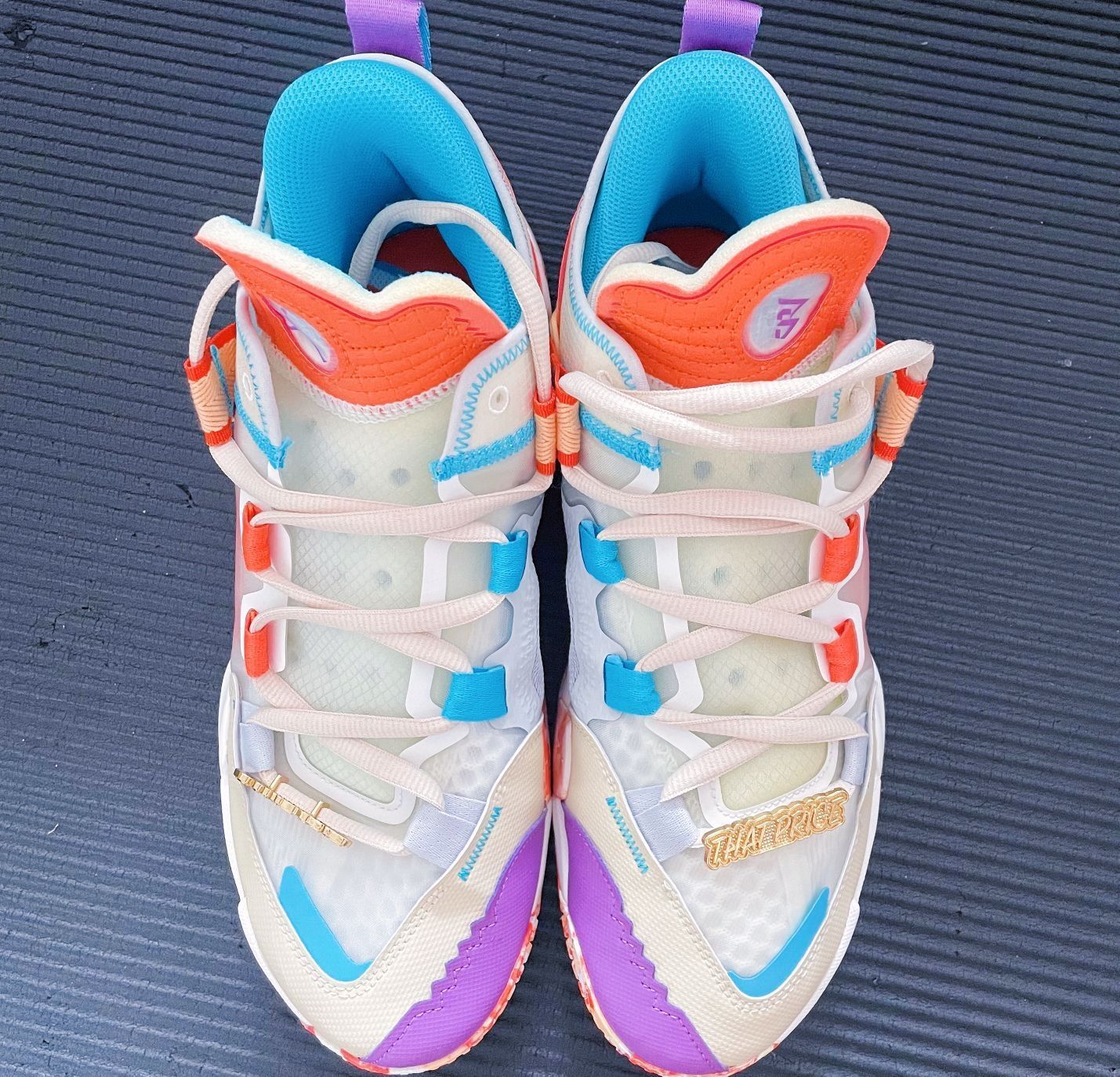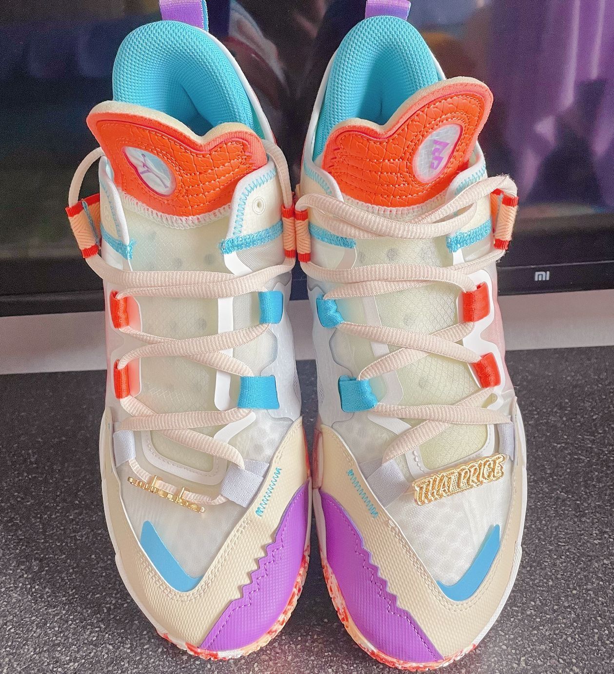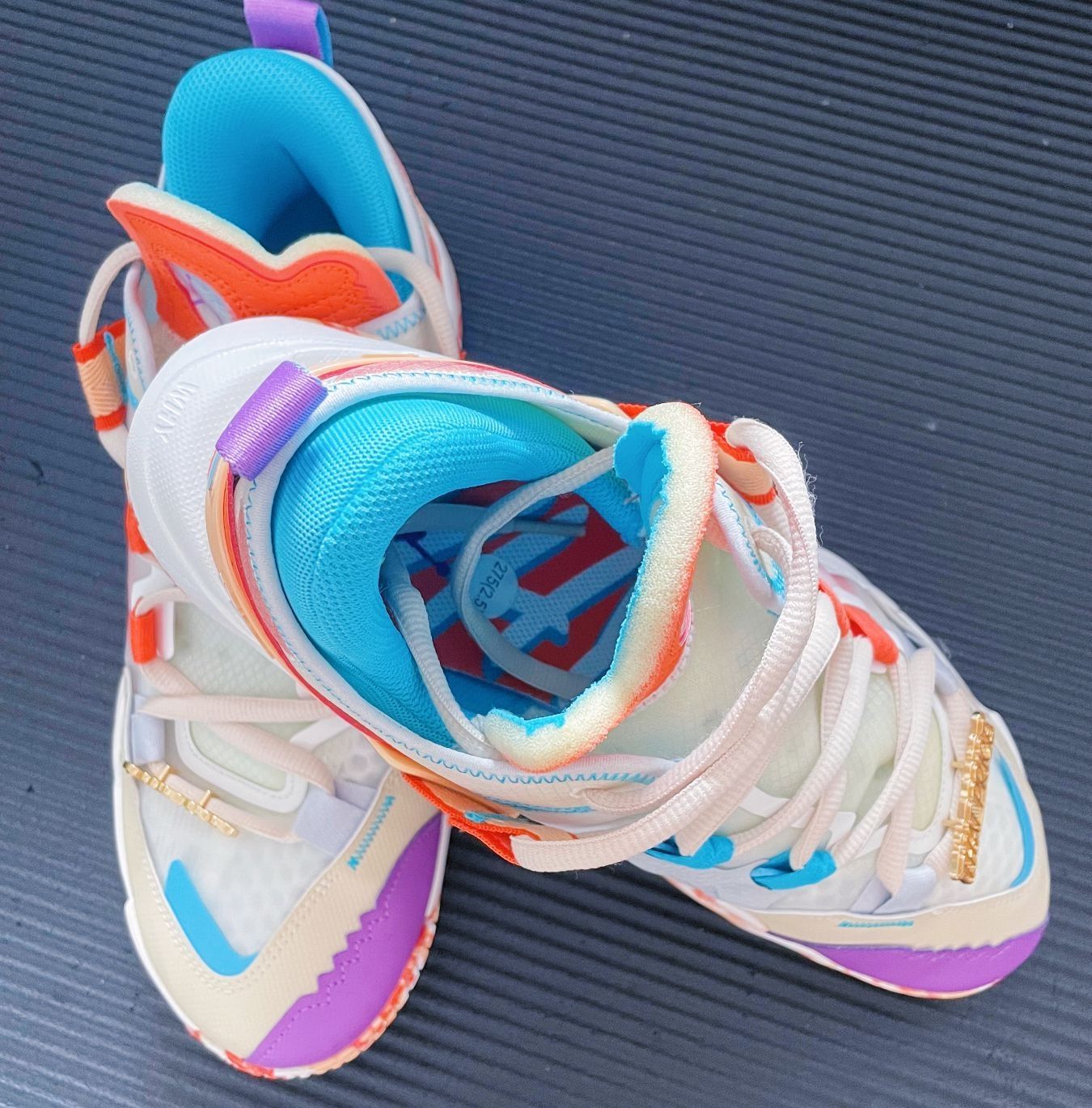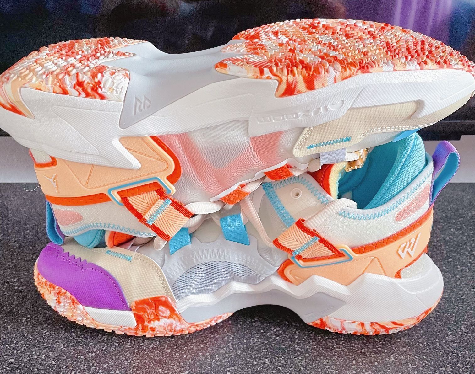 大金链子配色 威少 whynot 5 代,白橙配色,灰橙色鞋面,两侧鞋底是一种非常有质感的白色,“金链子”配色,名副其实,鞋带金黄色的土豪吊牌,给整个鞋身加上了暴发户的感觉,一天三顿小烧烤,大金链子就得配手表。各种颜色拼接的鞋身也是球场一道独特的风景,谁经过都得多瞅两眼。 跟三代鞋款很像,基本复制款,配置依旧是中底前掌一块 zoom 气垫,后掌泡棉加持,平时跑动和起跳落地反馈不是很明显,急停急启前...