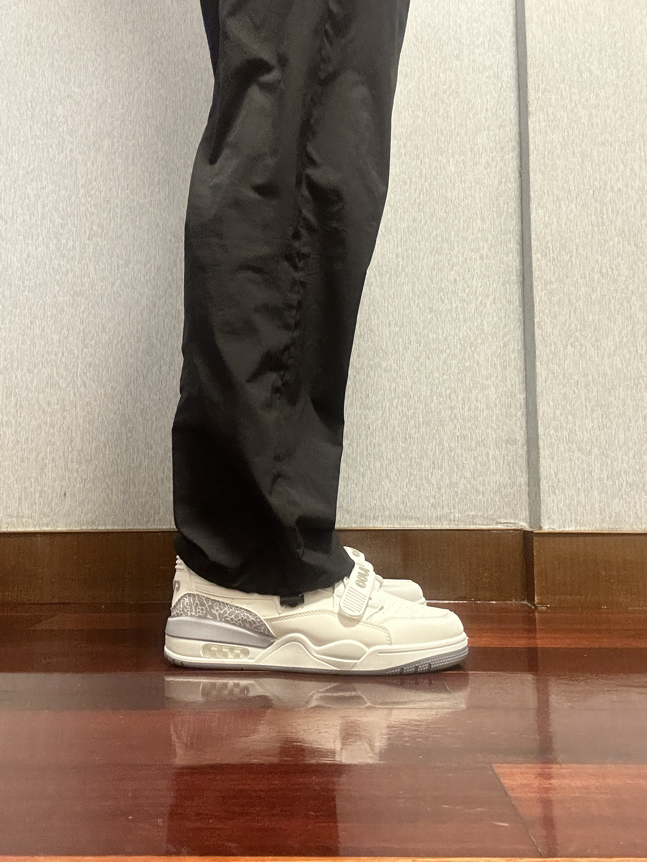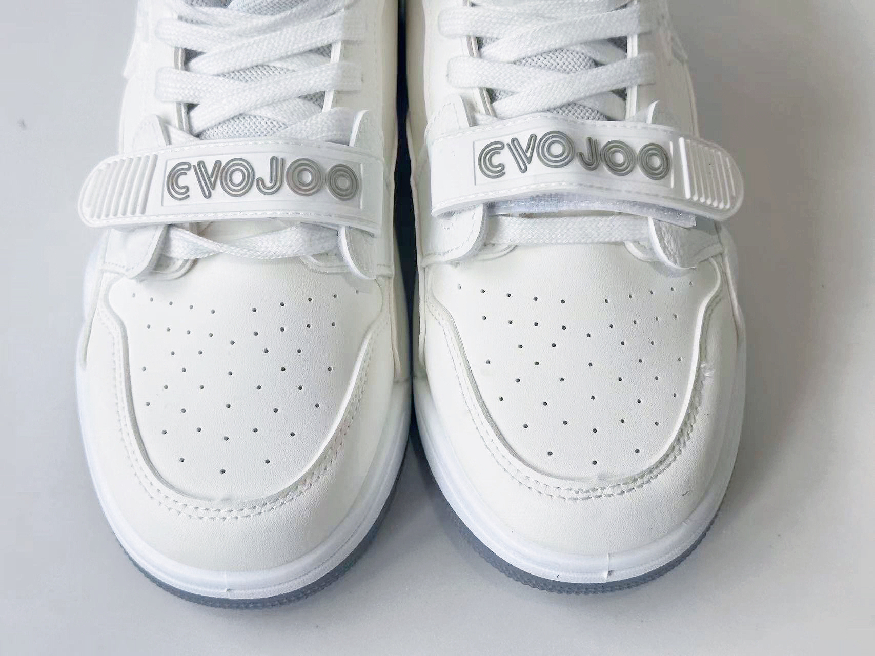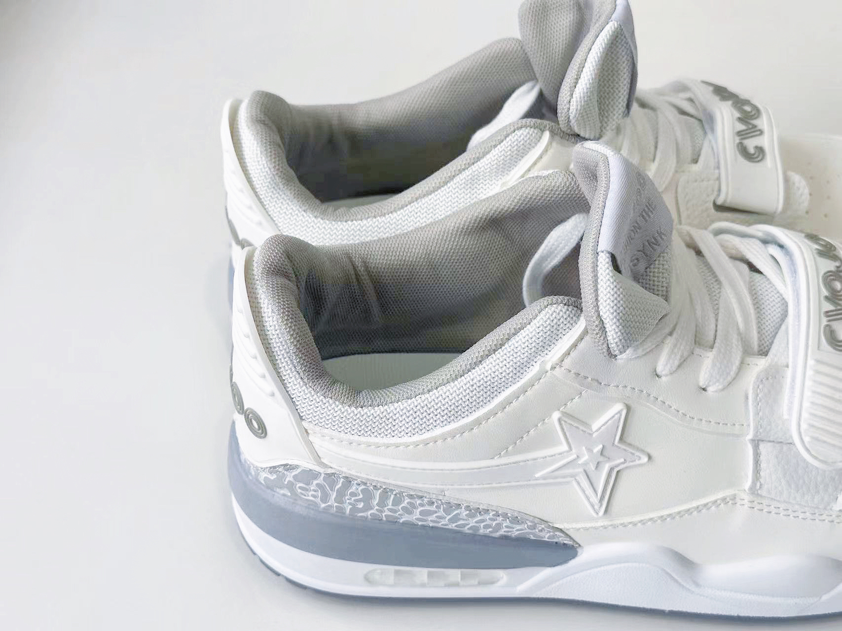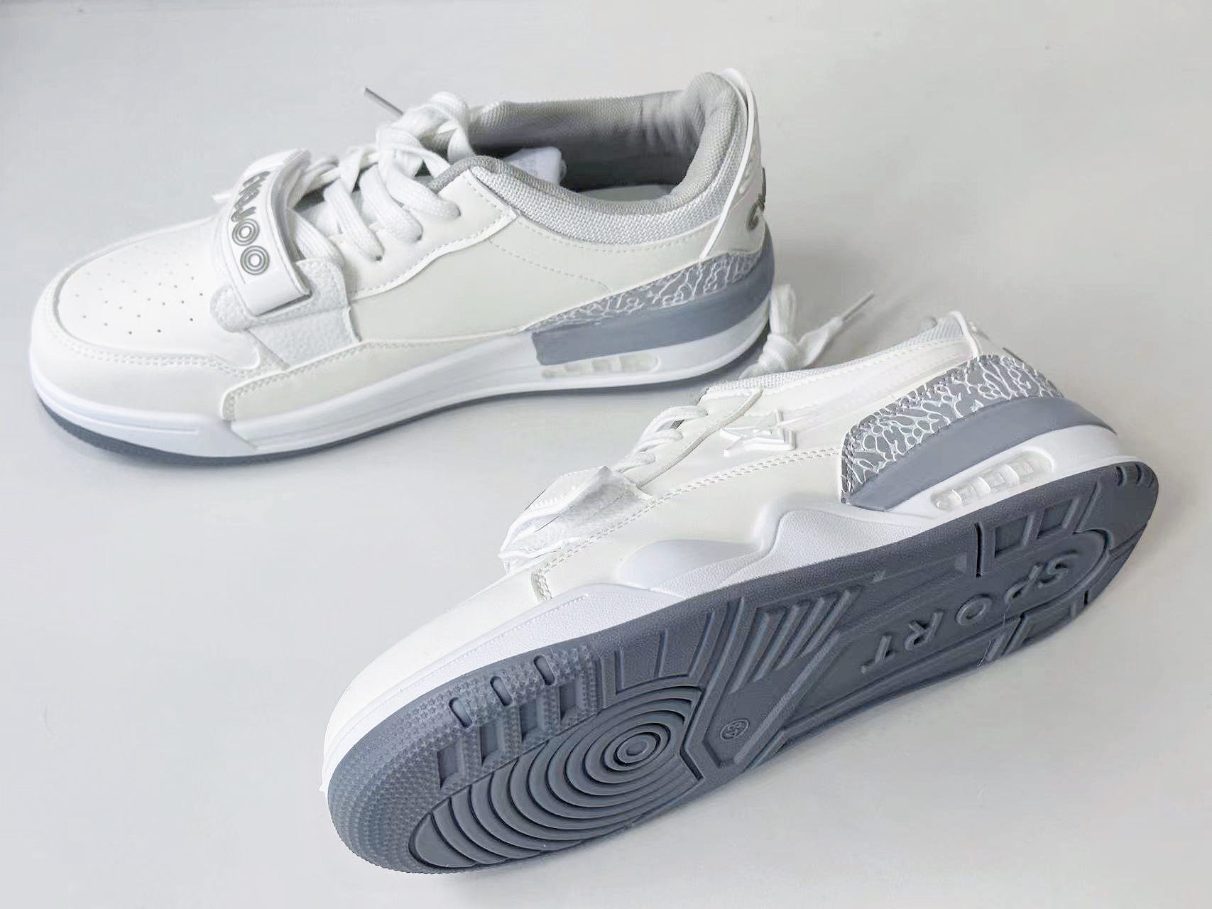 通体白色的鞋身与灰色爆裂纹的点缀让日常穿搭更加简单。 鞋身上的魔术贴很好的解决了宽窄脚型的问题。 鞋身通体采用了皮革材质,让鞋身更显气质。