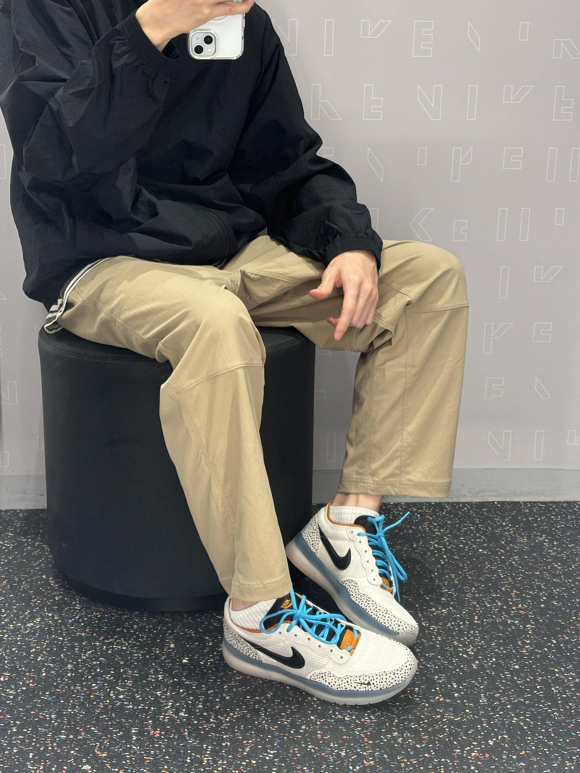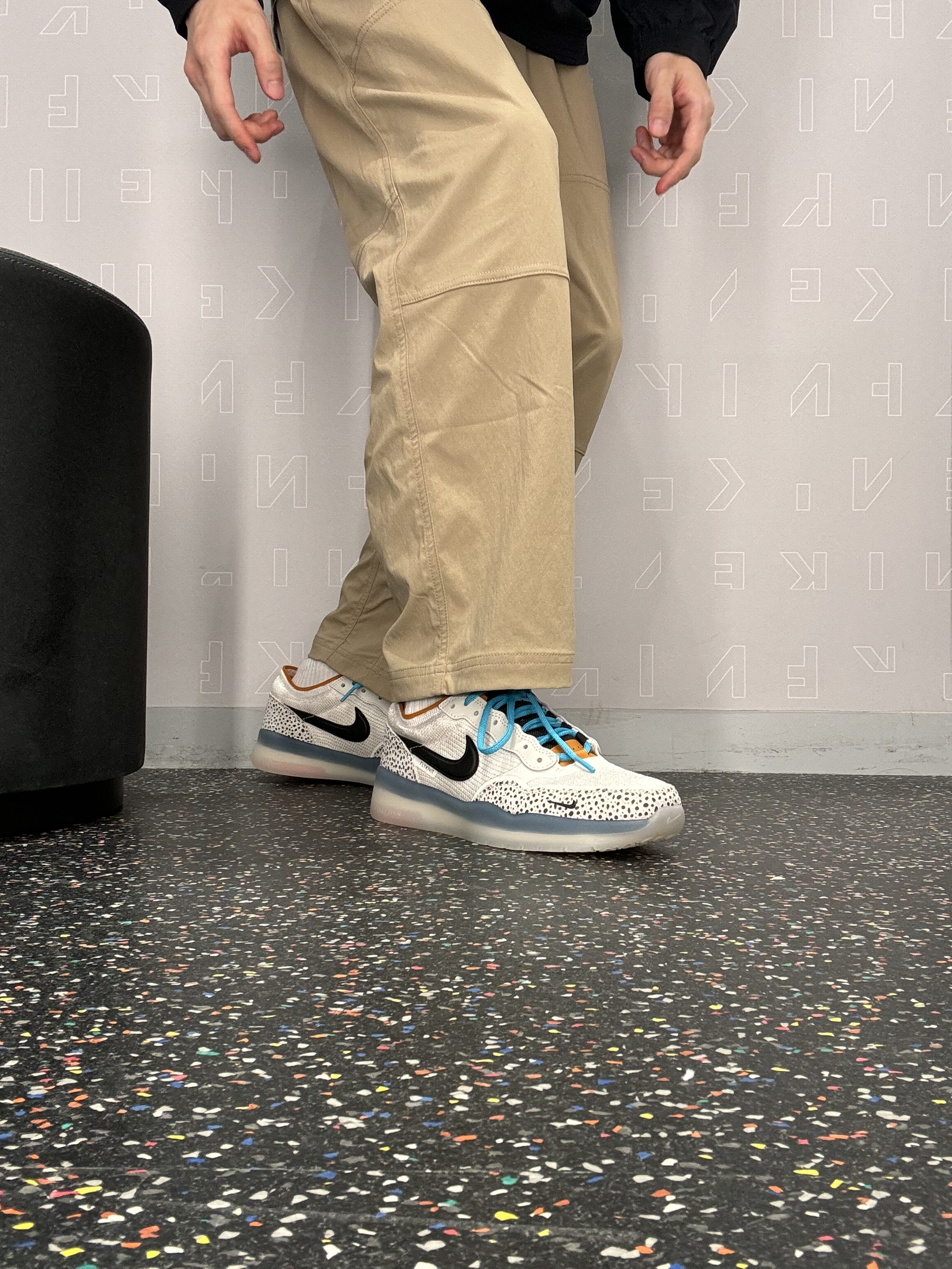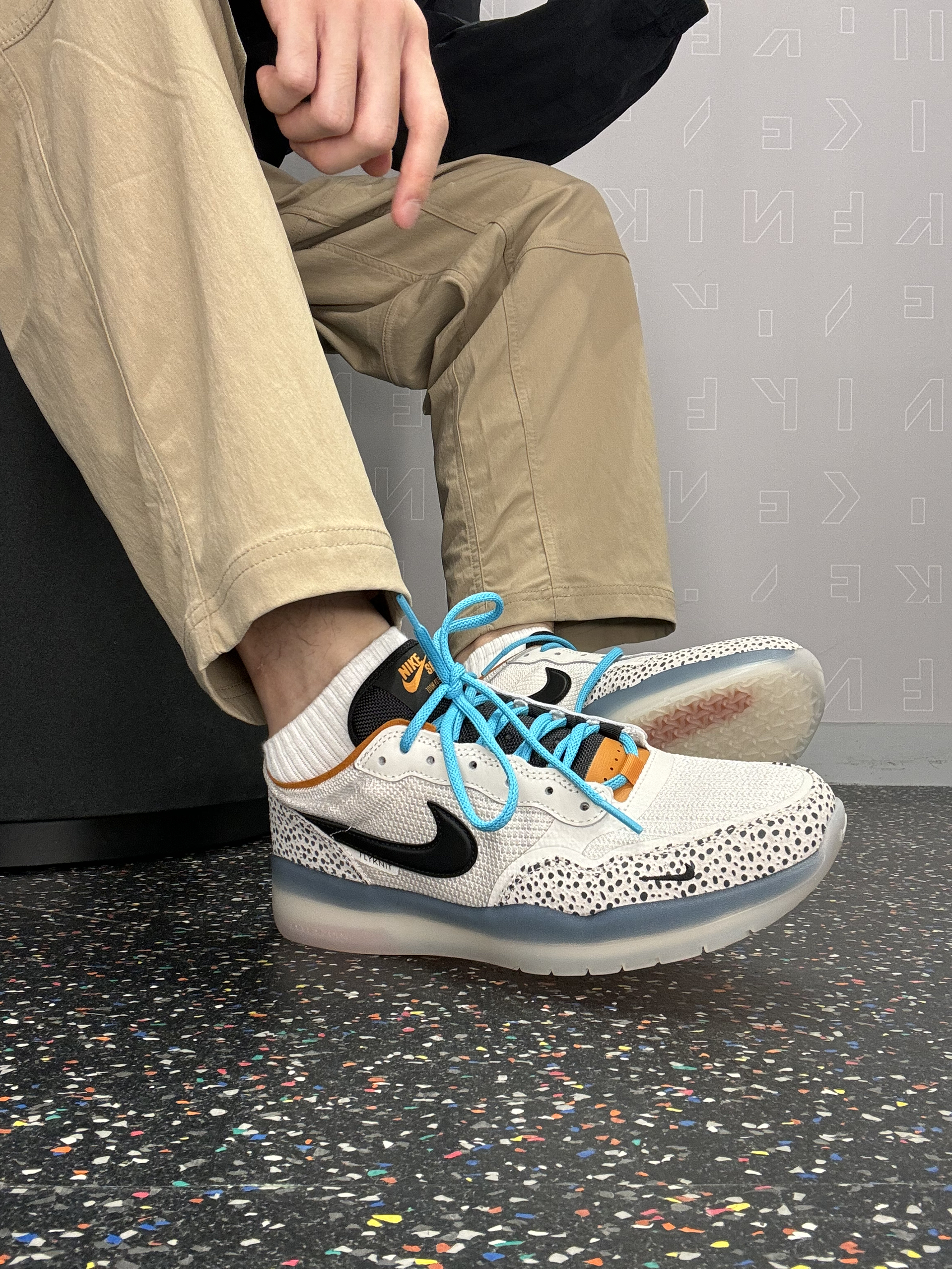 Nike sb家族又新添一成员ps8 首先咱们看他外观,映入眼帘的是它的水晶打底,鞋垫下方嵌入的zoom气垫也能清晰看见,鞋子有块大面积的tpu片来加强鞋子弯折刚性。再其次就是它类似豹纹又有点像泼墨的斑点设计,可能对密集恐惧症不太友好哦 鞋带一副蓝色一副黑色,搭配成鸳鸯鞋也蛮有特色呢