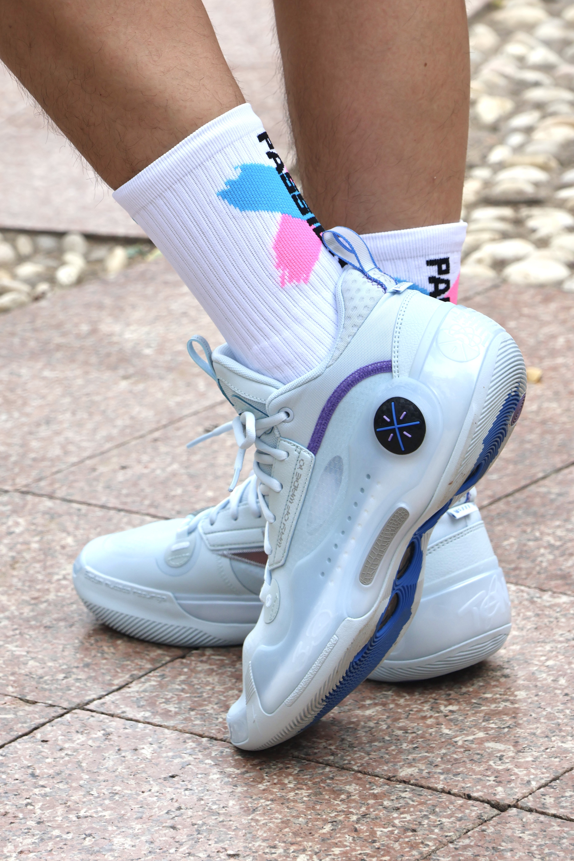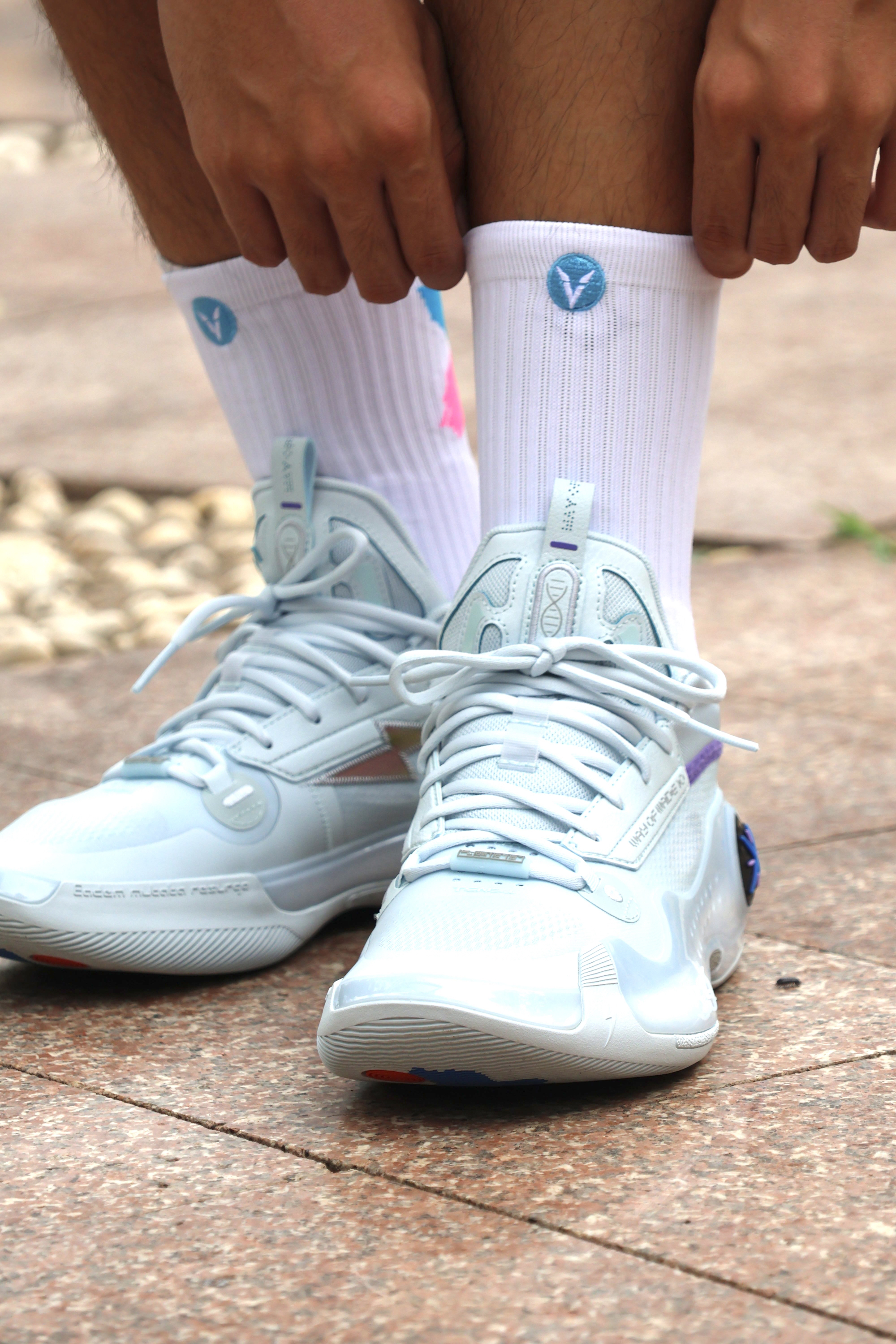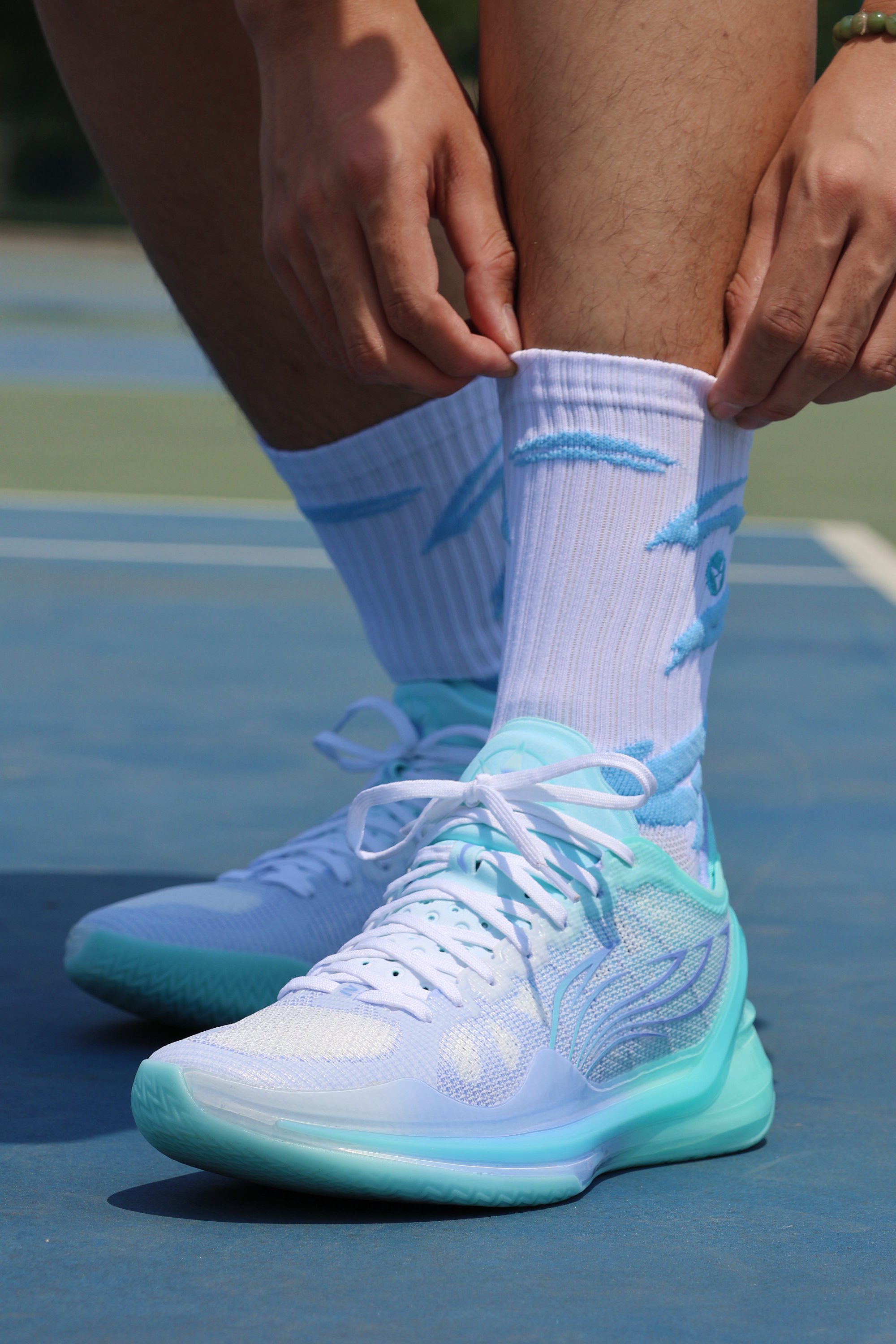 hello大家好~ 今天给大家分享的是蓝色系球袜搭配 鞋子👟 李宁 韦德之道10寒冰配色 袜子🧦 维动 VEIDOORN 撒野系列球袜 整体就是白蓝的拼接的经典搭配 球袜的性能也很在线包裹感和防滑纱都可 价格也比较适合学生喔~