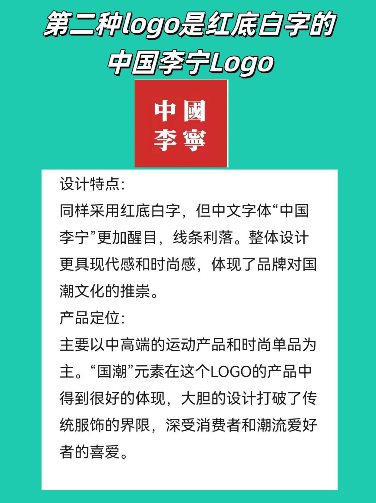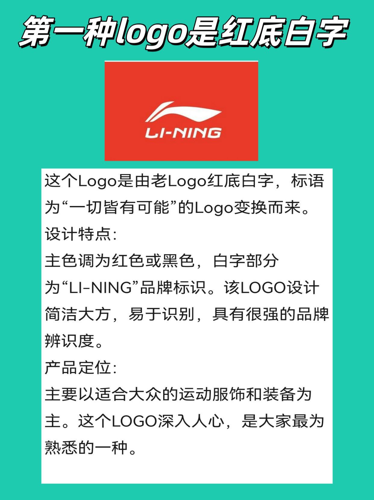1. 经典LOGO(红底白字/黑底白字) 设计特点: 主色调为红色或黑色,白字部分为“LI-NING”品牌标识。 该LOGO设计简洁大方,易于识别,具有很强的品牌辨识度。 产品定位: 主要以适合大众的运动服饰和装备为主。 这个LOGO深入人心,是大家最为熟悉的一种。 2. 中国李宁LOGO 设计特点: 同样采用红底白字,但中文字体“中国李宁”更加醒目,线条利落。 整体设计更具现代感和时尚感,体现了...