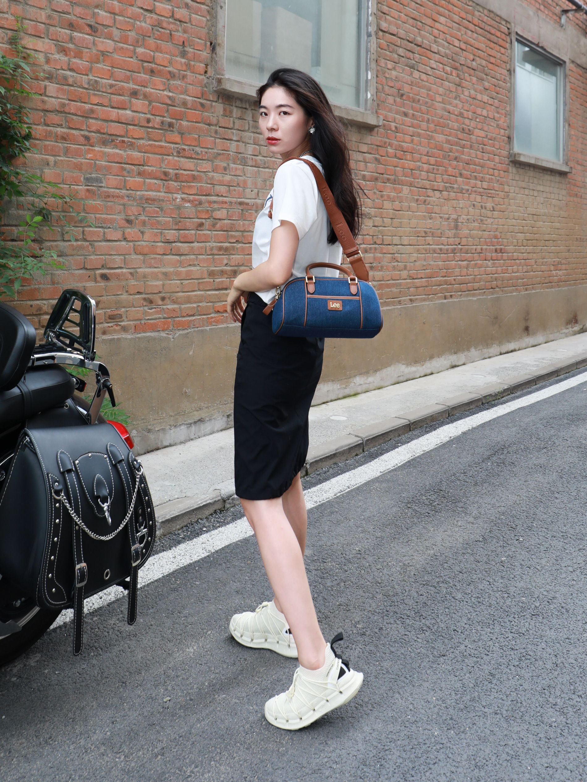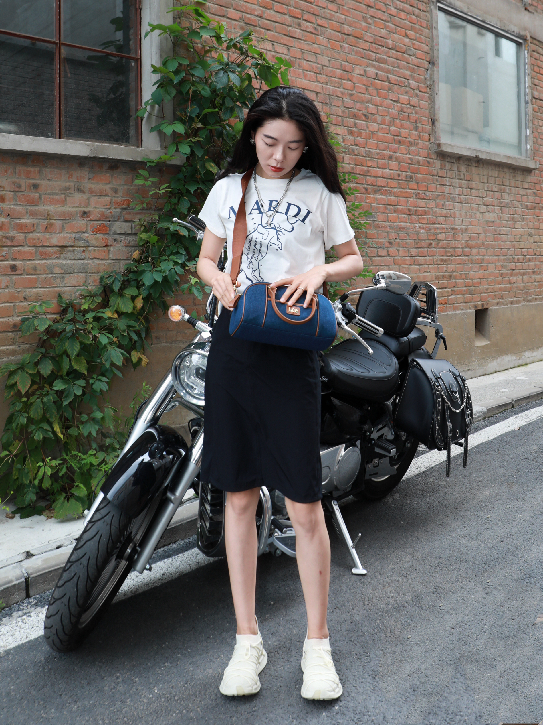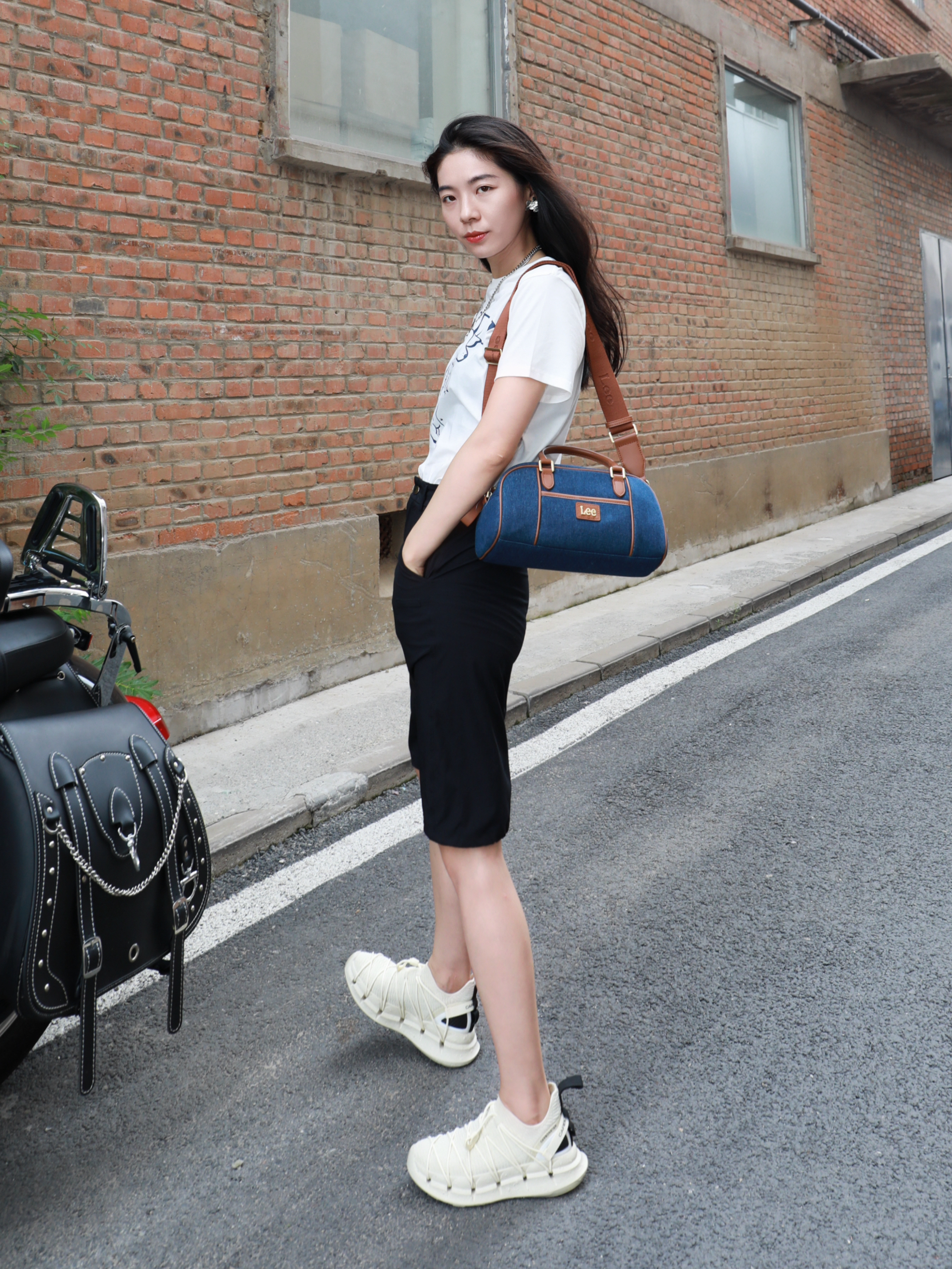 今天是一套很松弛的穿搭~ 在炎热的夏天,视觉降温一下 整体选择是黑➕深蓝➕白色 看上去很清冷的感觉✌️ Lee家的竹节宝,牛仔色~ 真的很适合学院风或者出游去背! 斜挎手提都是不错~既能凹造型又能装 衣服的选择是简单的白色的印花 MARDI MERCREDI家的腊肠狗啊哈哈好可爱 鞋子来自CARBONSTAR SKIN家的 跑鞋透气很舒服😌 夏天~舒服才是王道✌️ 今天这套又酷又帅