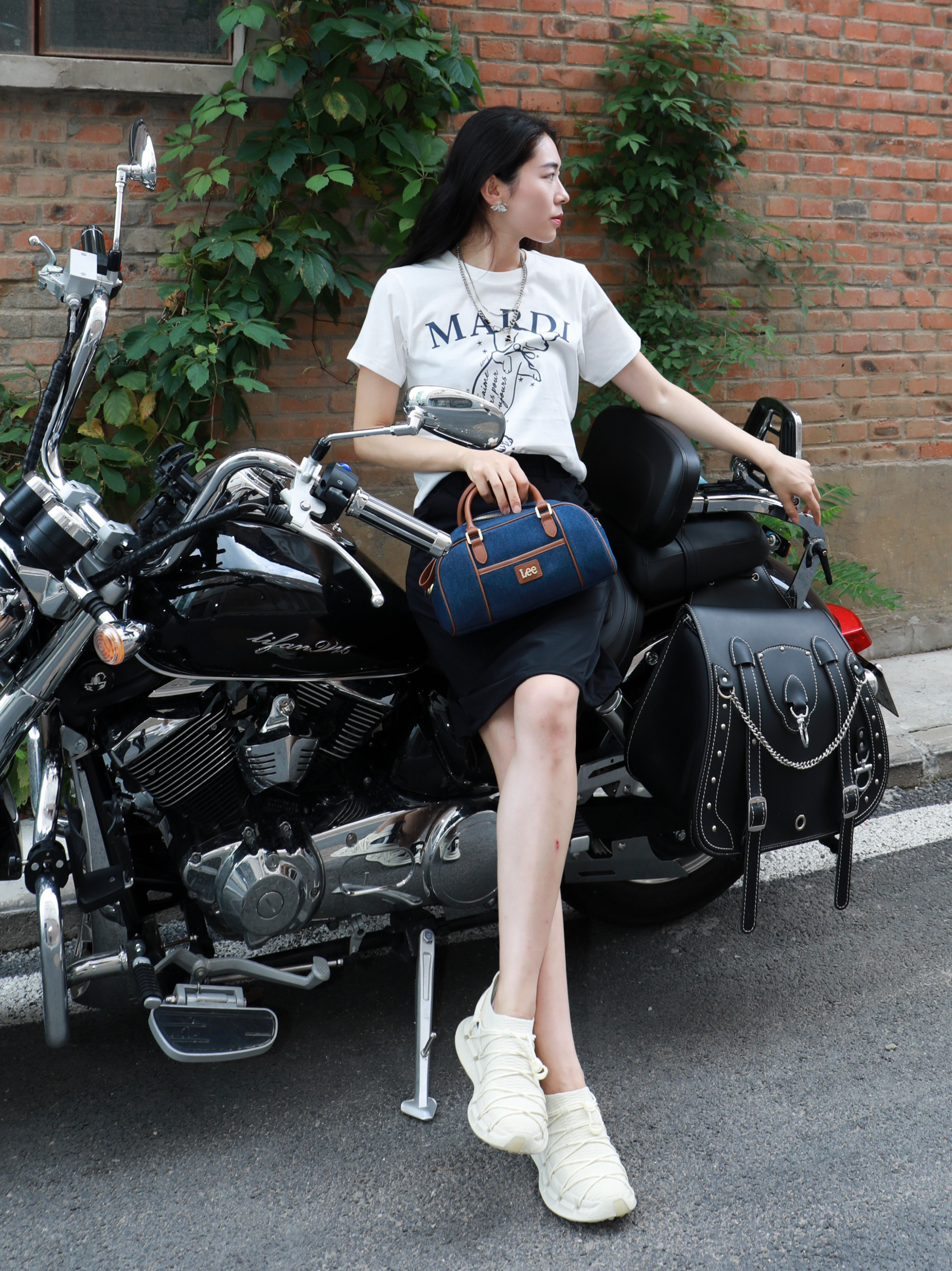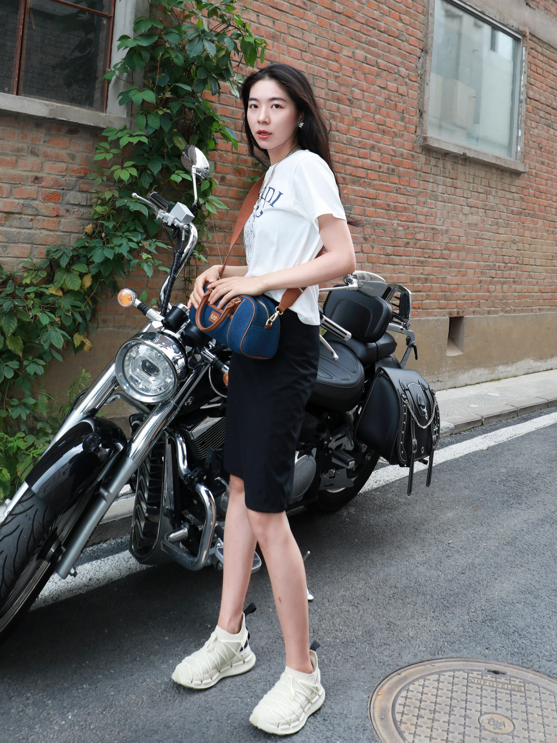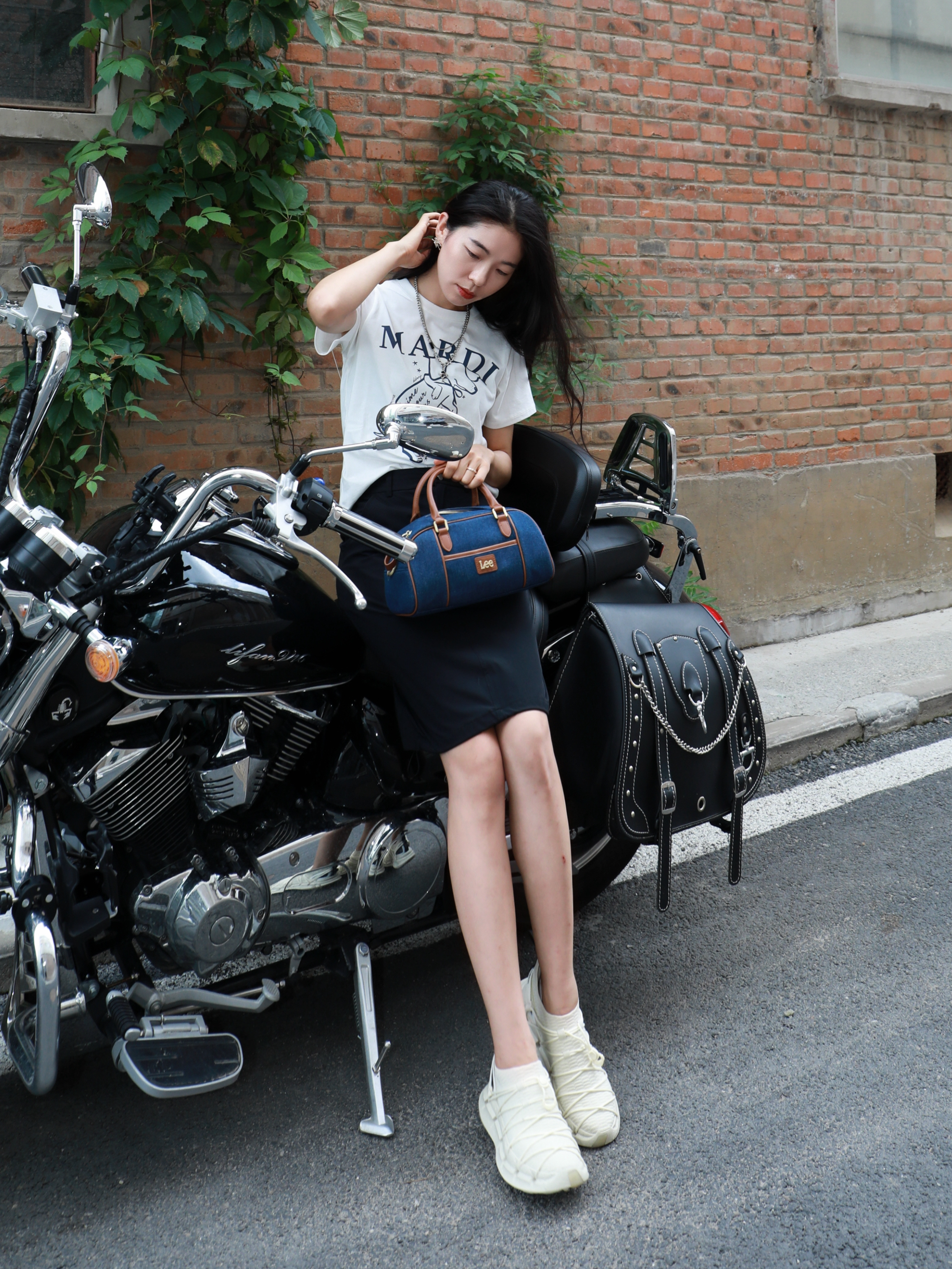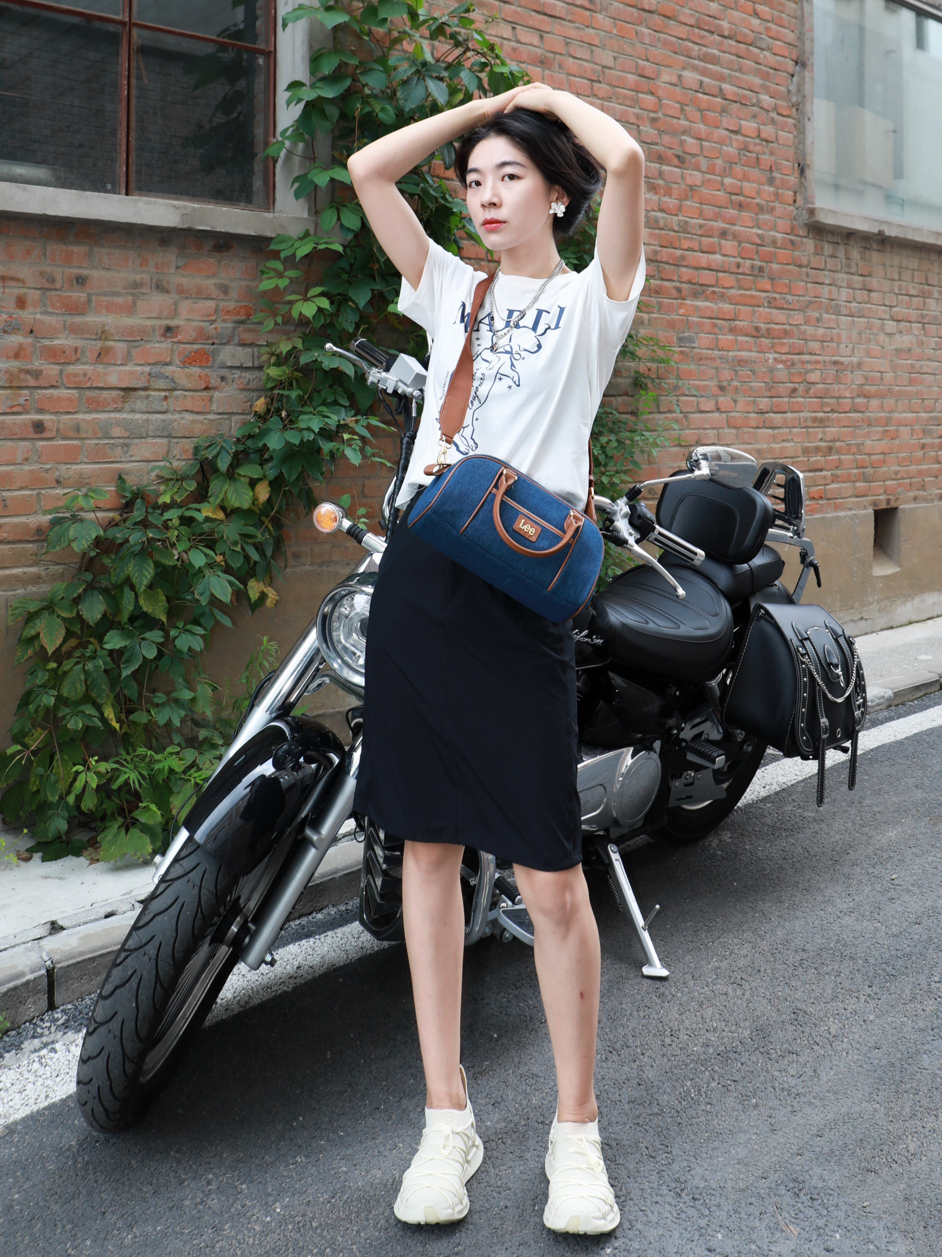 今天是一套很松弛的穿搭~ 在炎热的夏天,视觉降温一下 整体选择是黑➕深蓝➕白色 看上去很清冷的感觉✌️ Lee家的竹节宝,牛仔色~ 真的很适合学院风或者出游去背! 斜挎手提都是不错~既能凹造型又能装 衣服的选择是简单的白色的印花 MARDI MERCREDI家的腊肠狗啊哈哈好可爱 鞋子来自CARBONSTAR SKIN家的 跑鞋透气很舒服😌 夏天~舒服才是王道✌️ 今天这套又酷又帅