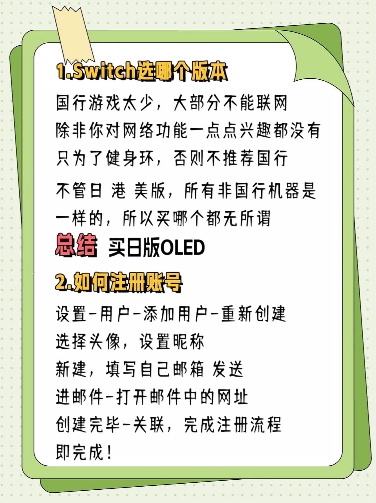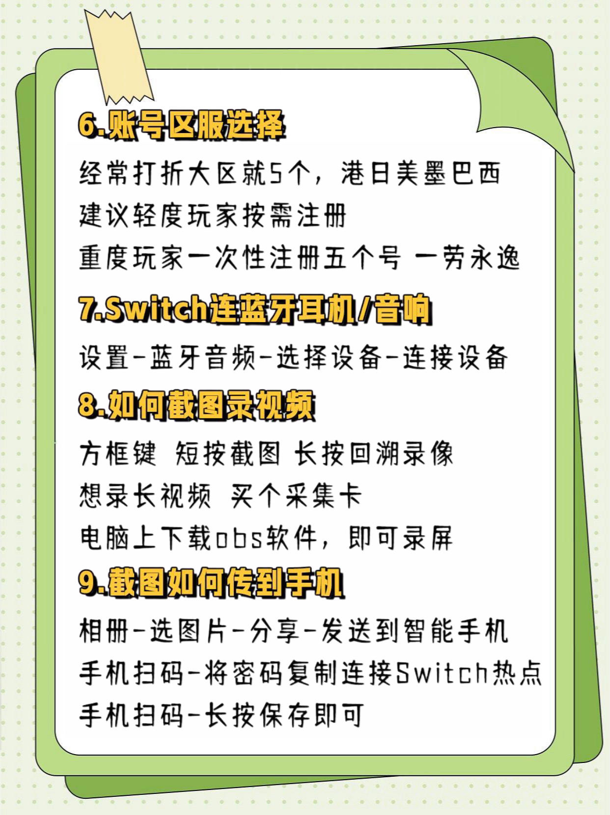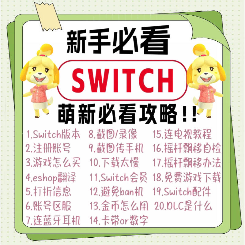 一篇文章说明Switch的一切 🌟 给你讲清Switch的一切,再不吃灰 💖 请关注我!移步主页-收藏-swit教程 📢 篇幅有限,内容只能略写,更多的移步到我主页 1⃣ Switch选哪个版本 2⃣ 如何注册账号 3⃣ 数字游戏怎么买 4⃣ 看不懂怎么办 5⃣ 游戏打折信息哪里查 6⃣ 账号区服怎么选 7⃣ 如Switch连接蓝牙耳机/音响 8⃣ 如何截图录视频 9⃣ 截图如何传到手机 1⃣0⃣...