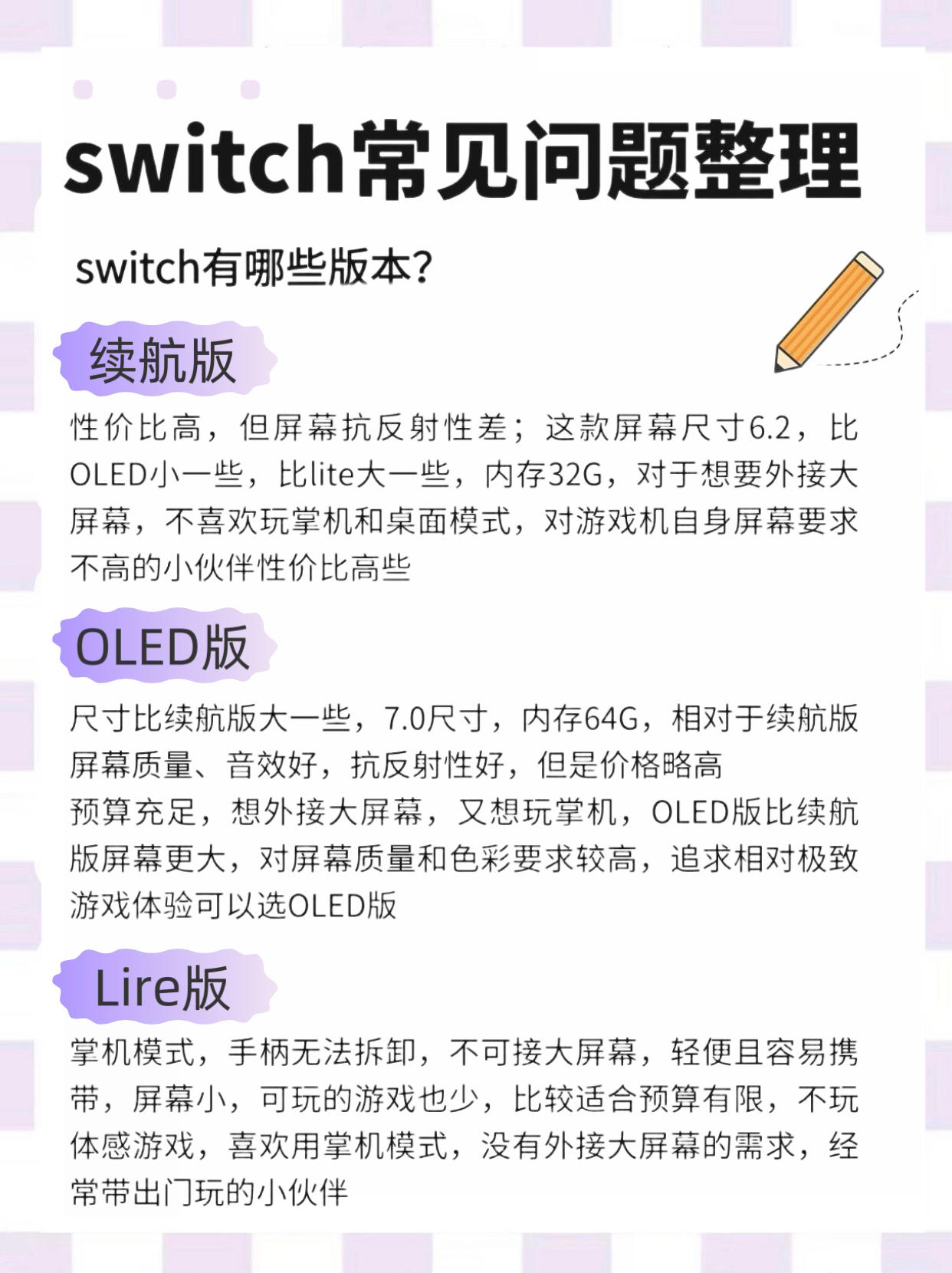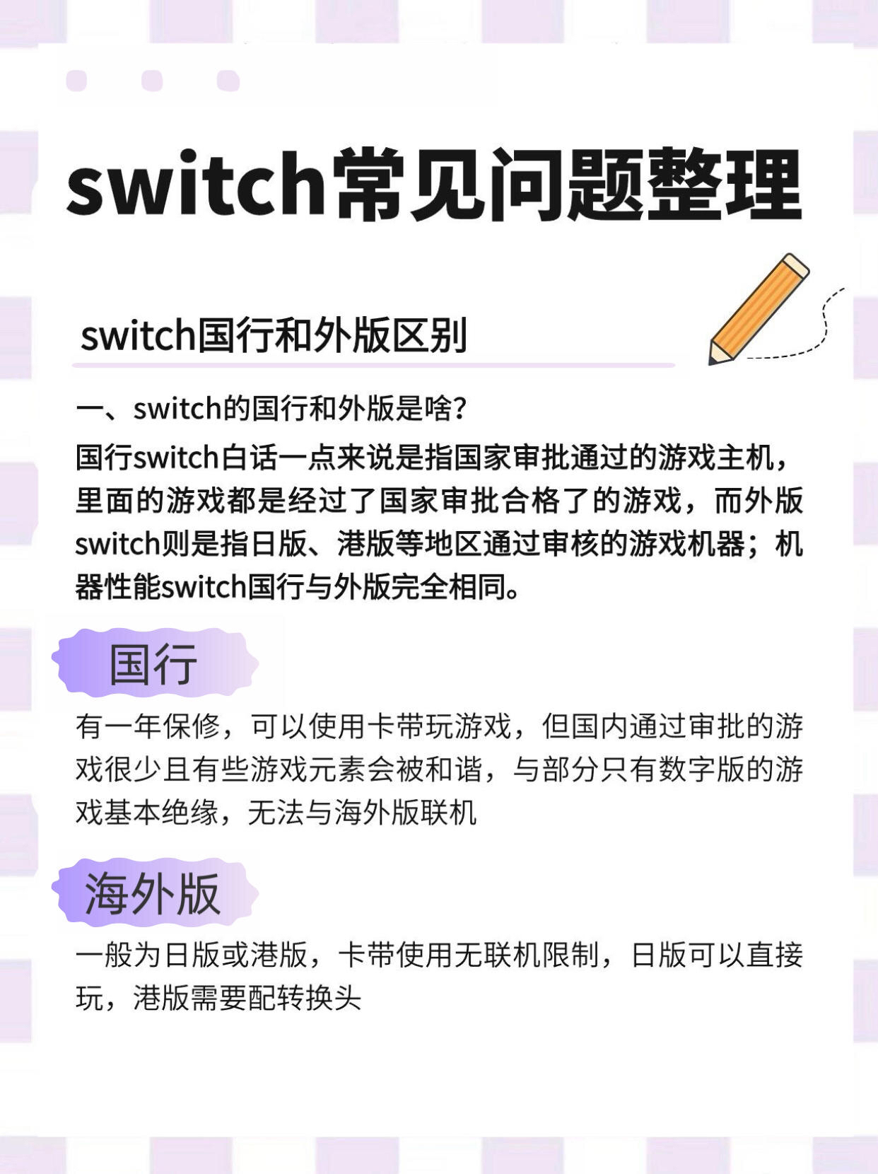 🔥Switch常见问题整理 1️⃣switch国行和外版区别 ✅国行 有一年保修,可以使用卡带玩游戏,但国内通过审批的游戏很少且有些游戏元素会被和谐,与部分只有数字版的游戏基本绝缘,无法与海外版联机 ✅海外版 一般为日版或港版,卡带使用无联机限制,日版可以直接玩,港版需要配转换头 2️⃣switch有哪些版本? Switch续航版、OLED、Lite版选哪个? ✅续航版 性价比高,但屏幕抗反射性差...