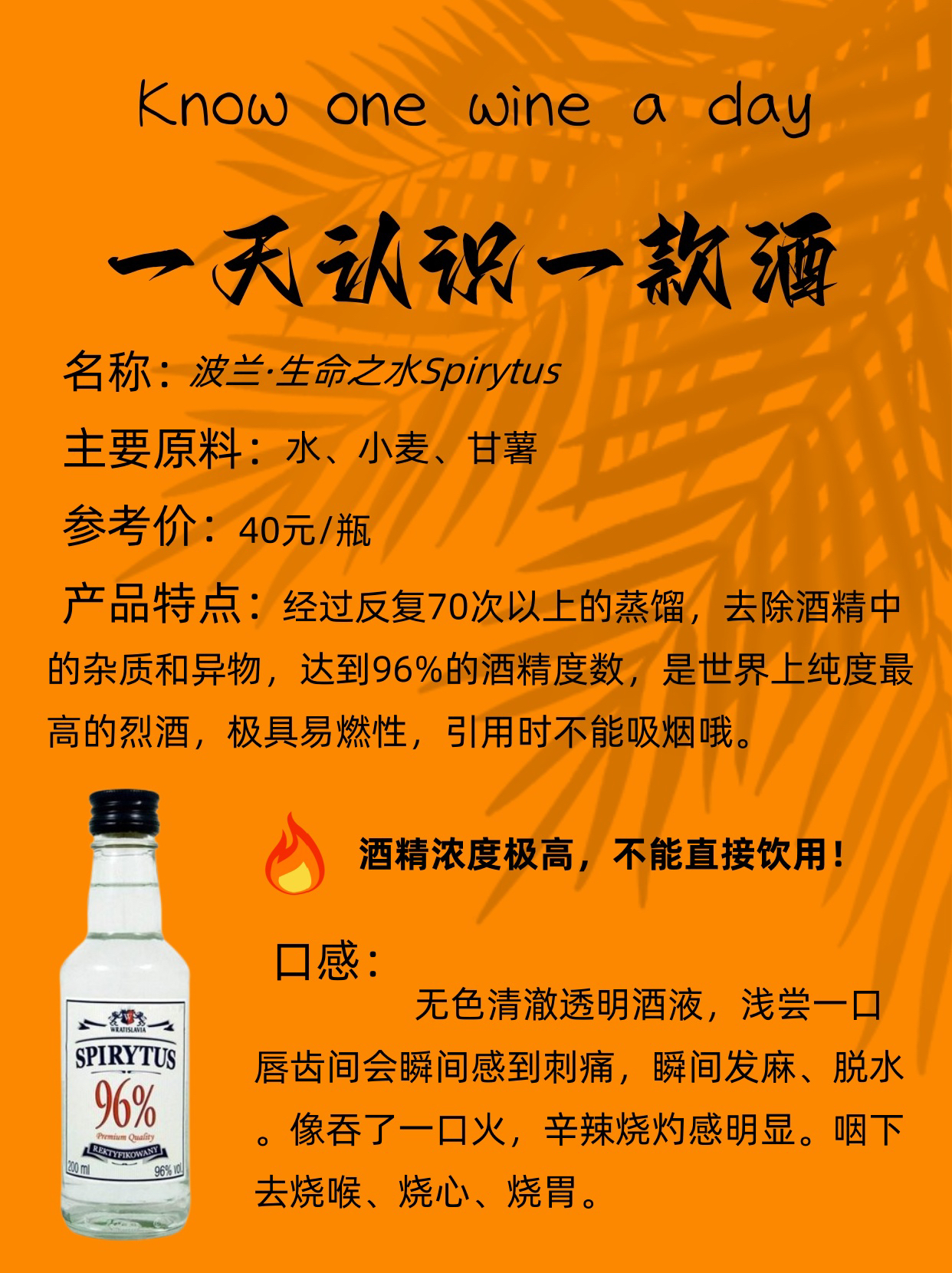 🍻生命之水Spirytus🍻 · ⭐️酒精浓度极高,不要直接饮用哦 · 产地:波兰🇵🇱 度数:96%vol🍺 容量:500ml🧊 类型:蒸馏酒 参考价格:40元/瓶 · 产品特点: 经过反复70次以上的蒸馏,去除酒精中的杂质和异物,达到96%的酒精度数,是世界上纯度最高的烈酒,极具易燃性🔥,引用时不要抽烟哦~ · 口感: 五色清澈透明酒液,浅尝一口唇齿间会瞬间感到刺痛,瞬间发麻、脱水。像吞了一口火...