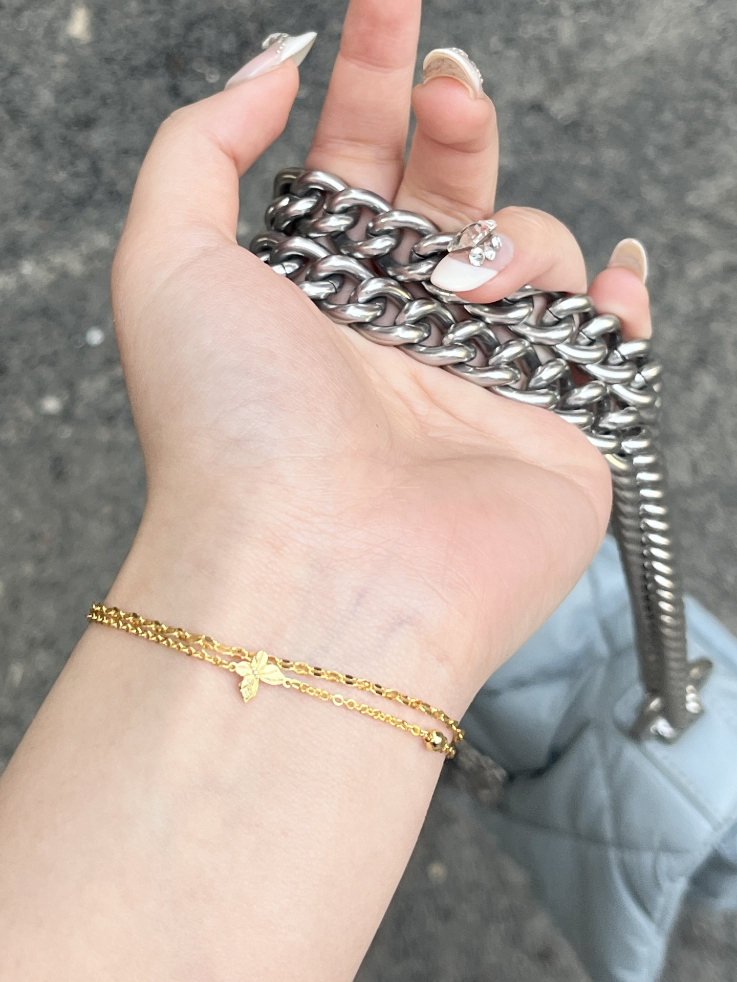 💭中国黄金 CHINA GOLD 满天星手链5G工艺足金 按克计价 黄金手链 女款 💭手链很细,链子有片状的,不同角度看不一样,具体可以看图片。个人更喜欢前面发的手链