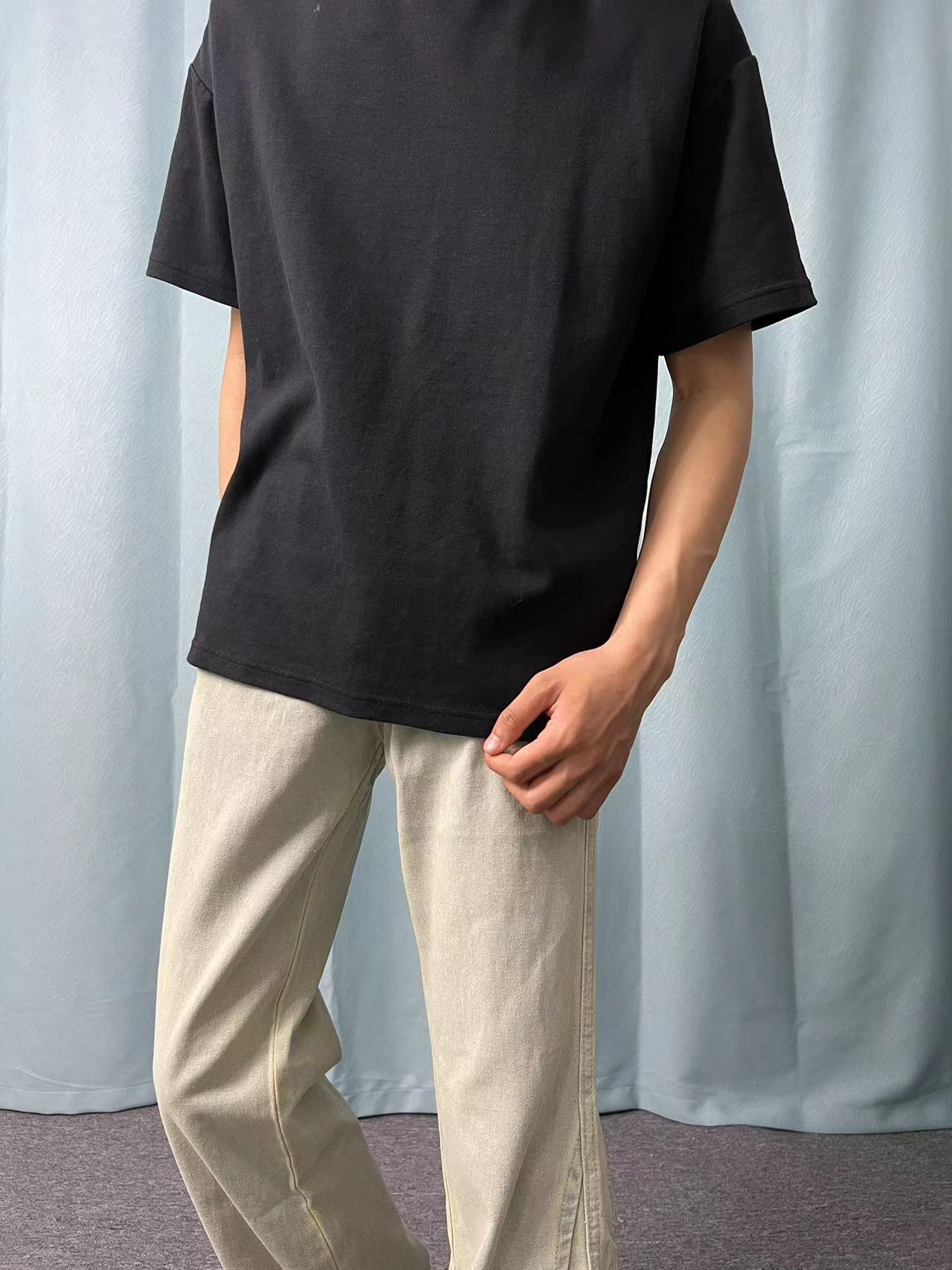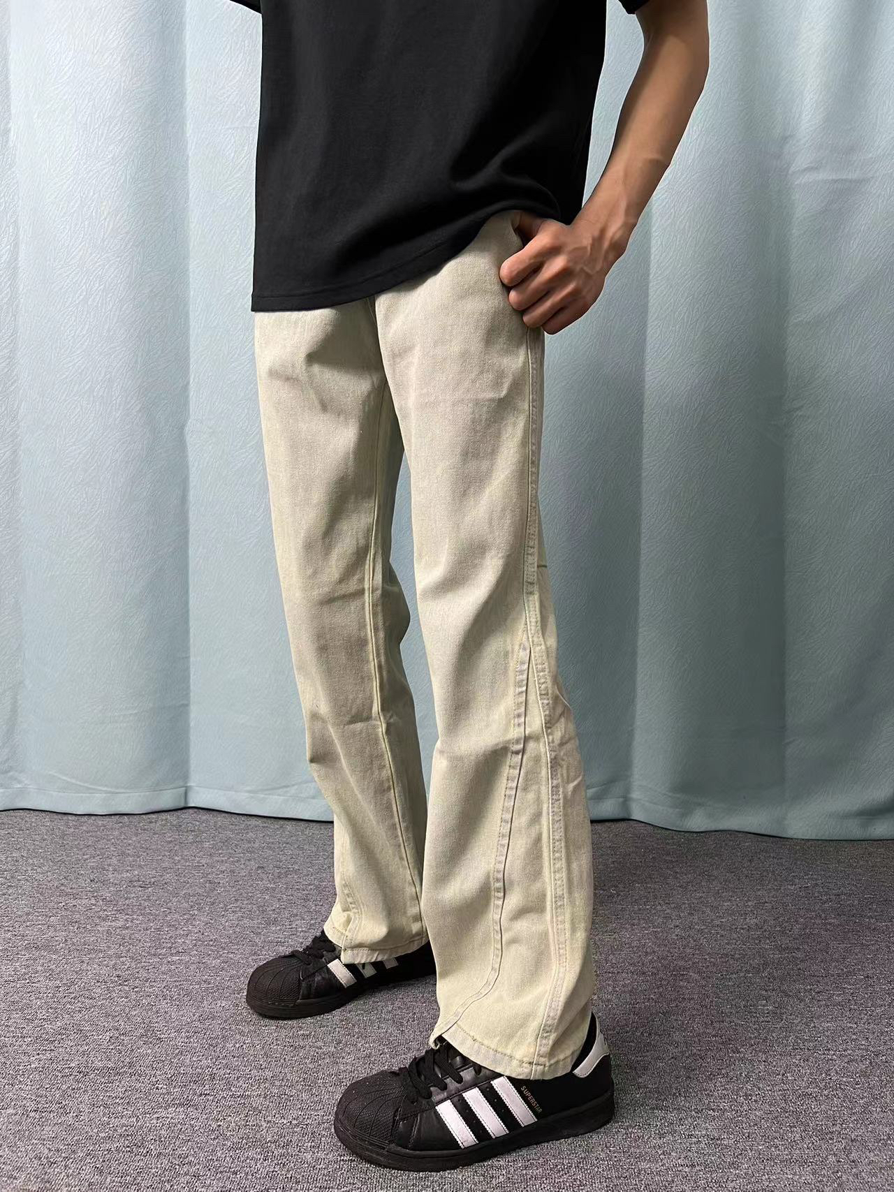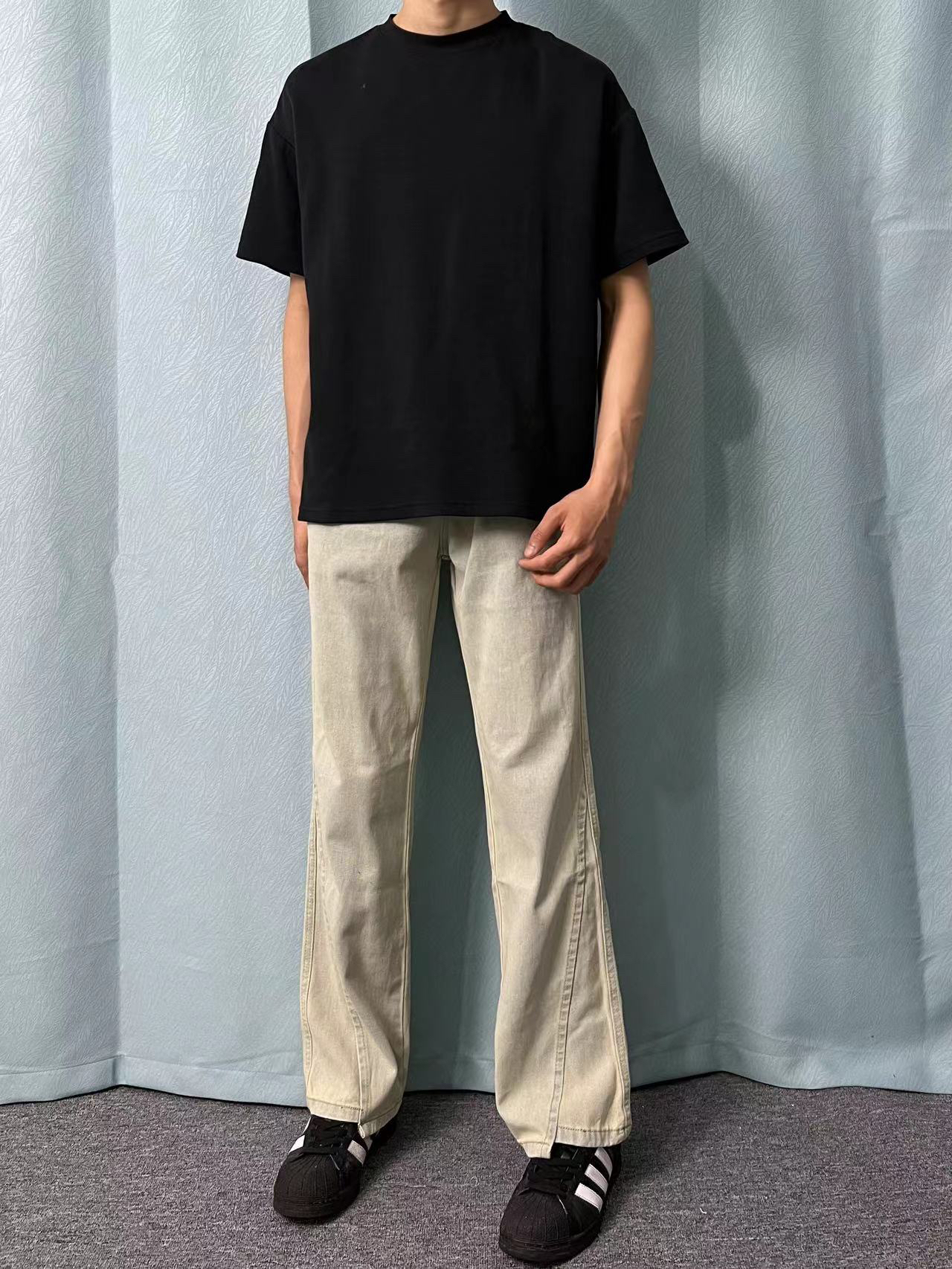 今日上身一款黑色短袖 版型宽松舒适,面料柔软透气纯黑色,百搭好看 搭配一条黄色牛仔裤 直筒版型,面料亲肤上身修饰腿型,非常显高黄色款式百搭,穿搭必备单品! 鞋子搭配一款阿迪达斯板鞋 上脚舒适柔软,黑色百搭好看!