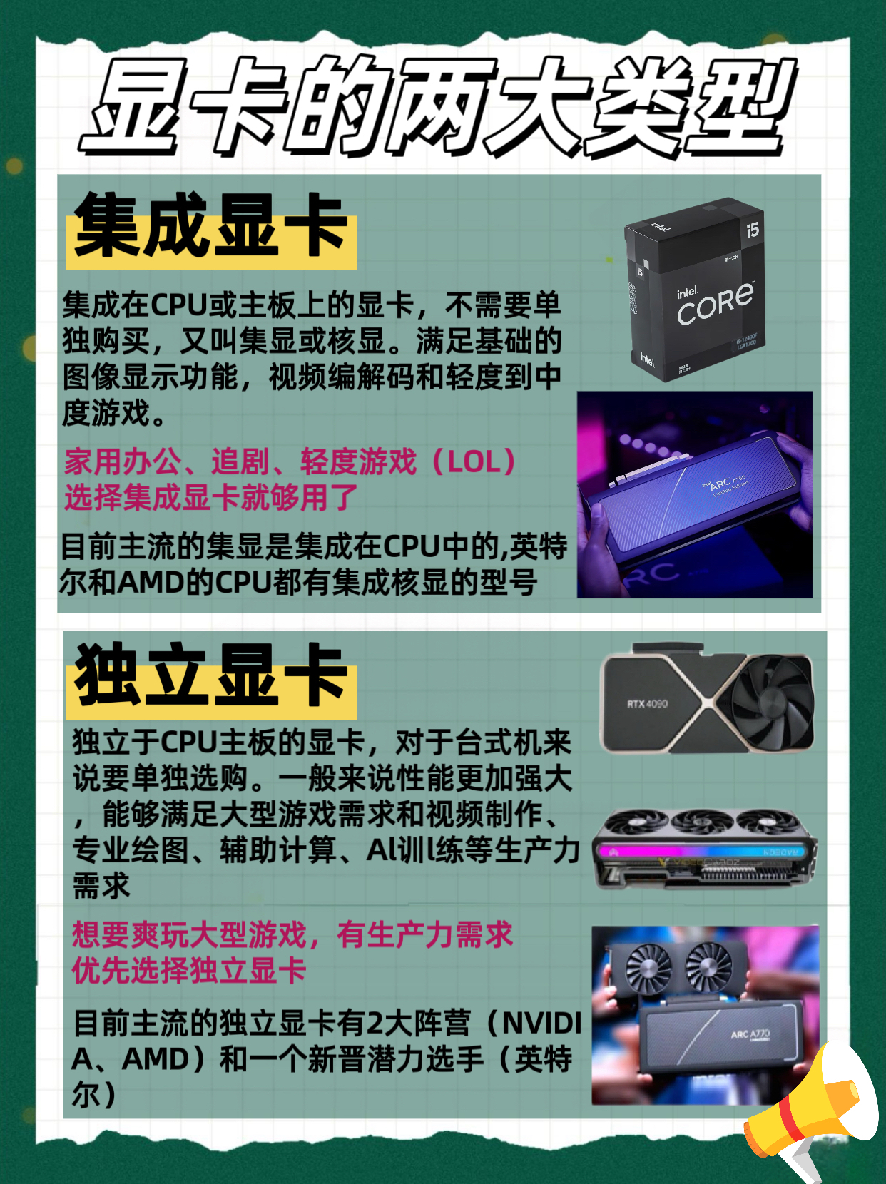 显卡分为集成显卡和独立显卡,家用办公电脑选择集成显卡足矣