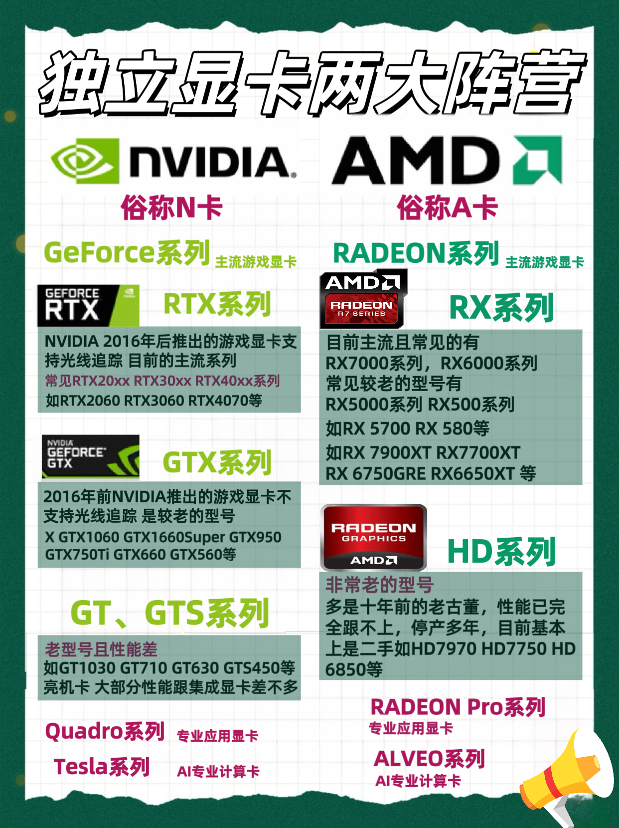 独立显卡分为两大阵营:NVIDIA和AMD,也就是我们常说的N卡和A卡