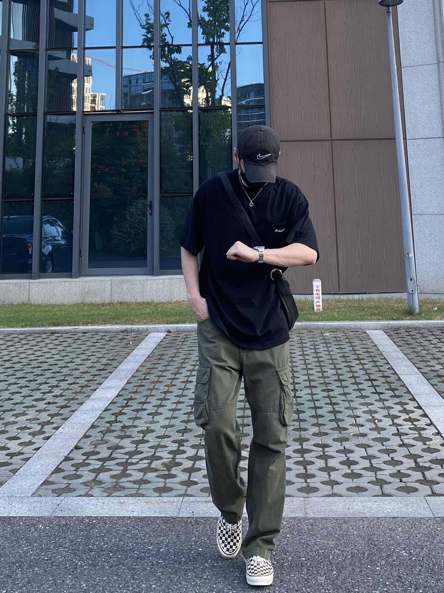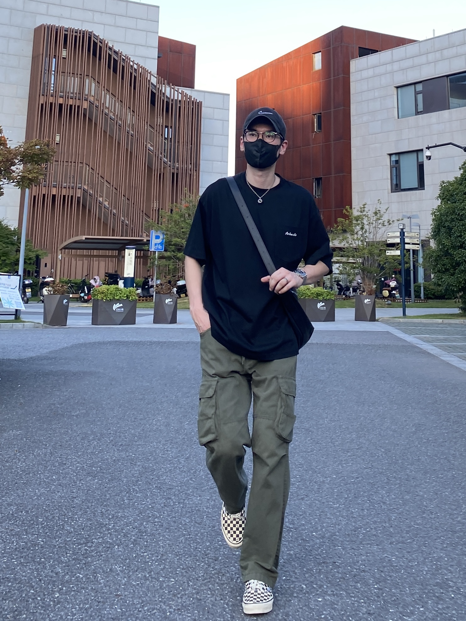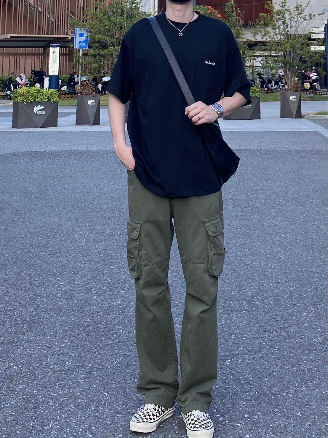 今天这套上衣穿了一件黑色宽松阔版背后字母刺绣印花圆领T恤 ⬇️ 裤子选择不挑腿型的军绿色直筒水洗做旧多口袋工装裤 ⬇️ 鞋子上脚经典百搭的vans棋盘格 ⬇️ 最后背一个精致的大容量皮质斜挎包 - 今日搭配 衣服裤子都来自:NICE LILI 鞋子:VANS棋盘格