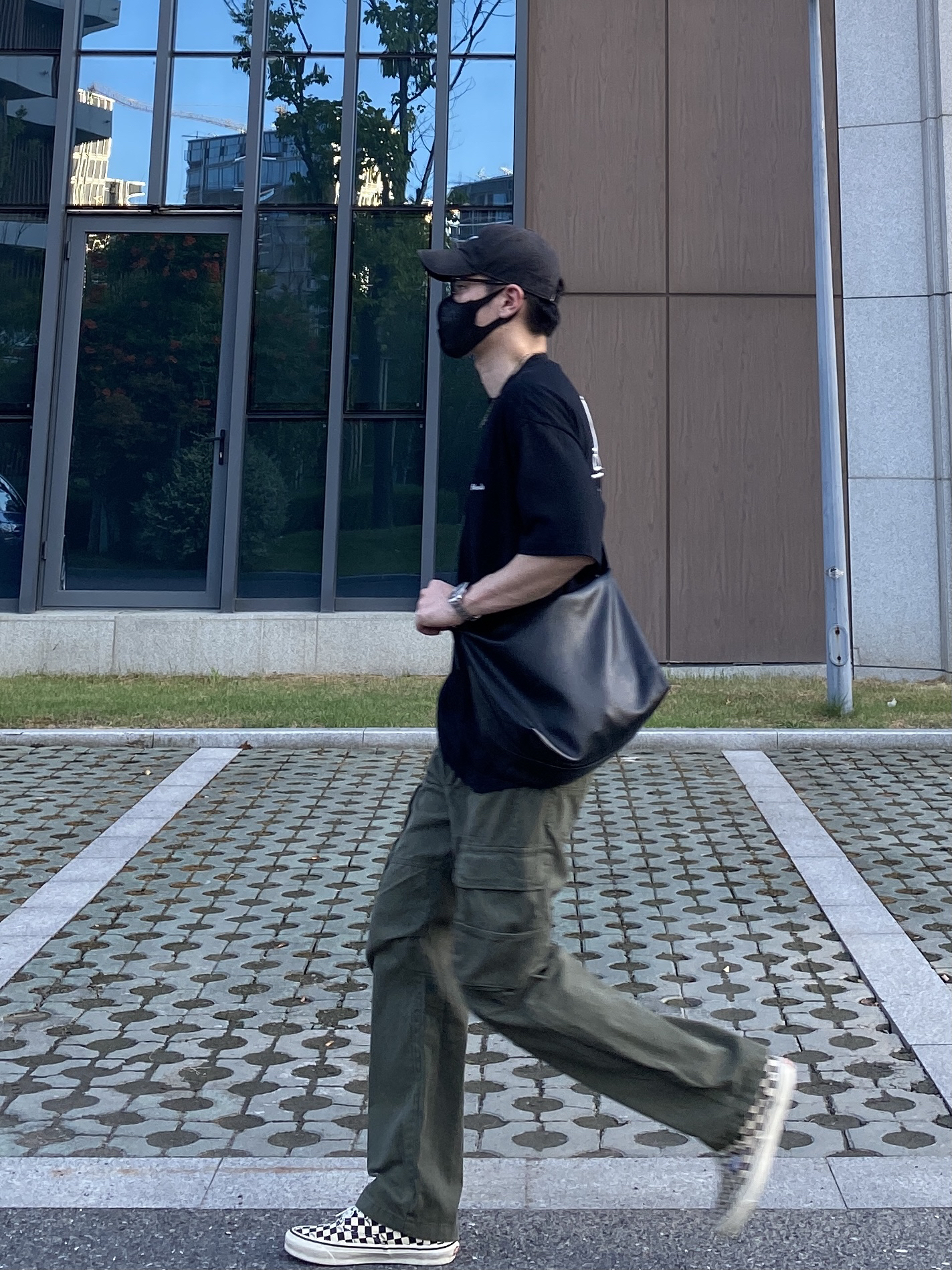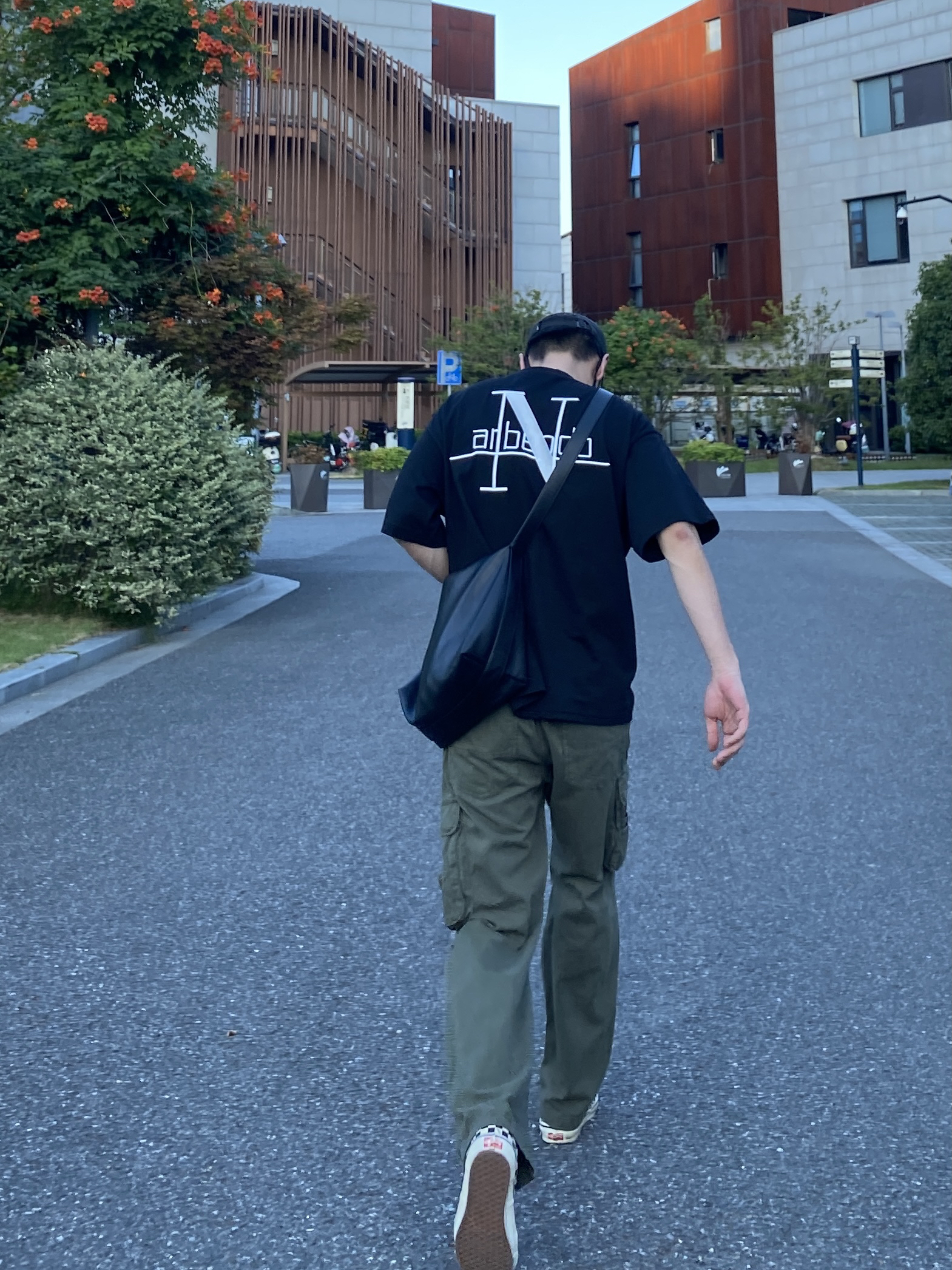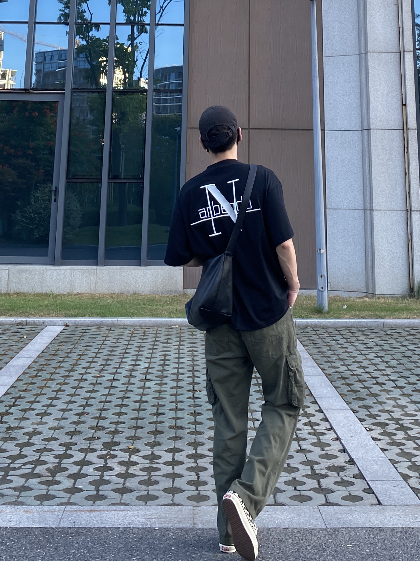 今天这套上衣穿了一件黑色宽松阔版背后字母刺绣印花圆领T恤 ⬇️ 裤子选择不挑腿型的军绿色直筒水洗做旧多口袋工装裤 ⬇️ 鞋子上脚经典百搭的vans棋盘格 ⬇️ 最后背一个精致的大容量皮质斜挎包 - 今日搭配 衣服裤子都来自:NICE LILI 鞋子:VANS棋盘格