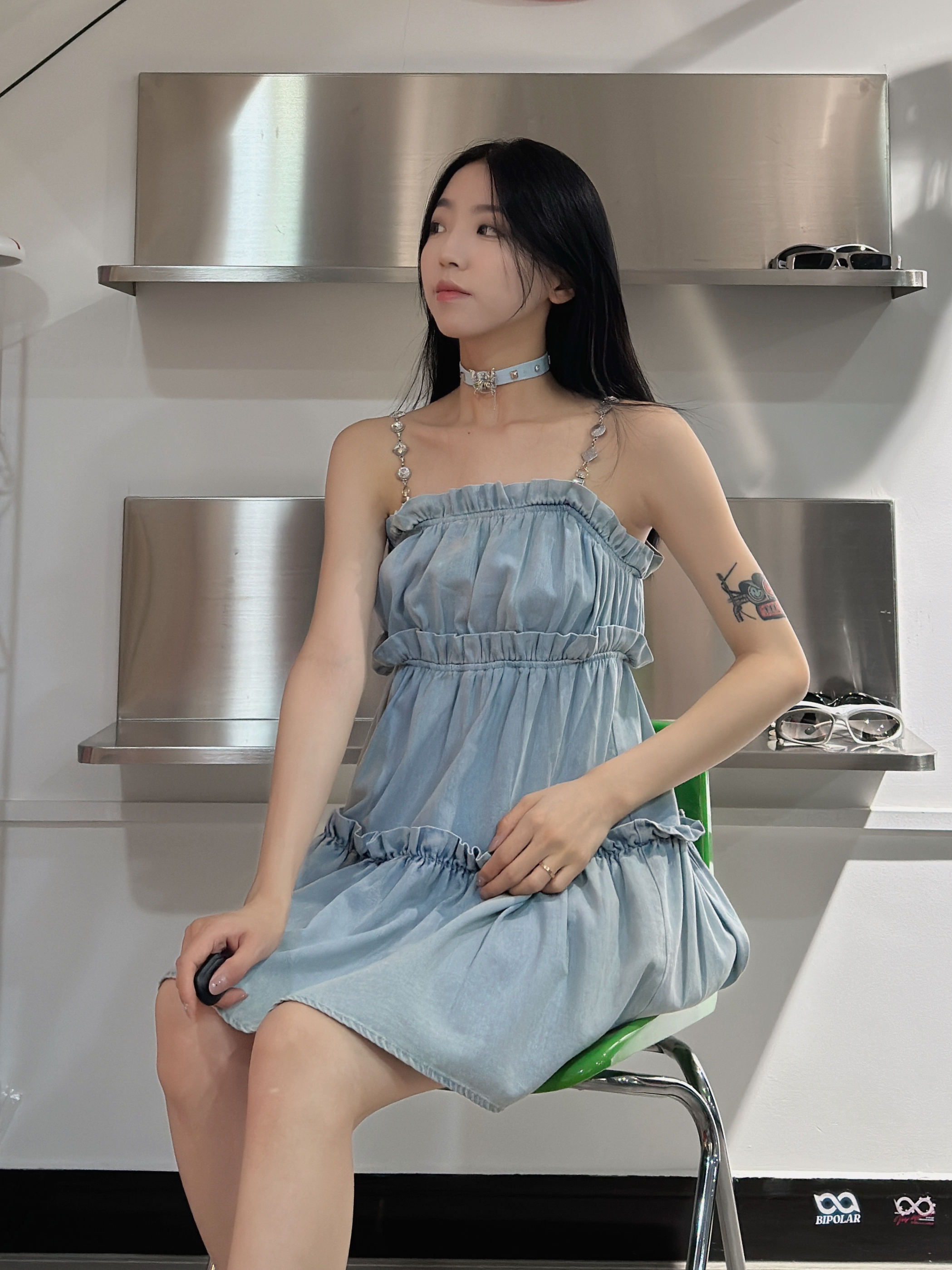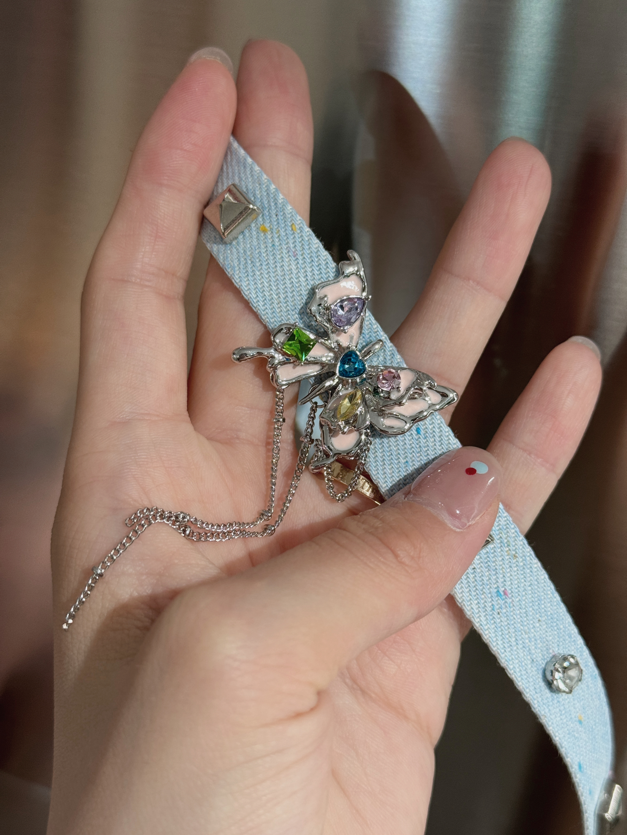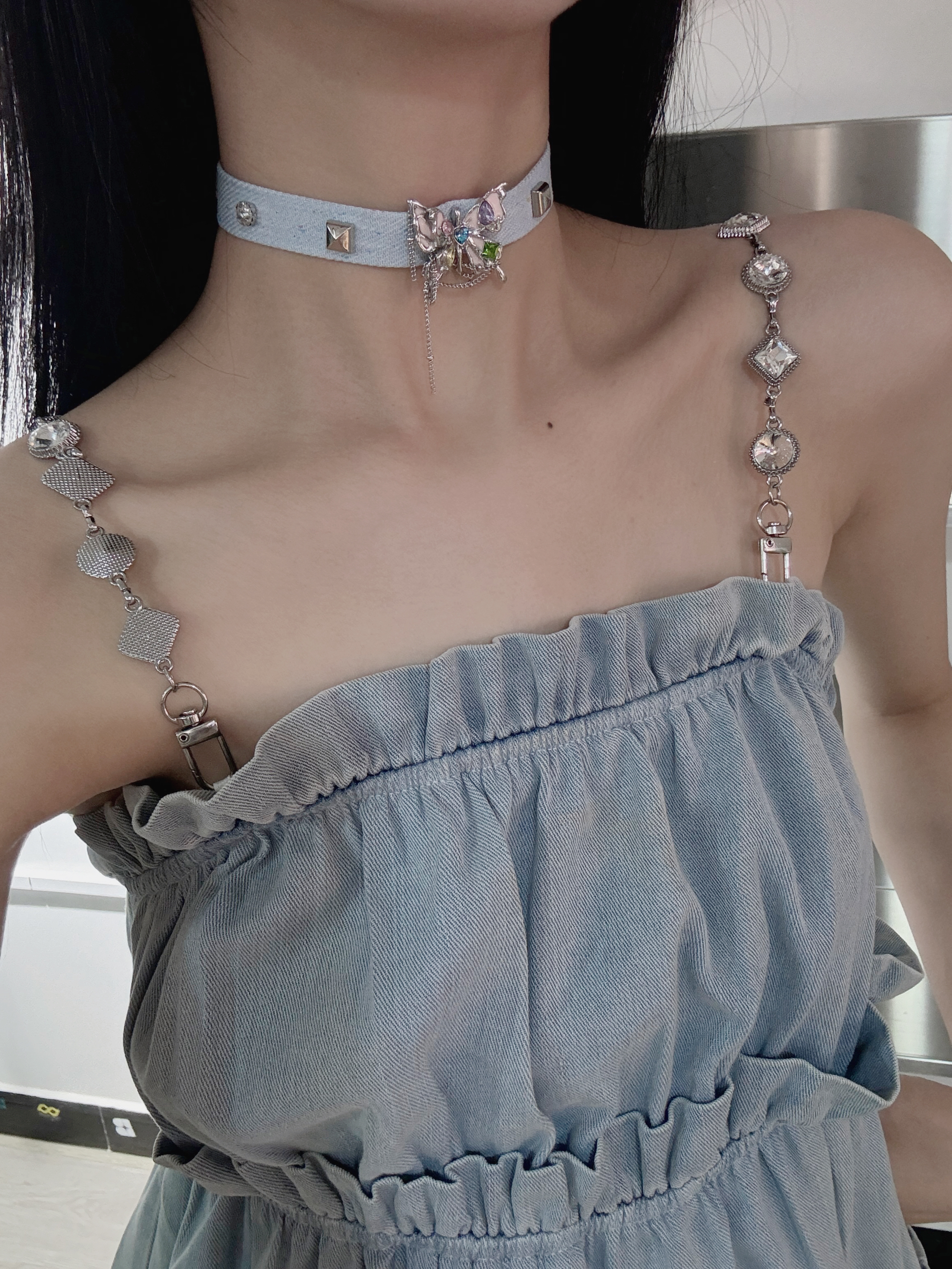 夏日只想做辣辣的牛仔女孩~ 七夕约会想穿牛仔娃娃裙 总感觉有点儿单调 就选了同色系的牛仔choker来点缀 多巴胺宝石组成的蝴蝶结 闪闪的好漂亮诶 穿搭又上一个新的level啦