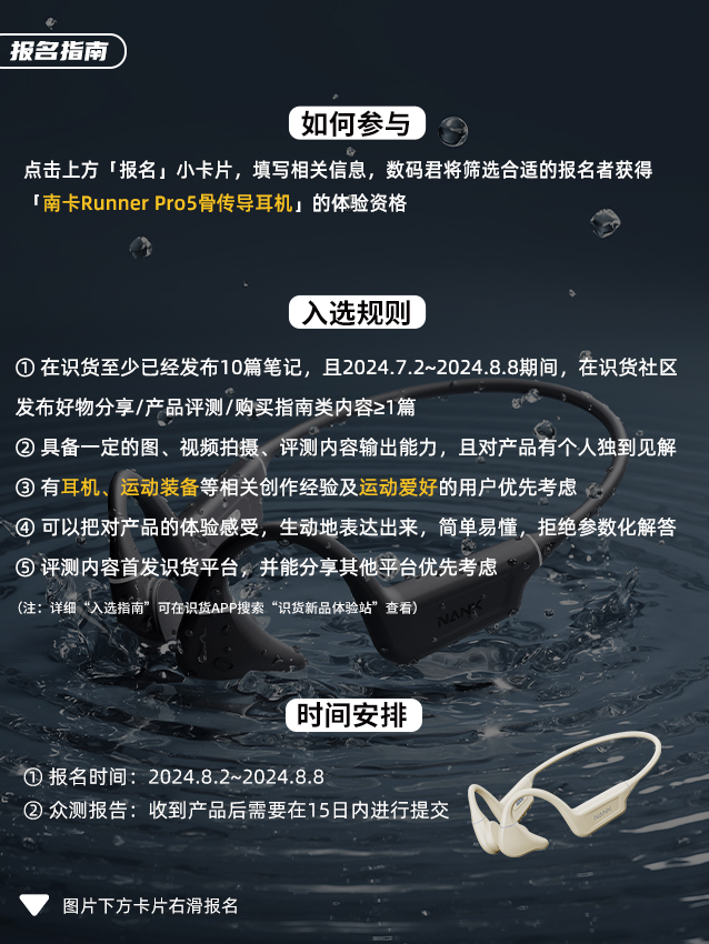 👆 点击报名按钮,招募体验官免费用! 🙂 招募名额:20名 🎧体验产品:南卡Runner Pro5骨传导运动耳机 ⭐【产品特点】 ① 首创35°可调节耳挂的设计,自由调整形状,开放听音同时解决风声噪音问题 ② 行业率先通过IP69专业深度防水认证的运动耳机 ③ 第4代響科技是骨传导声学科技,震感减少35%,音质全频段提升至90%以上 ④ 自主研发OT降漏音专利技术5.0,降低95%漏音情况,避...
