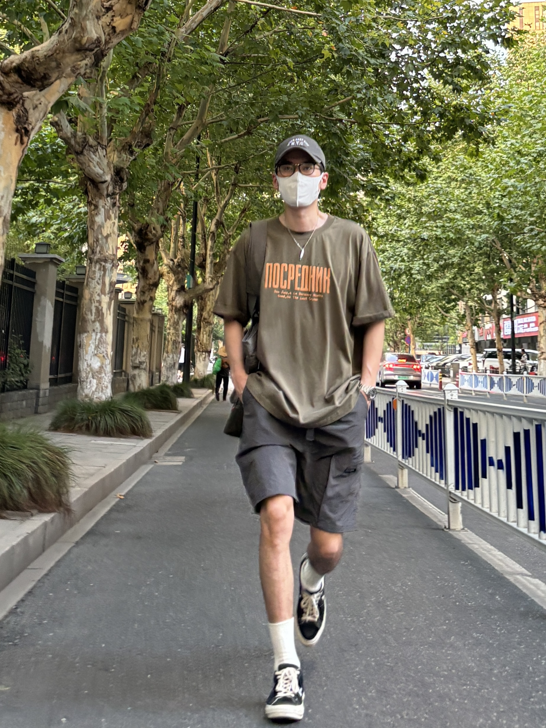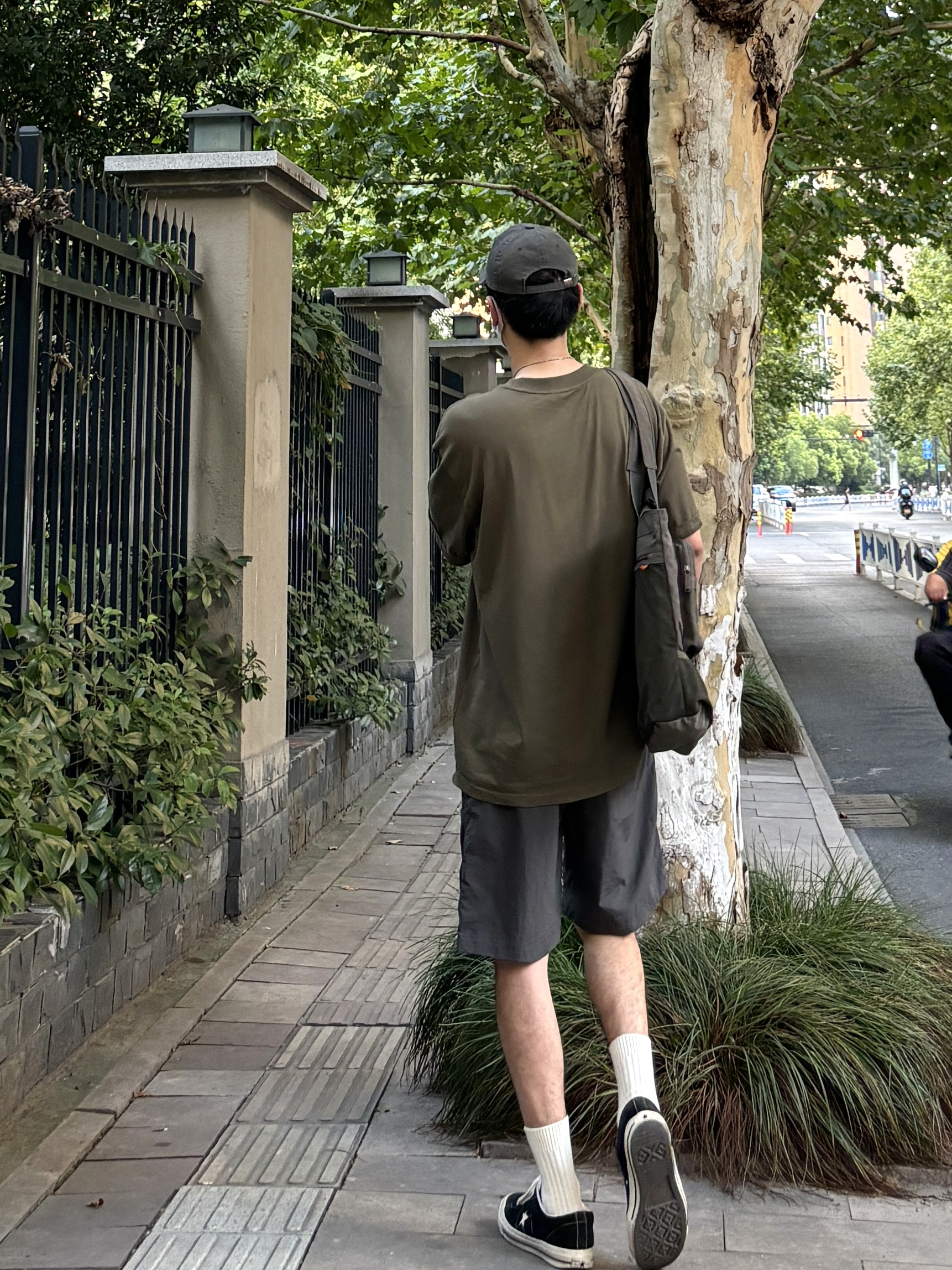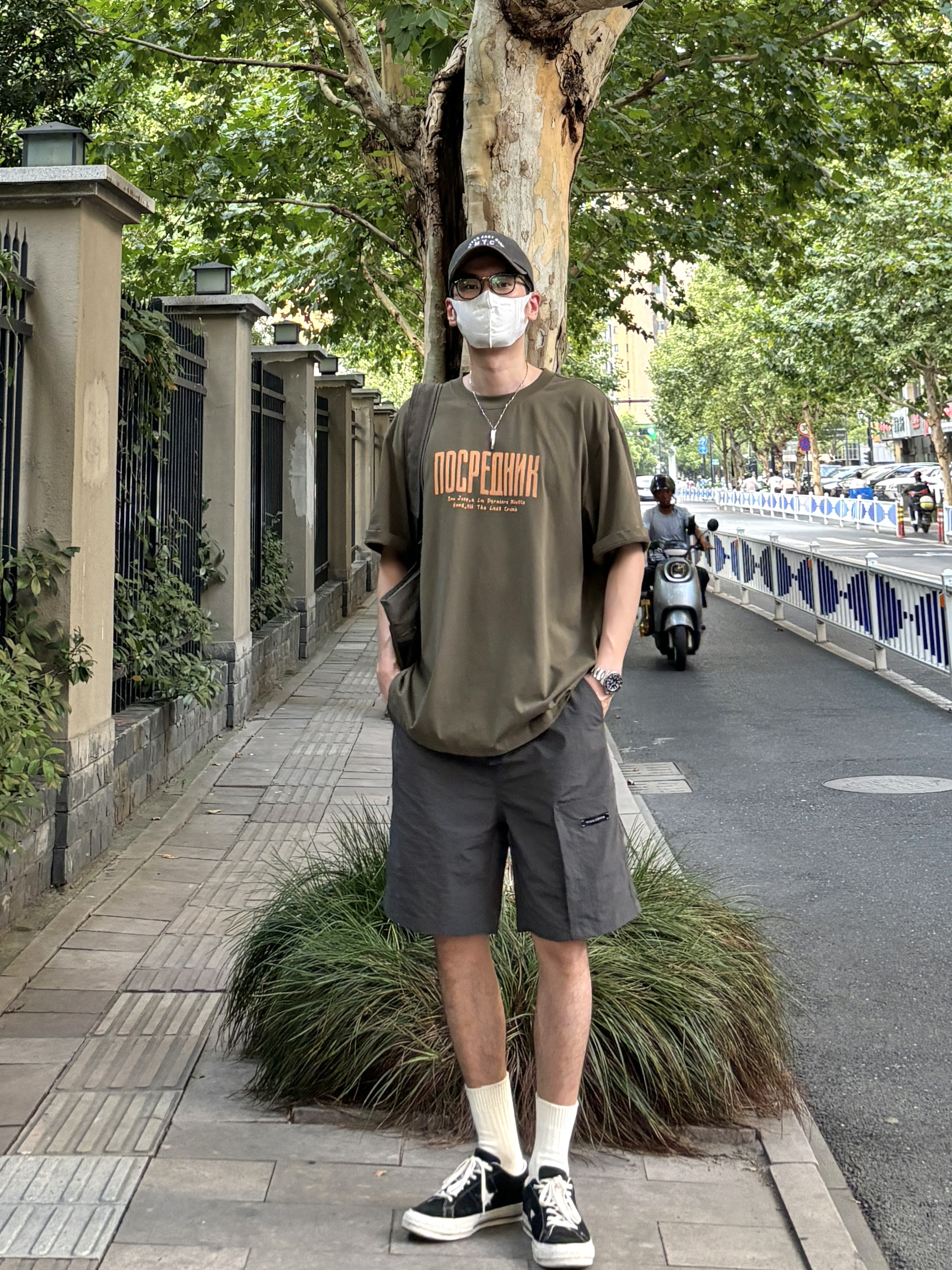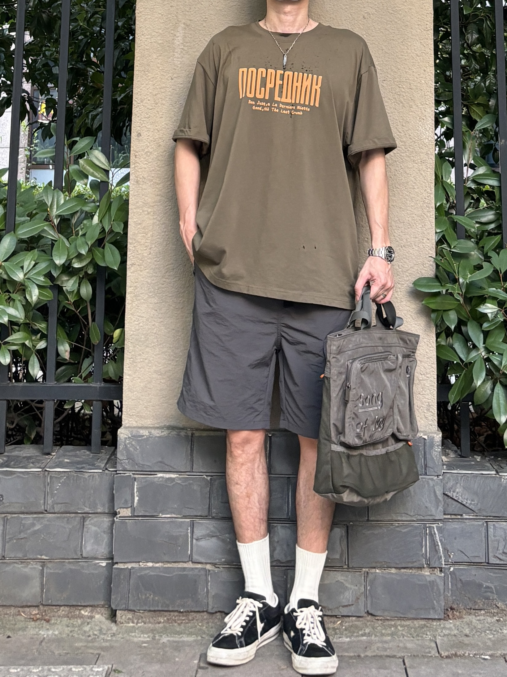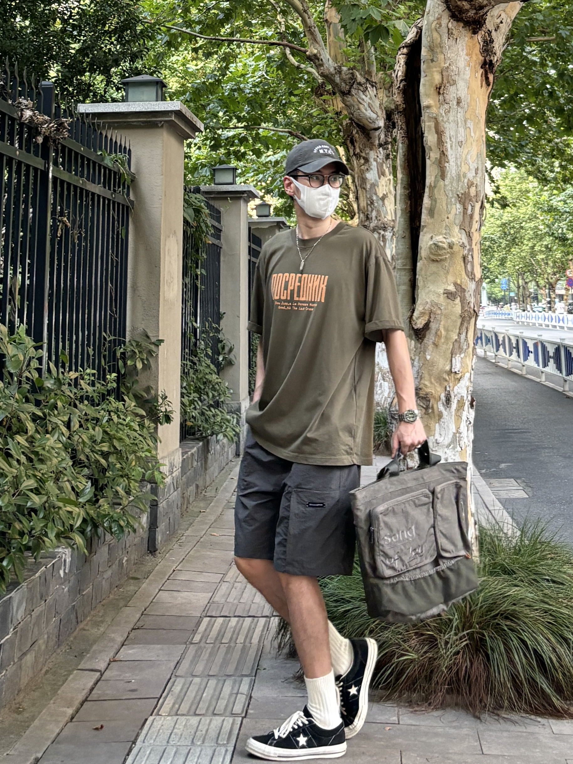 阿kong的夏季穿搭分享 - 今天这套上衣穿了一件军绿色重磅宽松字母印花圆领T恤 ⬇️ 裤子选择轻薄透气的深灰色直筒机能工装冰丝短裤 ⬇️ 鞋子上脚经典百搭的匡威one star ⬇️ 最后背一个大容量拼色托特包呼应下衣服裤子的颜色 - 今日搭配 衣服裤子都来自:NICE LILI 鞋子:匡威one star