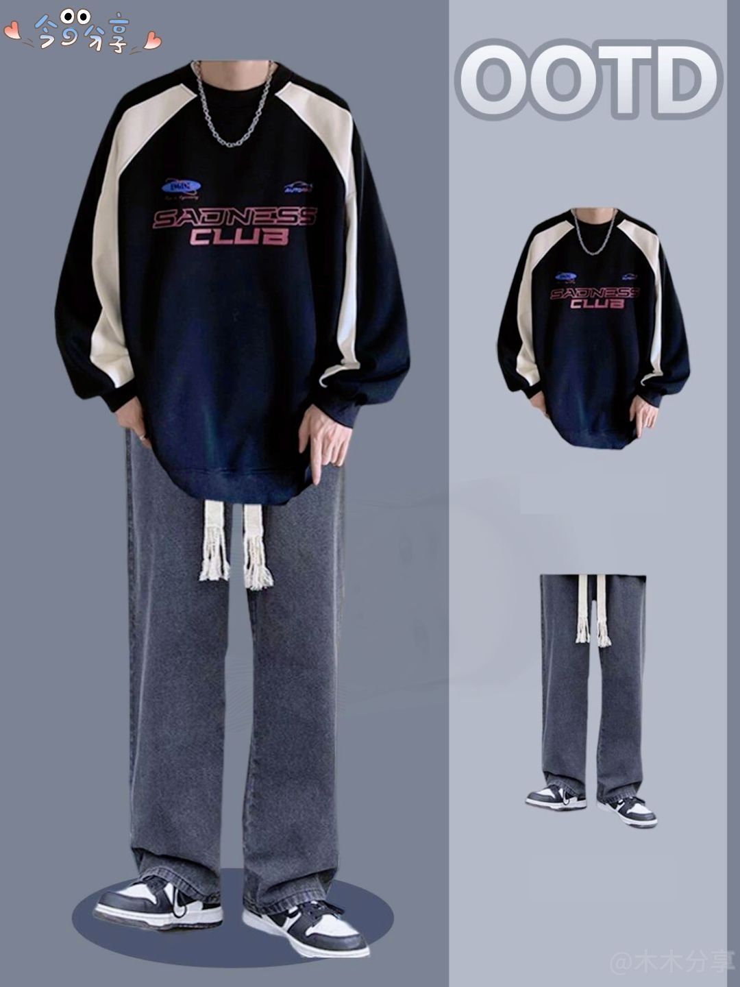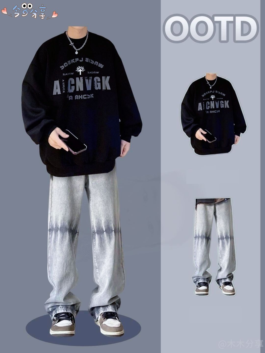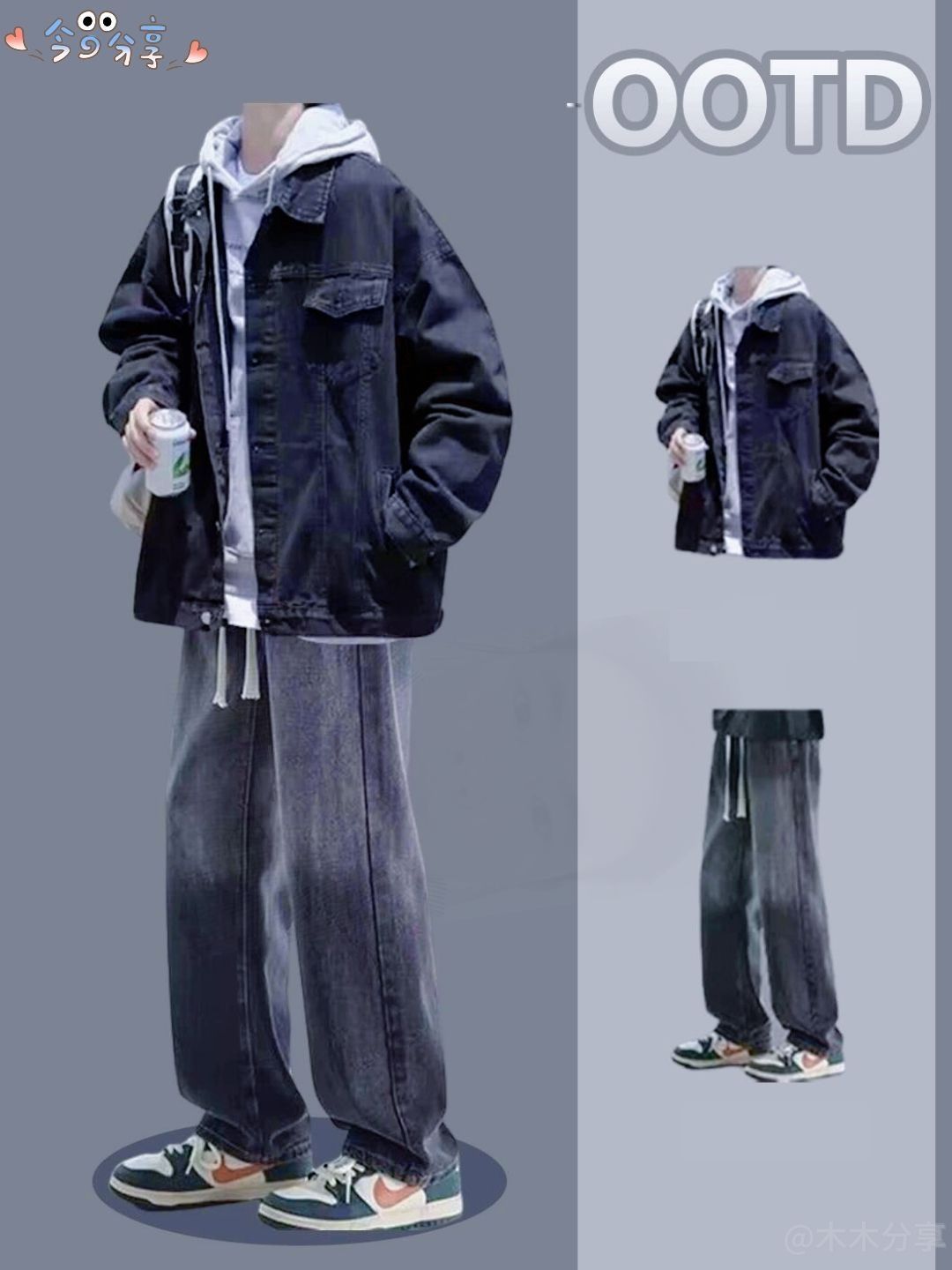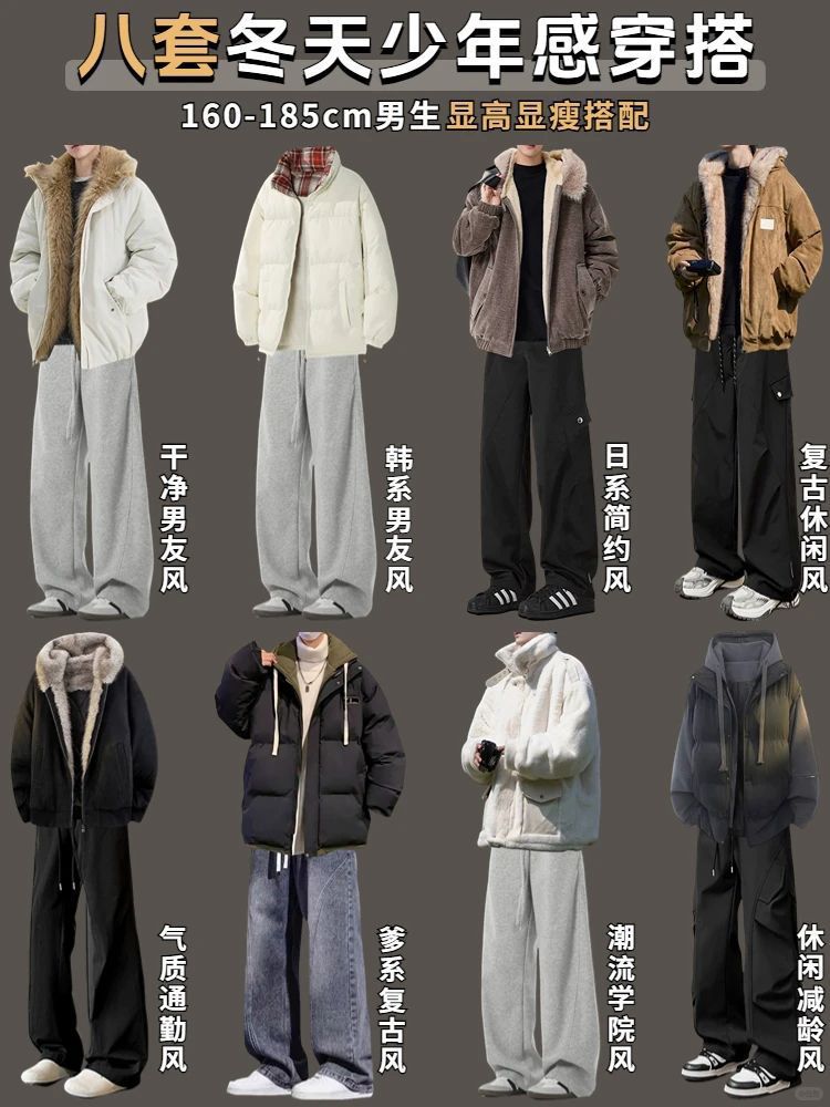 8套痞帅男友秋季穿搭合集 1. **混搭风卫衣套装** - 发拼接设计的长袖卫衣(痞帅风格),搭配灰色复古牛仔长裤。 2. **韩式学院风格** - 灰色翻领卫衣(带有学院风的设计细节),搭配牛仔口袋工装裤。 3. **潮流酷男装扮** - 黑色毛衣搭配灰色渐变牛仔直筒裤。 4. **复古做旧风** - 做旧处理的牛仔外套内搭白色卫衣,下身选择渐变灰...