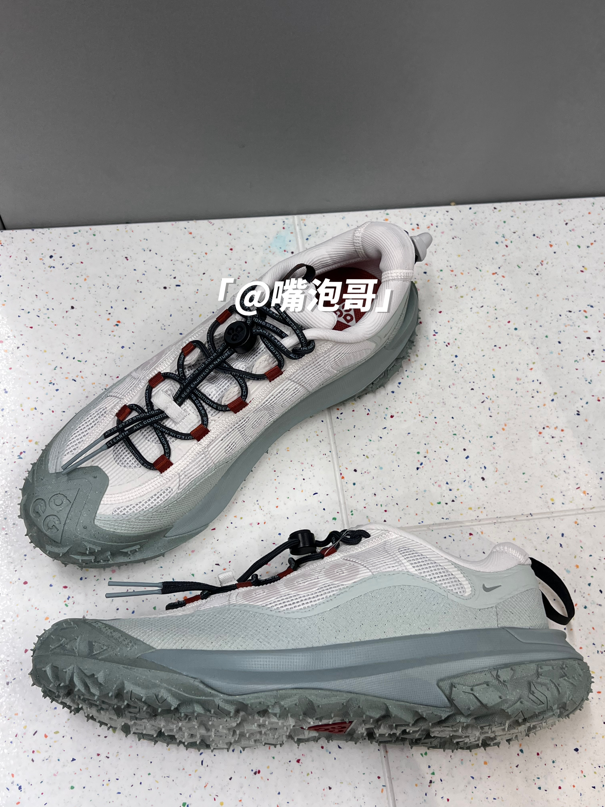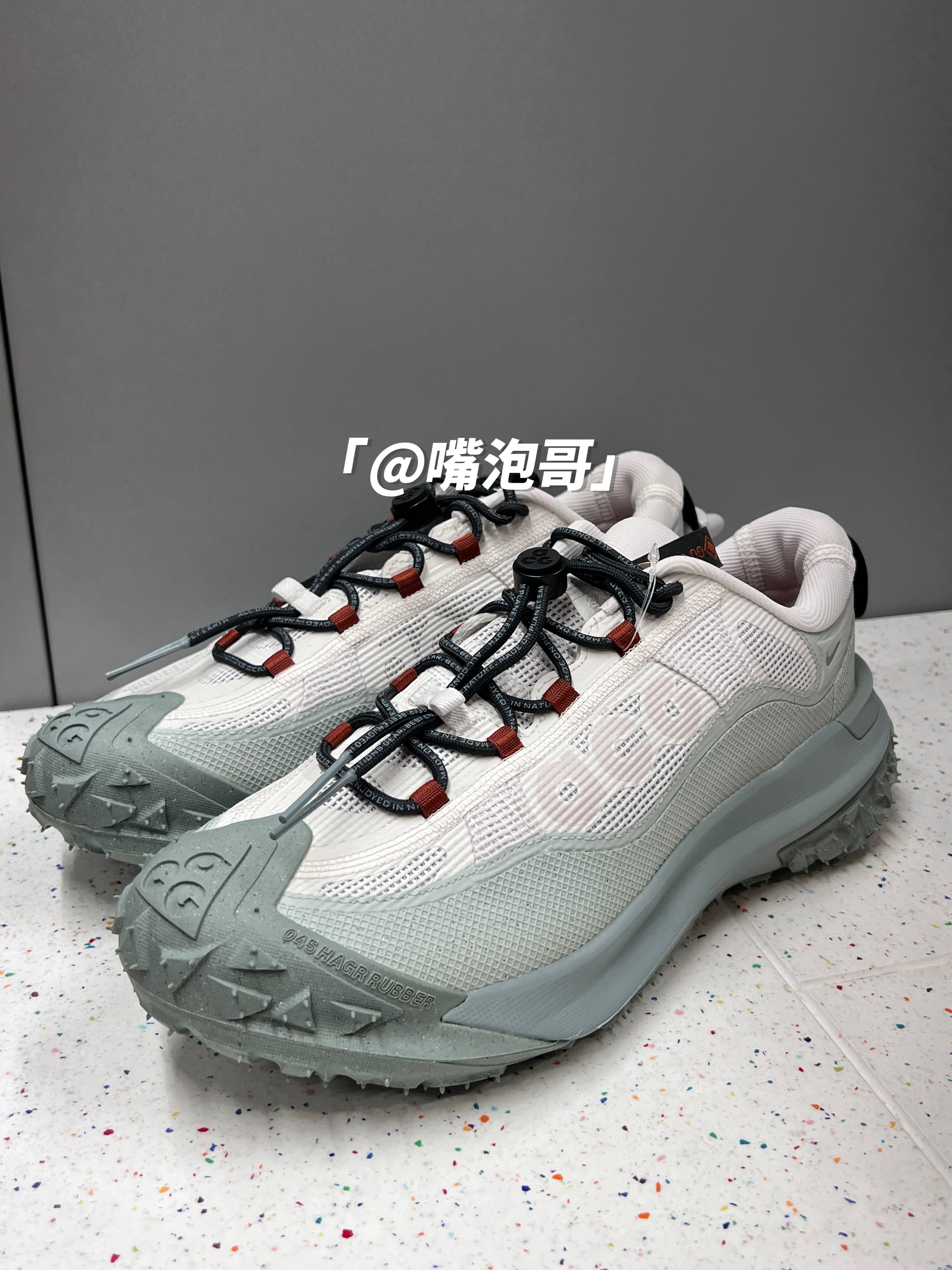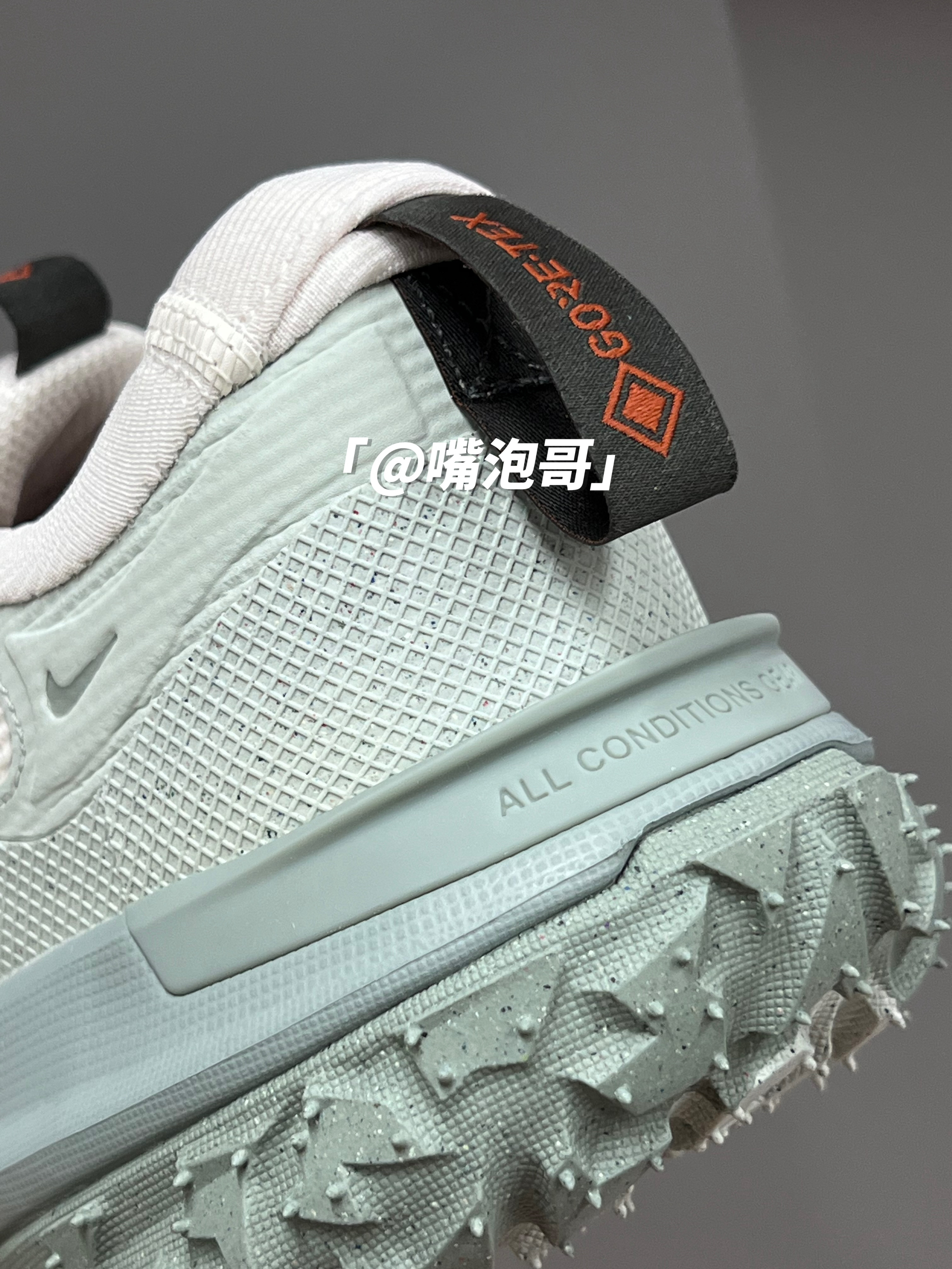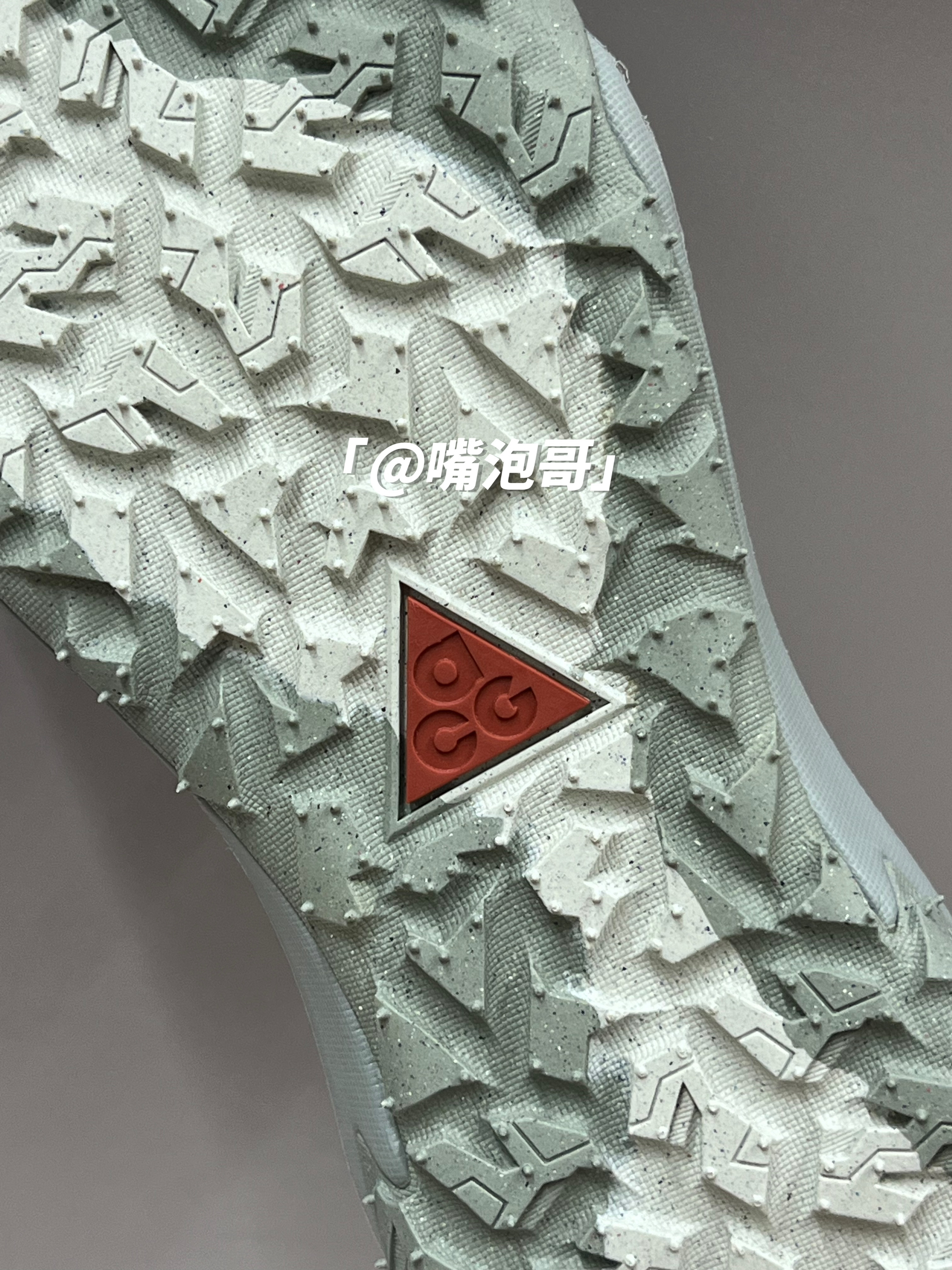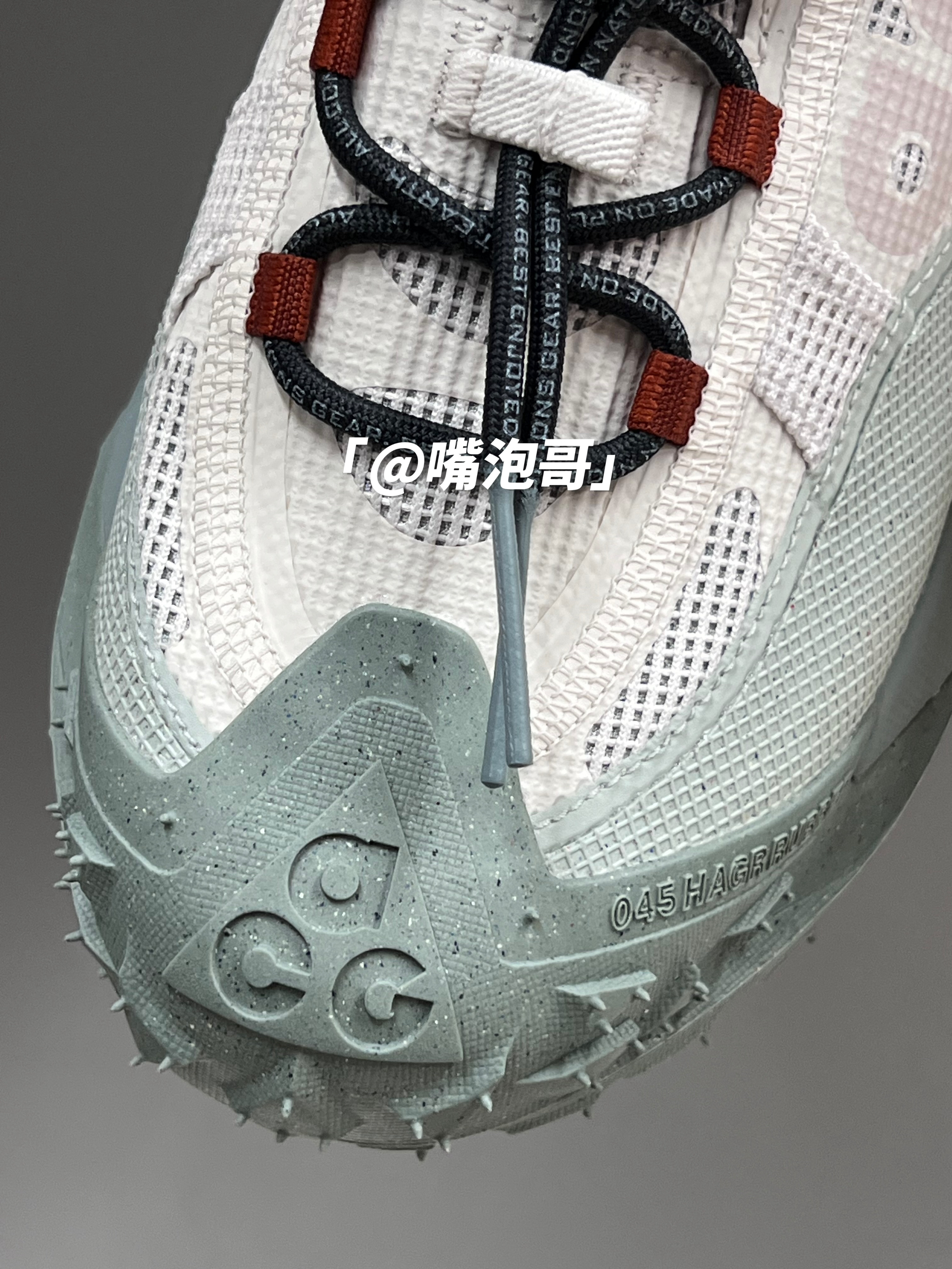 👟:ACG Mountain Fly 白灰绿 简介: 鞋款是一双ACG系列的户外运动鞋,整双鞋子外观配色选用了白色与灰绿色的组合,还是蛮小众的,鞋子整体的采用了多种轻质材料制作,并且大底是一体式的,其鞋底花纹设计有软质的橡胶钉,使鞋子在户外运动时的抓地力更好。 细节: 鞋面采用了复合织物网布材料制作,使鞋面具有良好透气性,鞋舌与后跟内里填充柔软,增加了包裹感,鞋带运用了快收设计,能够更...