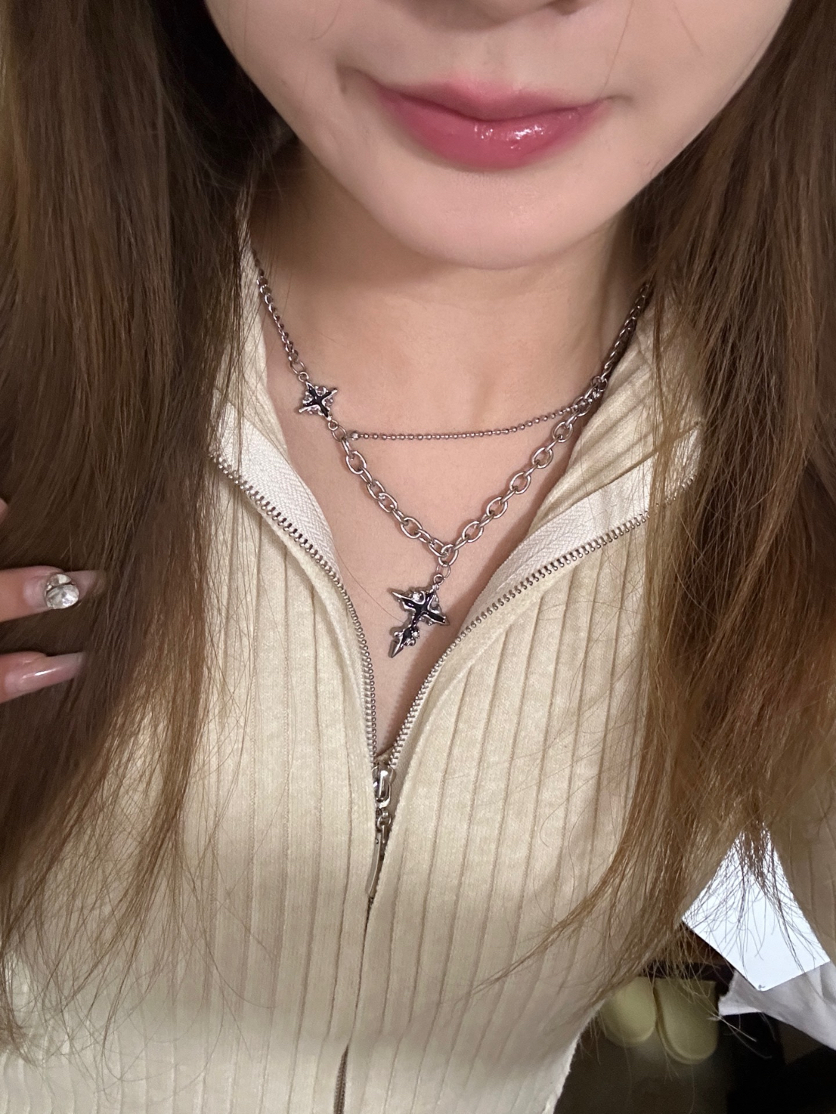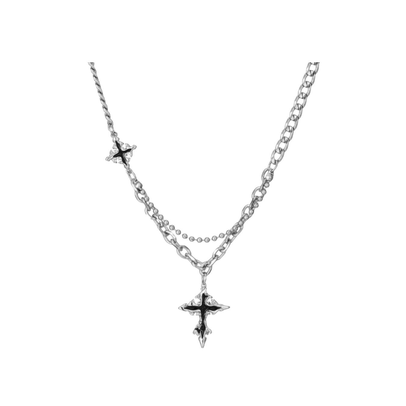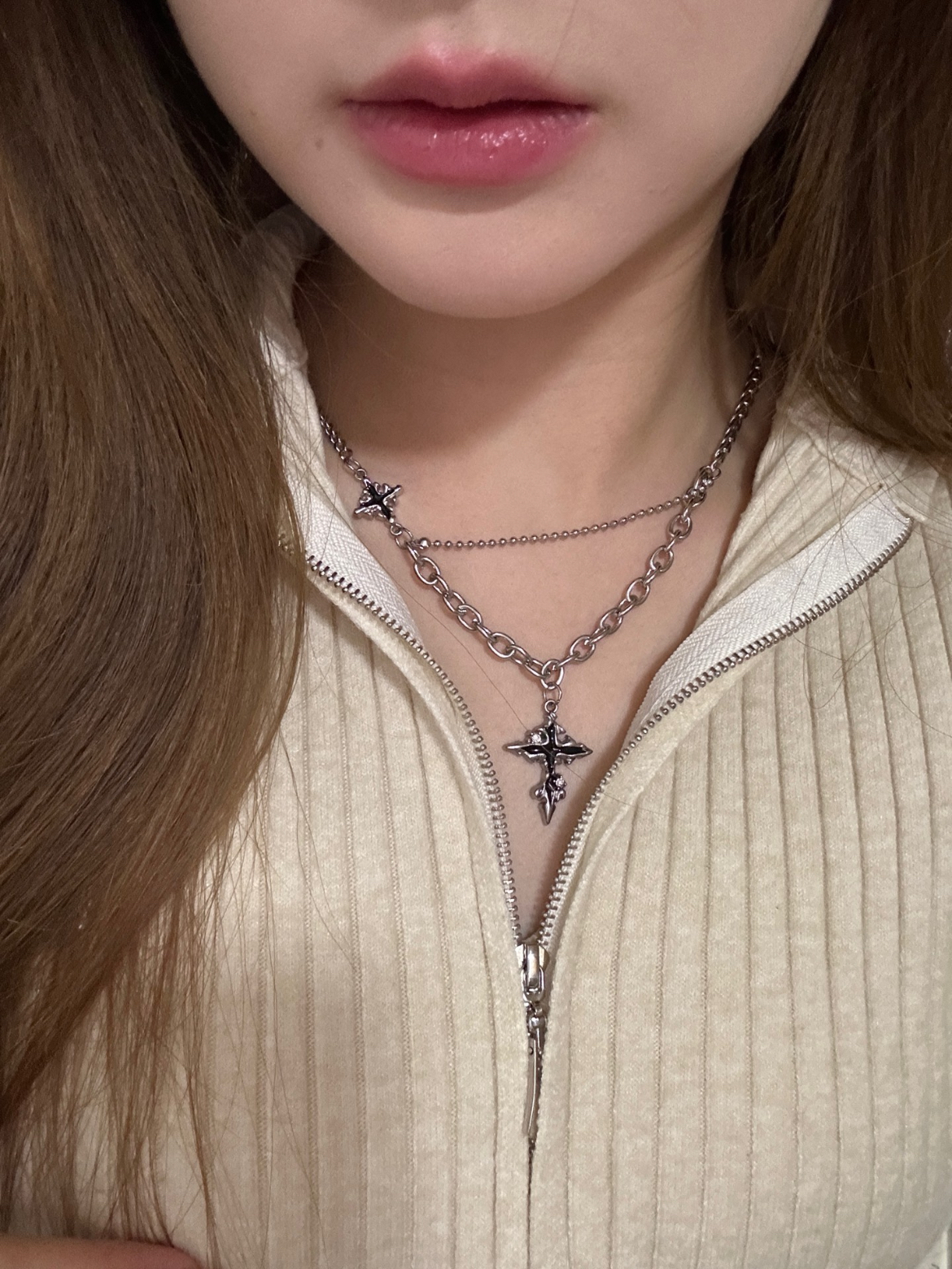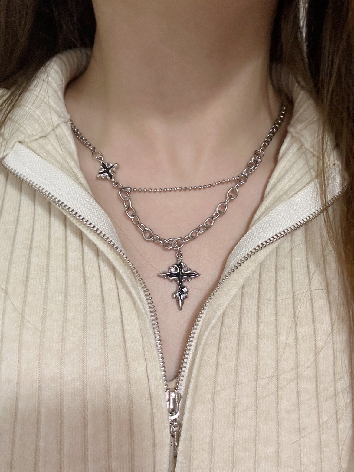 这个暗黑十字架项链搭配衣服也太酷了叭~很的百搭,不用担心搭什么衣服,我感觉戴上这个项链会提升整体的气质~合金材质,挺有质感的。看似简单的十字架用了大小两个十字架去做比较,中间还有一条连接线,设计感十足,很有创意,日常又百搭。 (图片来自网络,侵删)