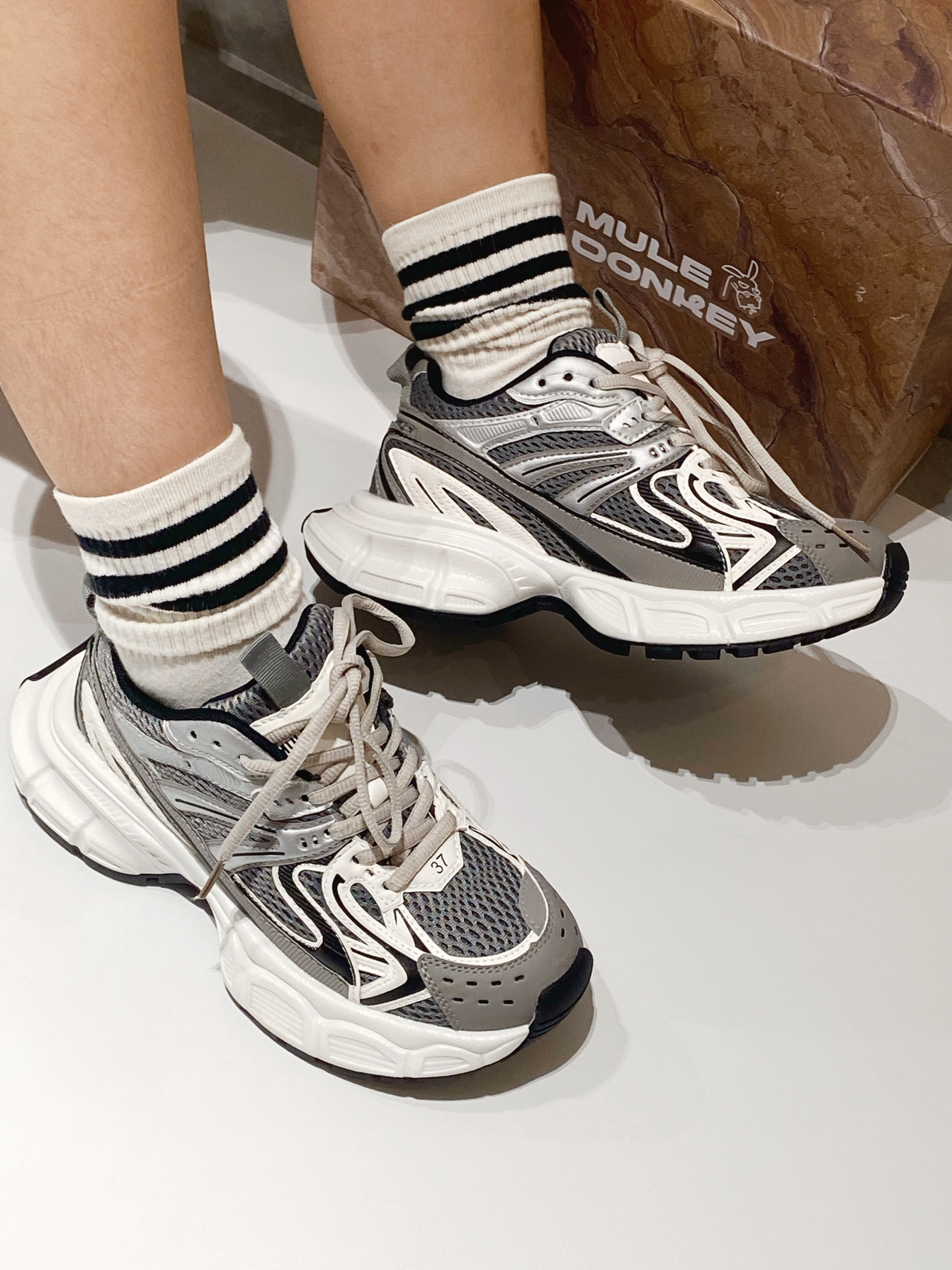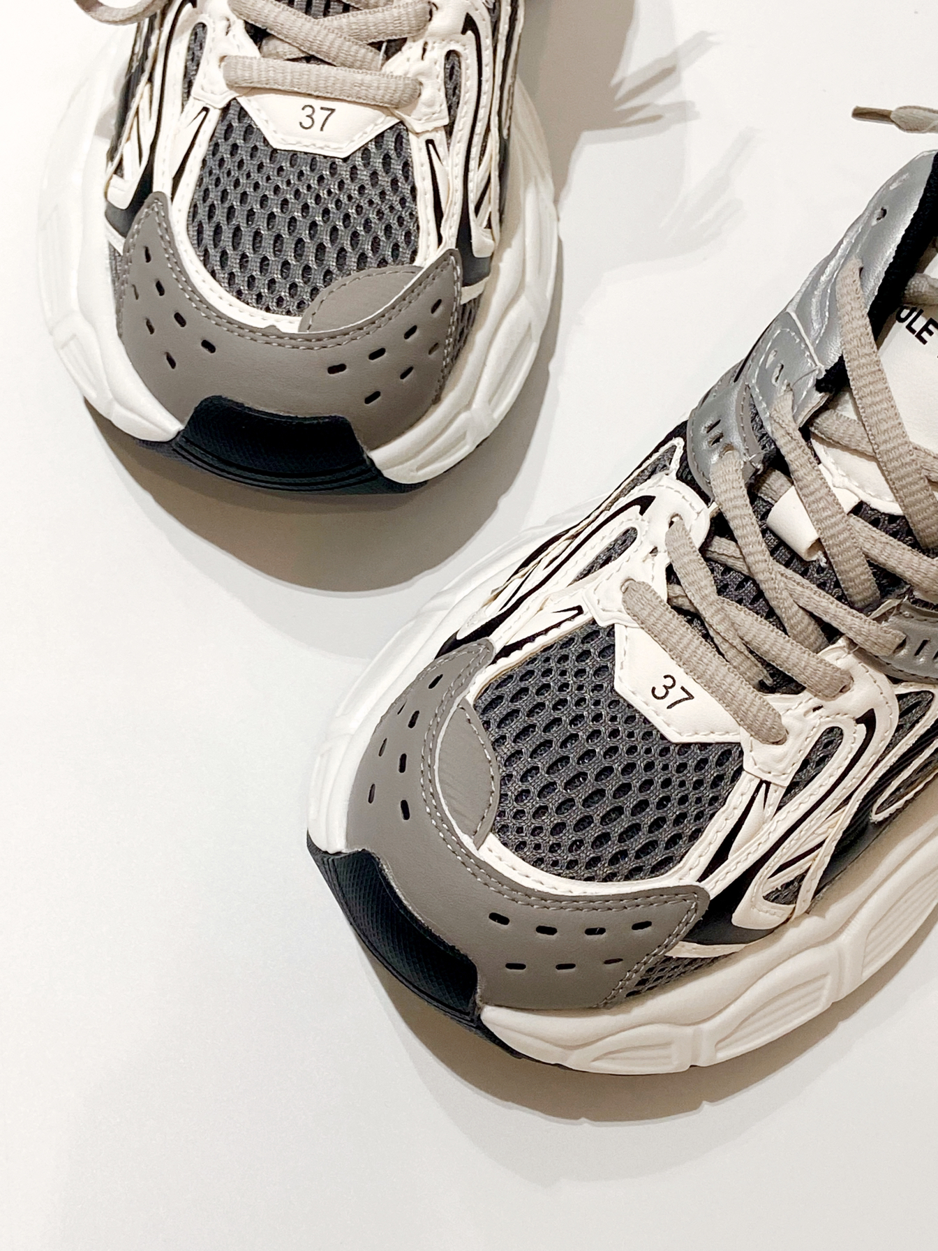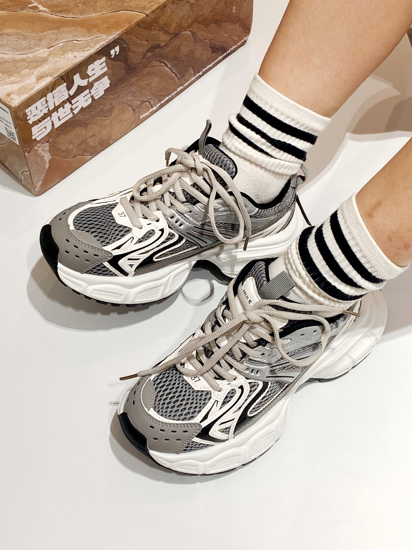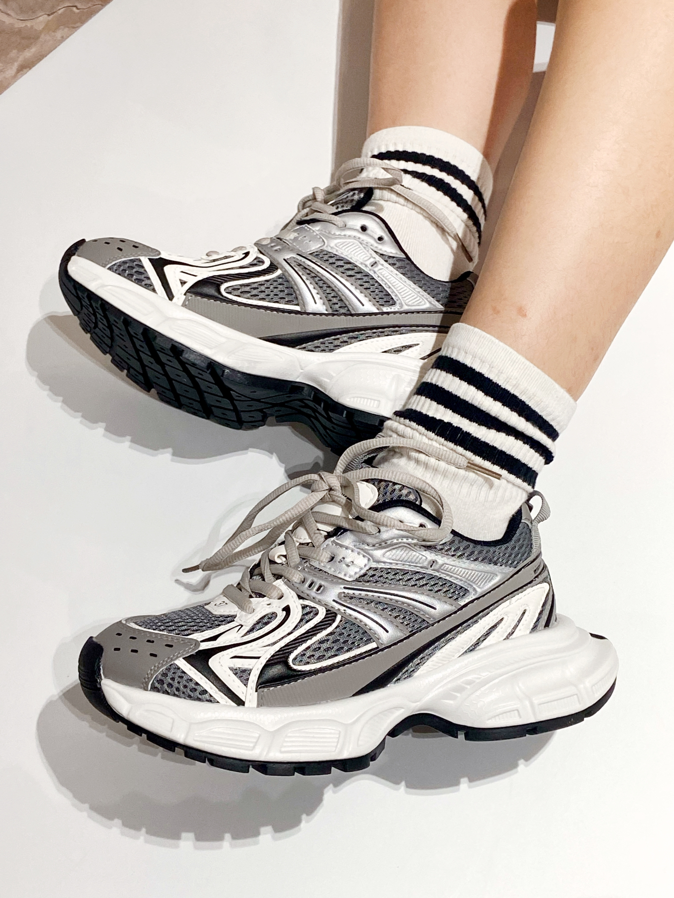 银灰白色搭配 自带高级感 穿什么都吼看,裙子裤子都能搭 鞋面是网面材质拼接的 上脚透气舒适 脚感也软呼呼的 厚底穿上吼显腿长a ~ 谁懂,想把它焊在脚上 !