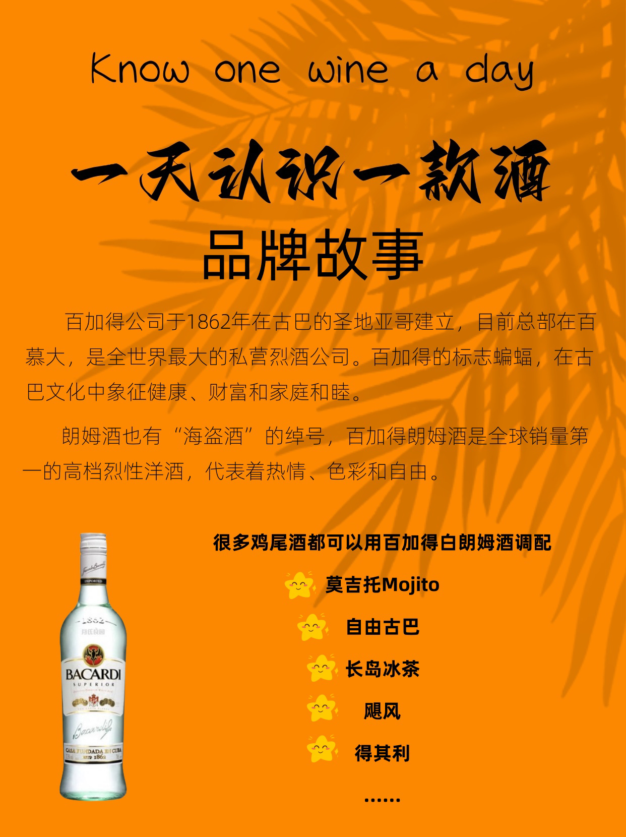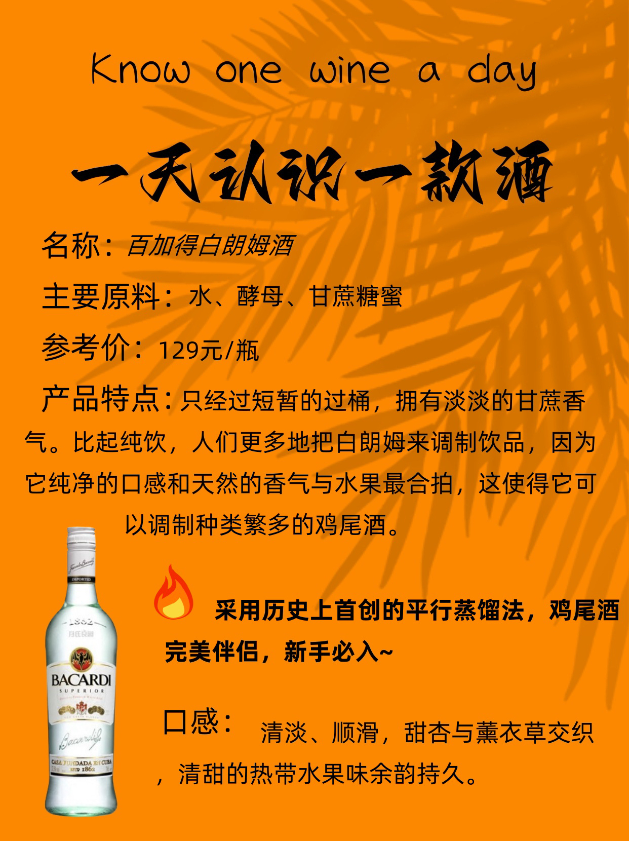 🍻百加得白朗姆酒🍻 · 产地:波多黎各🇵🇷 度数:40%vol🍺 容量:750ml🧊 类型:朗姆酒 参考价格:129元/瓶 · ⭐️采用历史上首创的平行蒸馏法,鸡尾酒🍹完美伴侣,新手必入 · 口感:清淡、顺滑,甜杏与薰衣草交织,清甜的热带水果味余韵持久。 · 🎖️🎖️-品牌故事- 百加得公司于1862年在古巴的圣地亚哥建立,目前总部在百慕大,是全世界最大的私营烈酒公司。百加得的标志蝙蝠,在古巴文化...