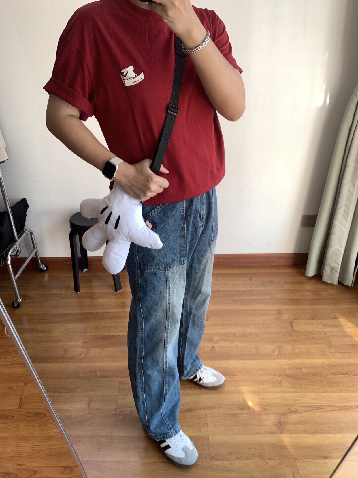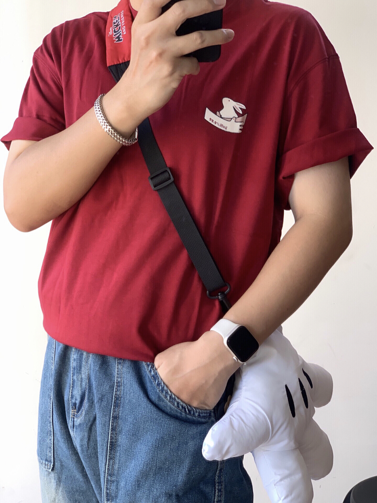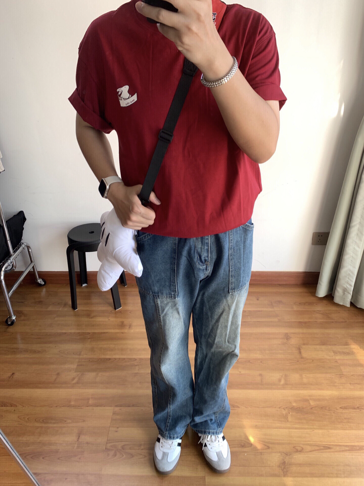 嗨嗨,各位小伙伴😜!今天来给你们讲讲我的美式休闲 cleanfit 穿搭🎈。 我身上这件酒红色兔子 T 恤👕,颜色特别正,那个小兔子图案超可爱的🐇。 下面搭配的是复古水洗牛仔裤👖,这裤子的版型超赞,穿起来很显腿长。 再瞅瞅我的脚,阿迪 samba 德训鞋👟,舒服又好看,走路都带风。 我的 iwatch⌚当然不能缺席啦,方便又时尚。 还有这个银色古巴链手环💍,戴上感觉自己酷毙了。 最后就是我的米奇手...
