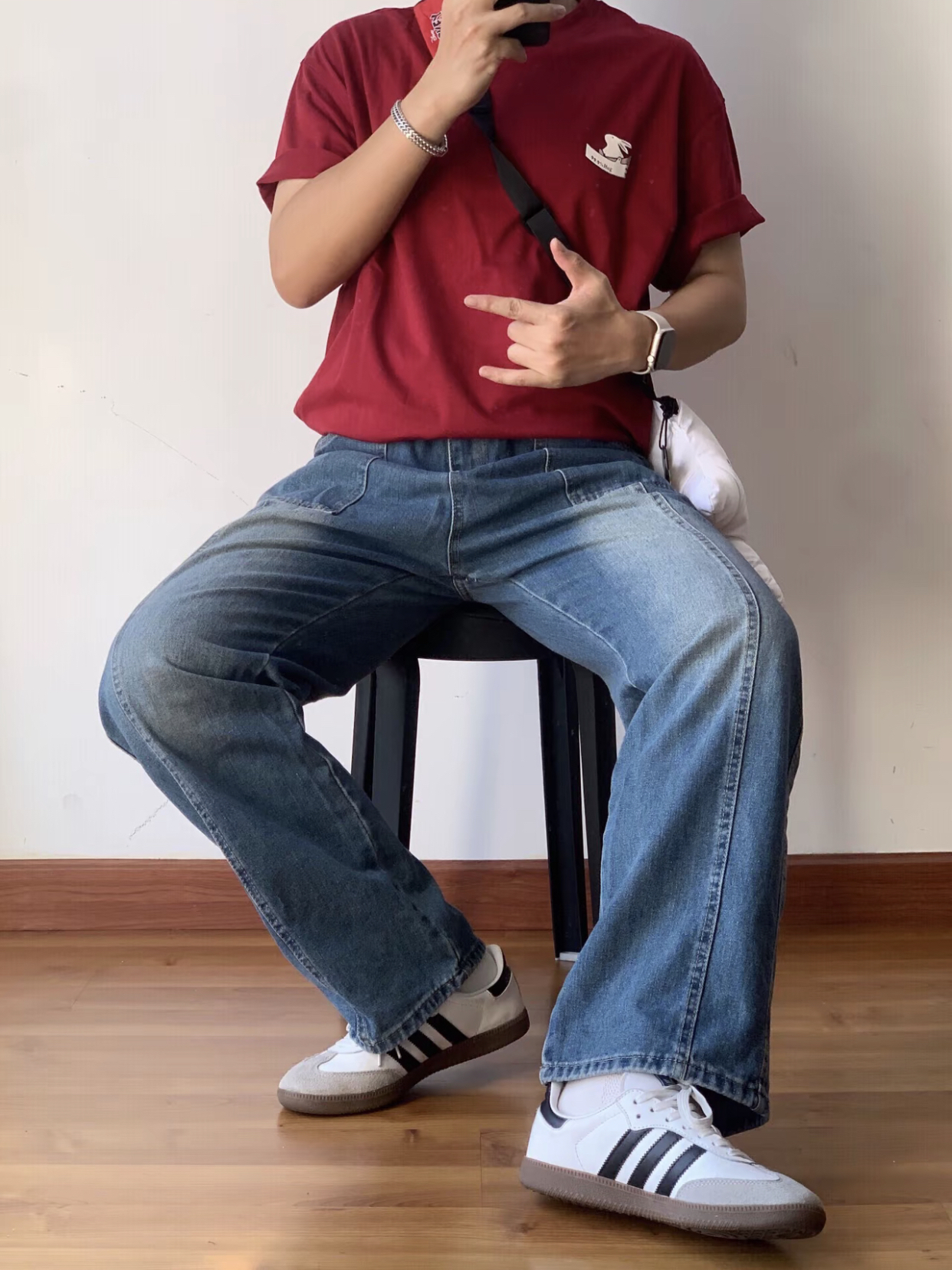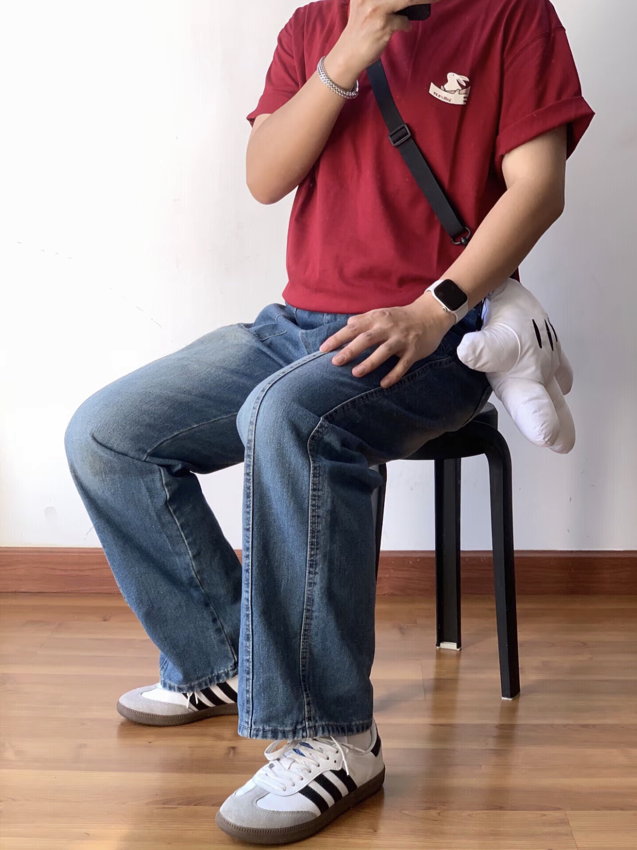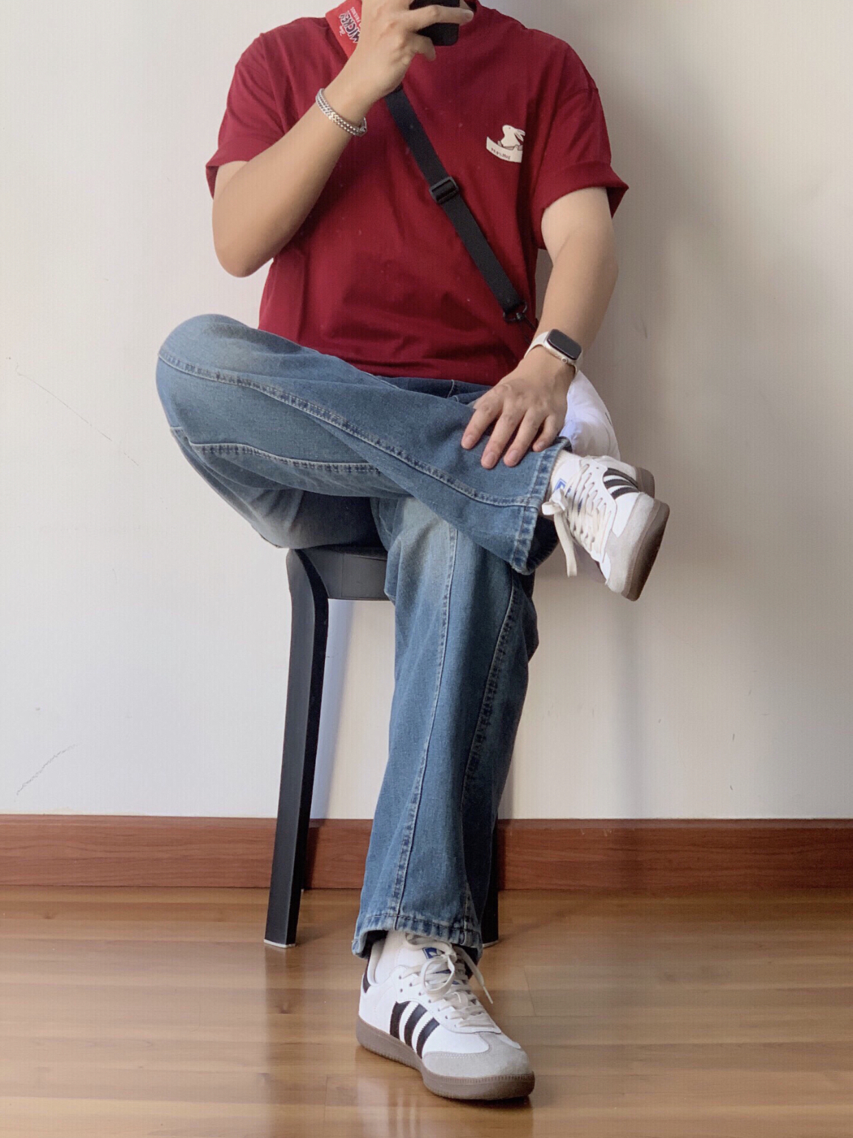 嗨嗨,各位小伙伴😜!今天来给你们讲讲我的美式休闲 cleanfit 穿搭🎈。 我身上这件酒红色兔子 T 恤👕,颜色特别正,那个小兔子图案超可爱的🐇。 下面搭配的是复古水洗牛仔裤👖,这裤子的版型超赞,穿起来很显腿长。 再瞅瞅我的脚,阿迪 samba 德训鞋👟,舒服又好看,走路都带风。 我的 iwatch⌚当然不能缺席啦,方便又时尚。 还有这个银色古巴链手环💍,戴上感觉自己酷毙了。 最后就是我的米奇手...