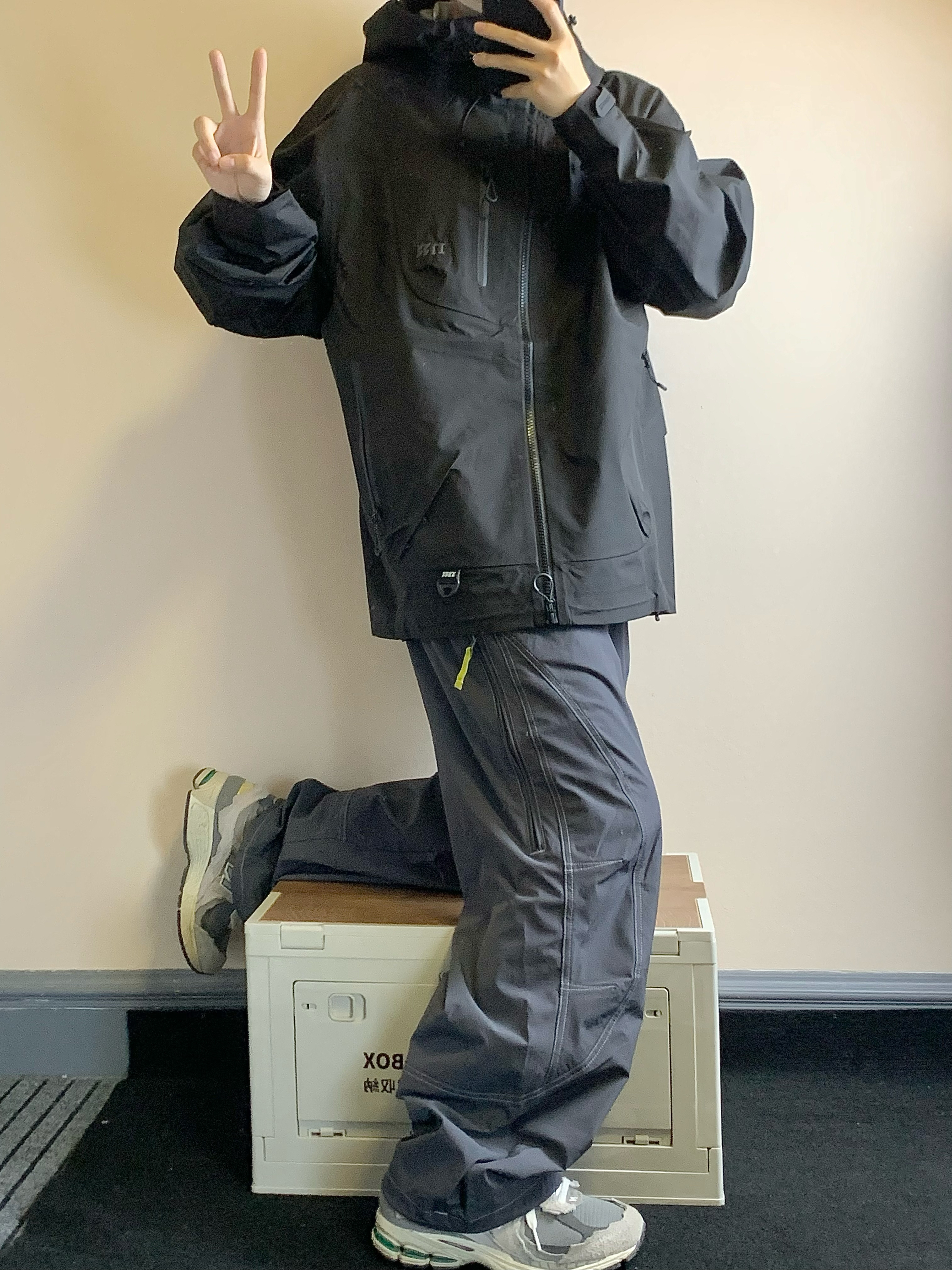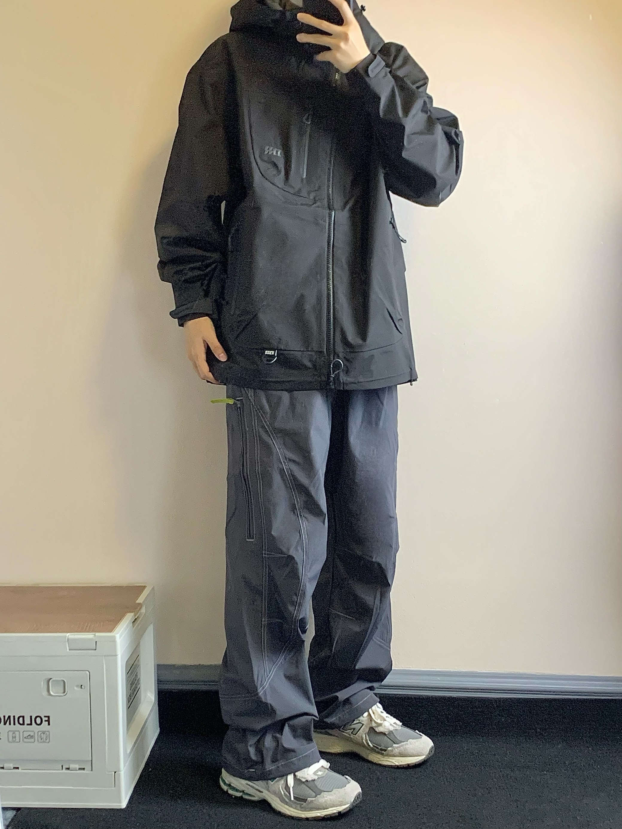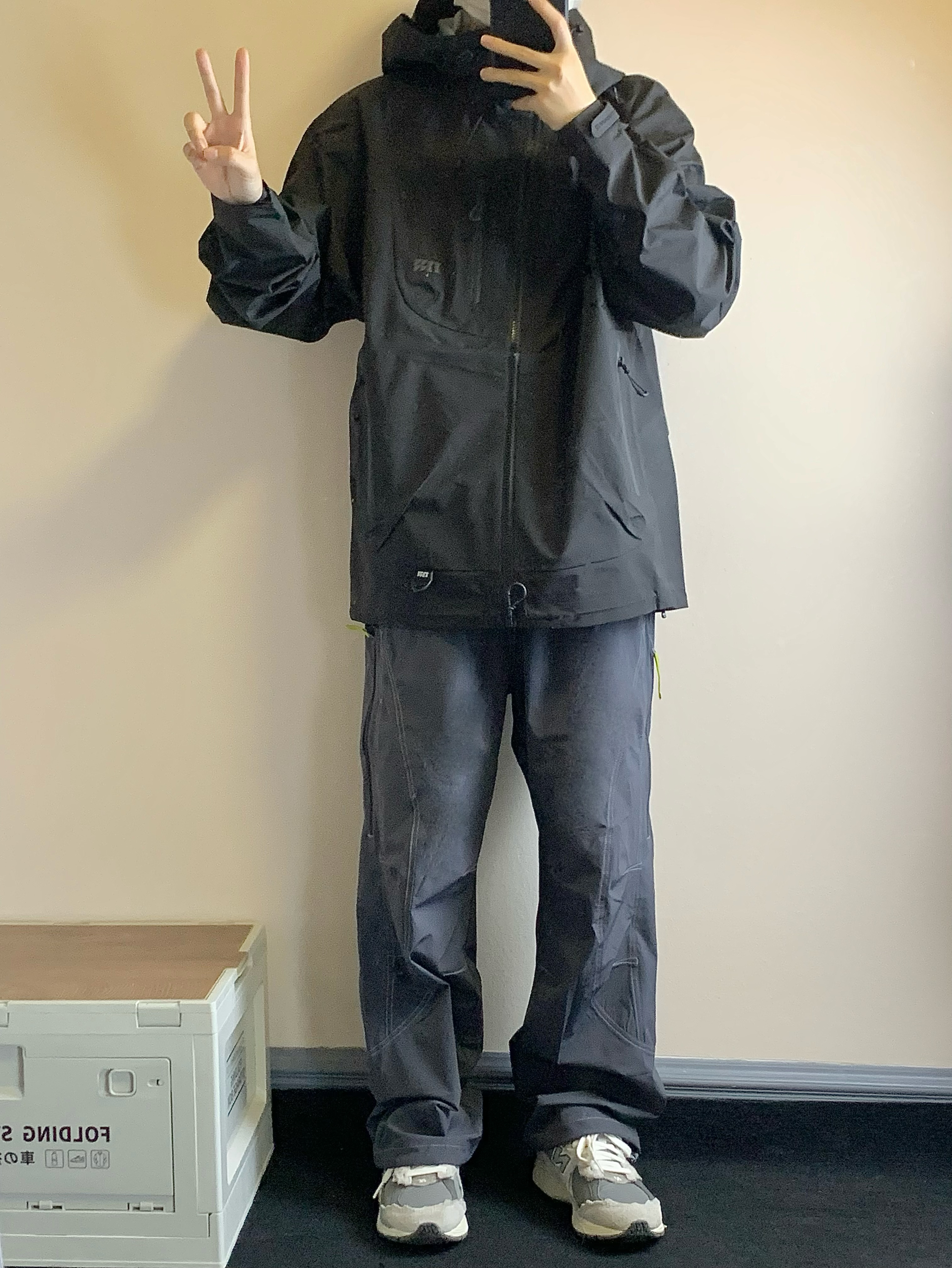 上衣是黑色的冲锋衣 三防面料 防风防水防污渍 拉链口袋设计 方便储物 下摆抽绳设计 更好的防风 下装是蓝灰色的长裤 思高洁面料 吸湿排汗 版型也超级赞 上身很酷 户外徒步就穿这一身! 👔:MOTHOMME 👖NOTHOMME 👟:NB2002R