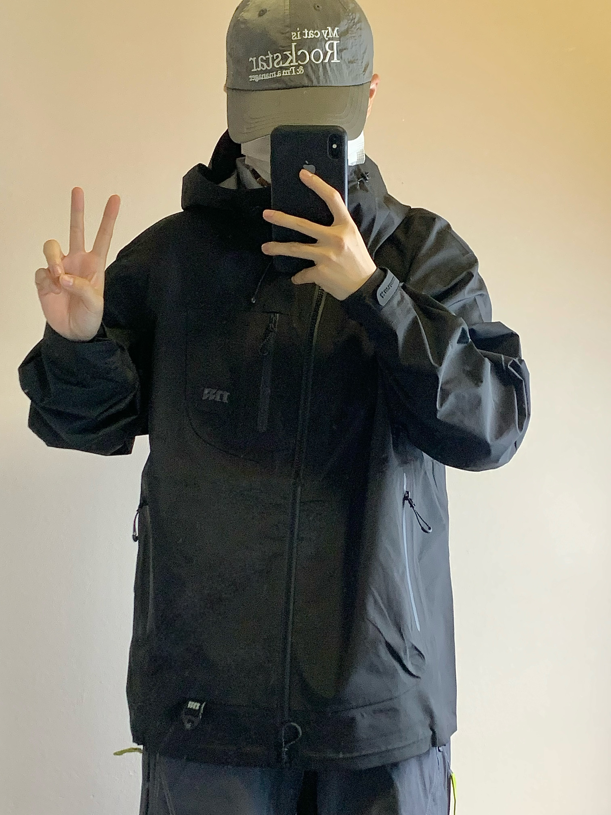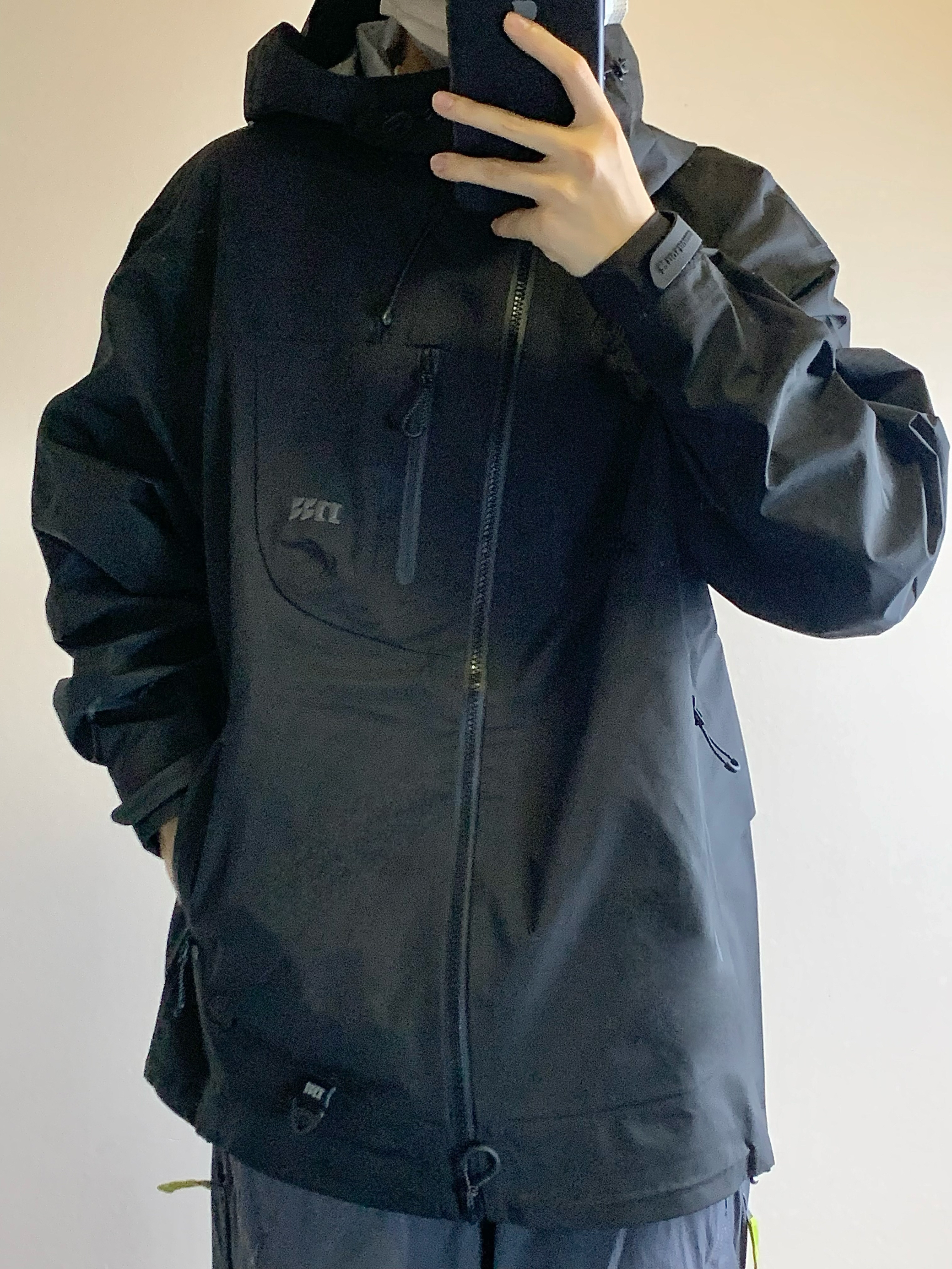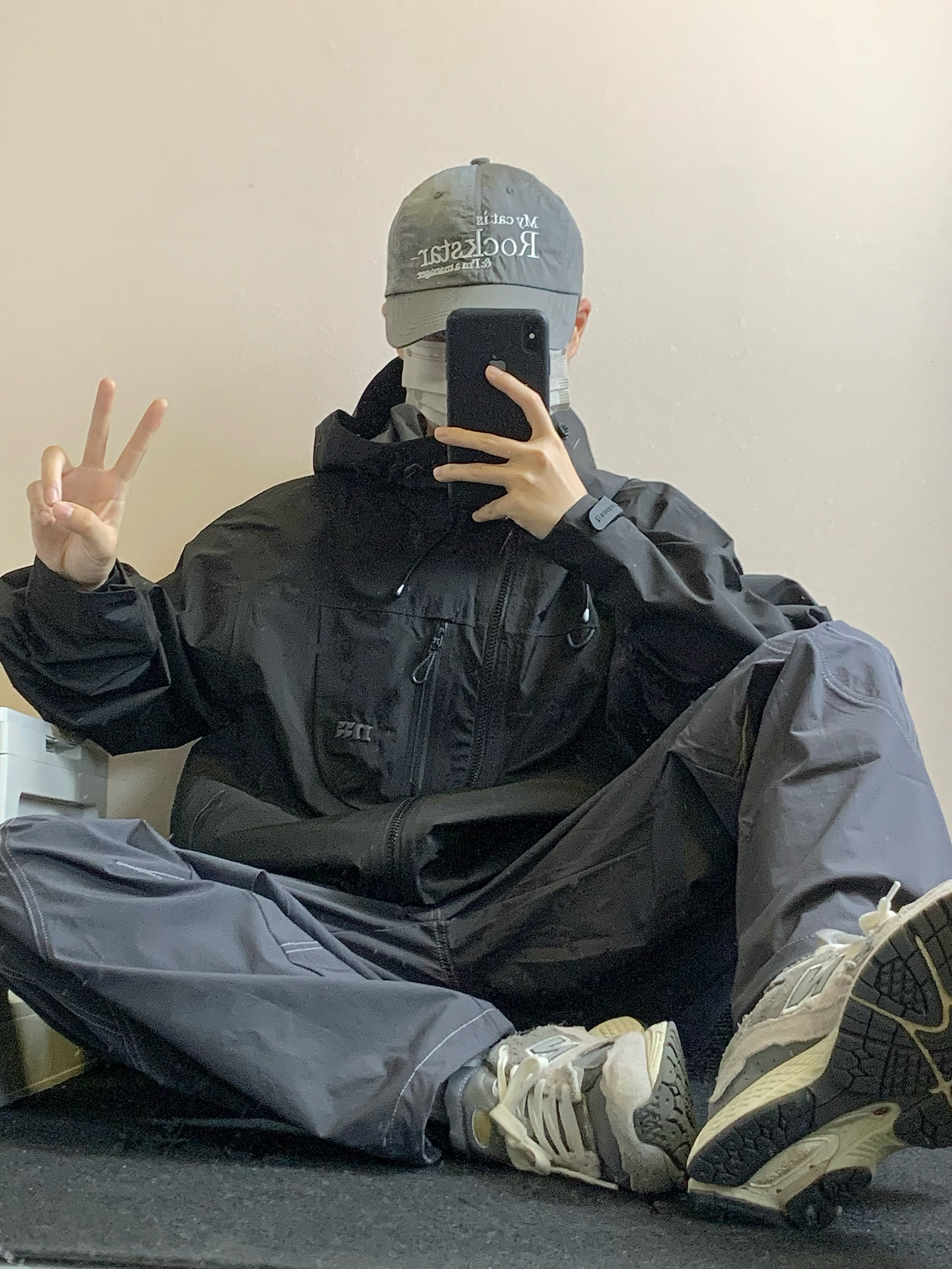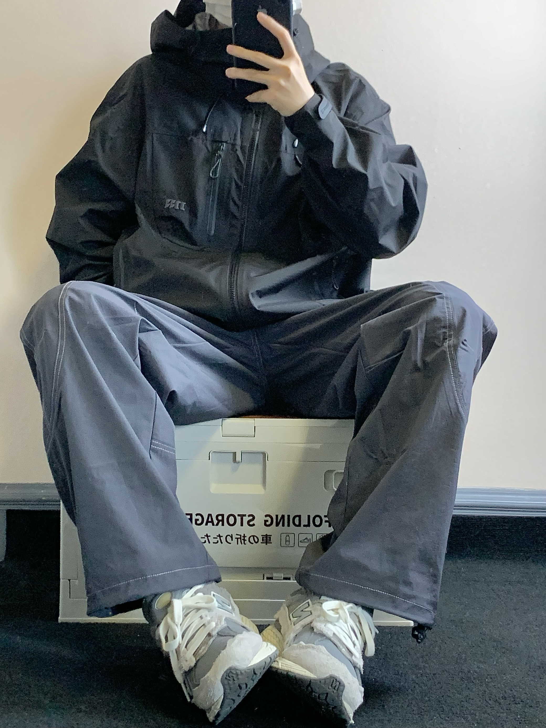 上衣是黑色的冲锋衣 三防面料 防风防水防污渍 拉链口袋设计 方便储物 下摆抽绳设计 更好的防风 下装是蓝灰色的长裤 思高洁面料 吸湿排汗 版型也超级赞 上身很酷 户外徒步就穿这一身! 👔:MOTHOMME 👖NOTHOMME 👟:NB2002R