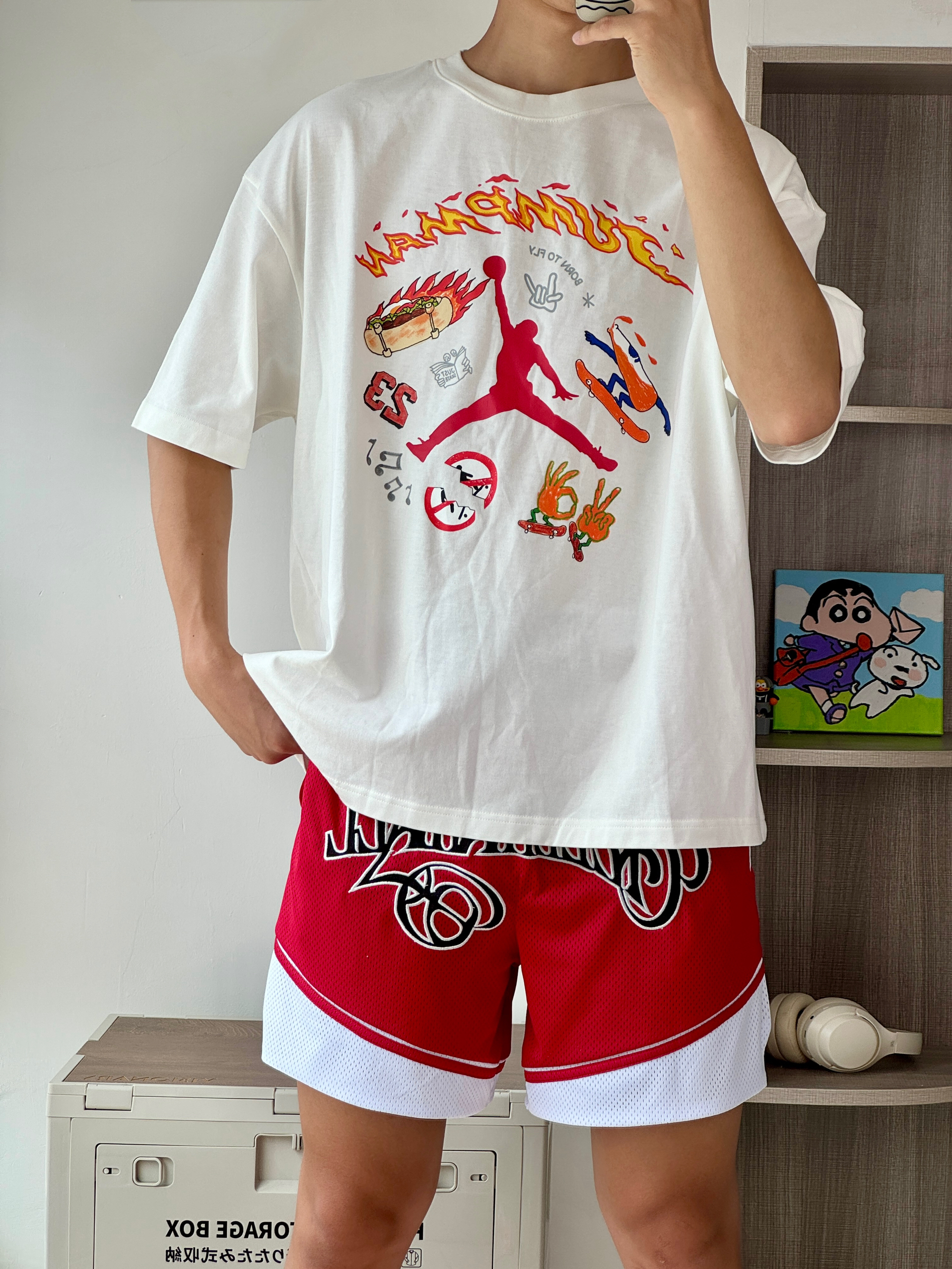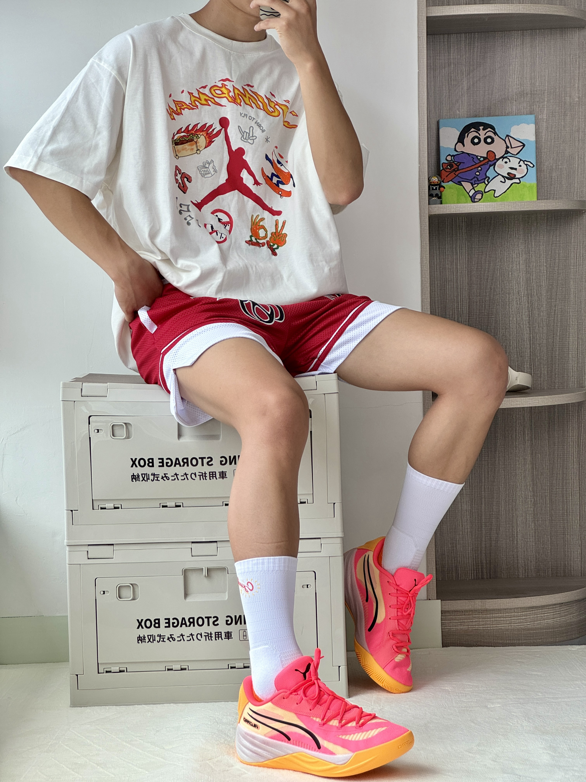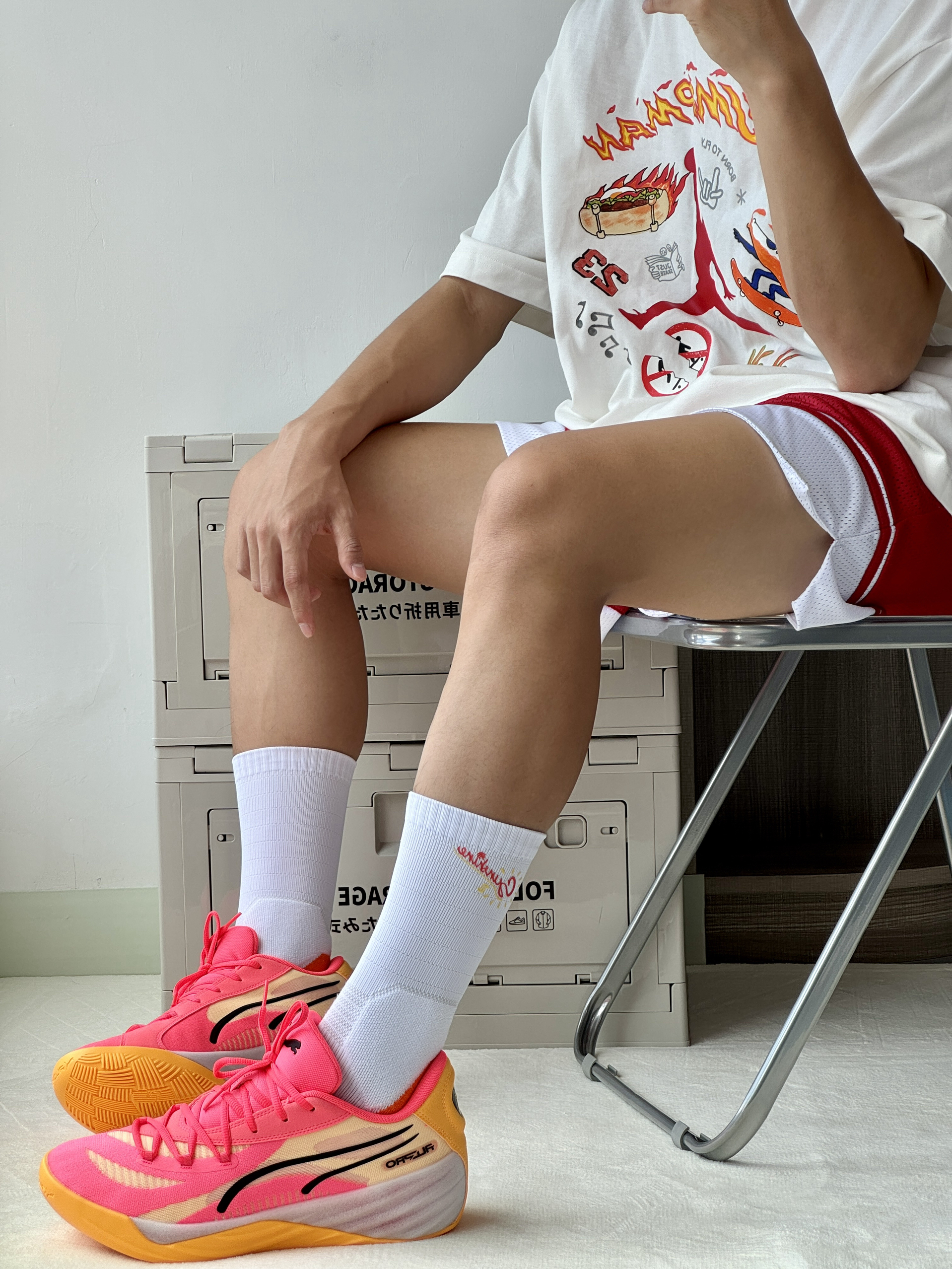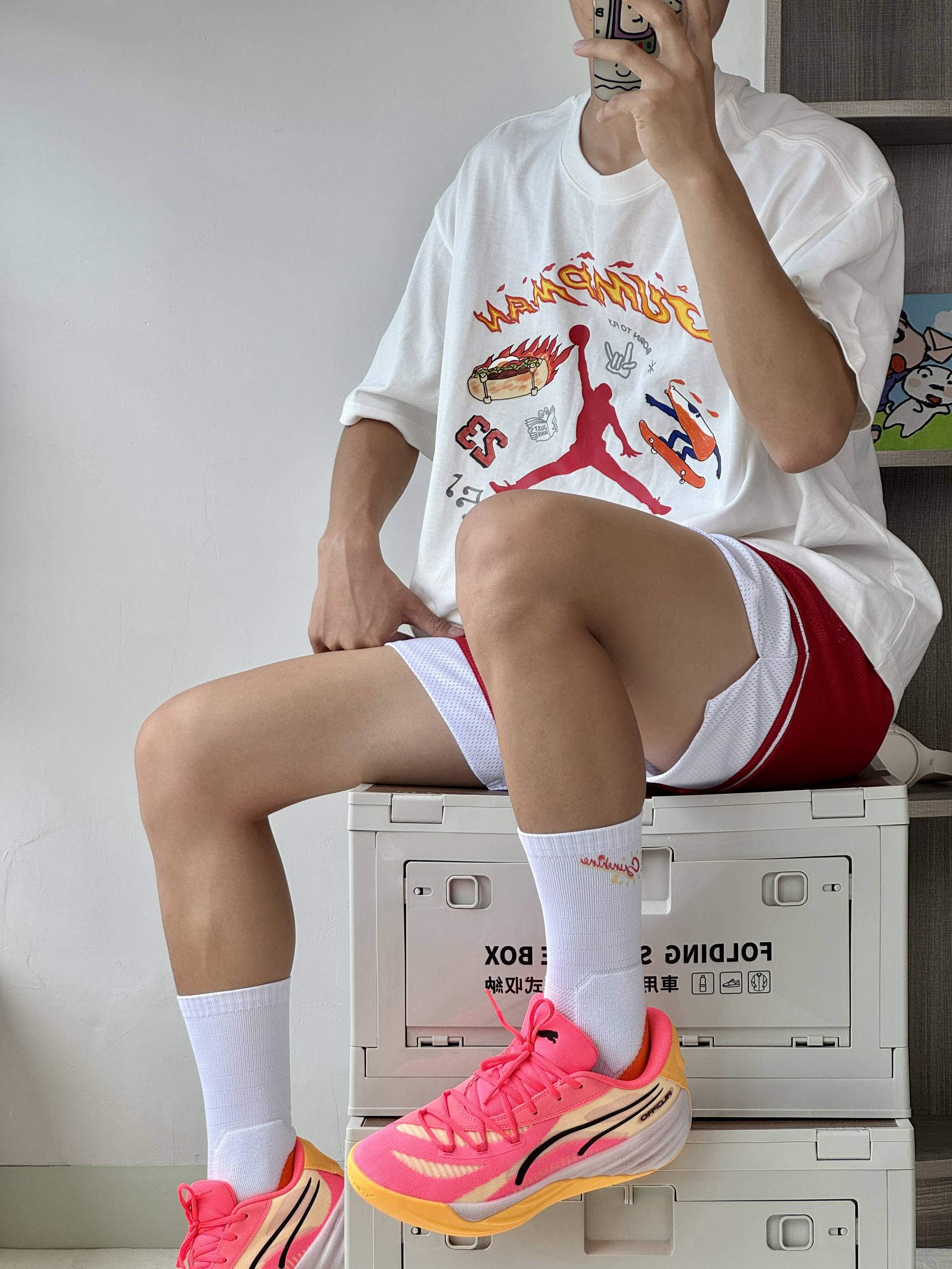 oi夏日打球穿搭怎么能不爱穿鲜艳的颜色呢吸睛又好看球场回头率超高! 👔 一件白红火焰运动短袖上面的卡通印花非常的好看搭配起来也十分眼 🩳 白红拳击短裤很有趣的款式上身百搭帅7 👟 彪马All-Pro Nitro热度颜值都很高的一双球鞋最近新出的粉橙色上脚还可以球场寄穿它