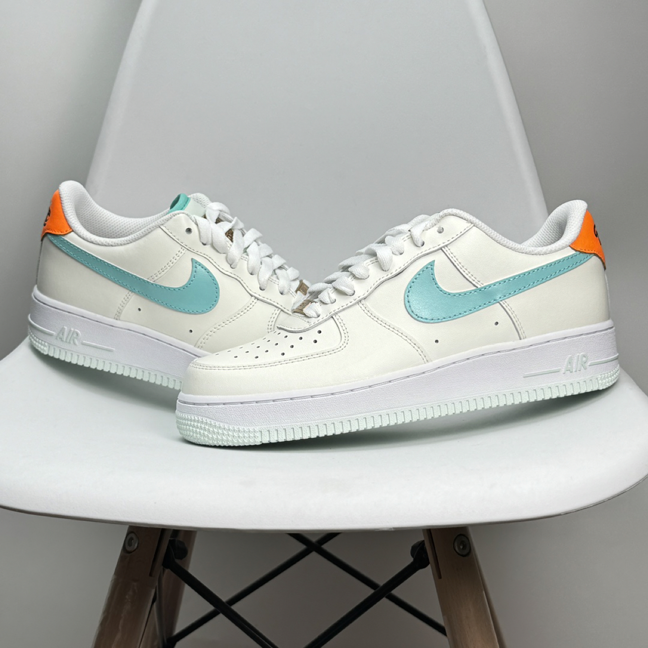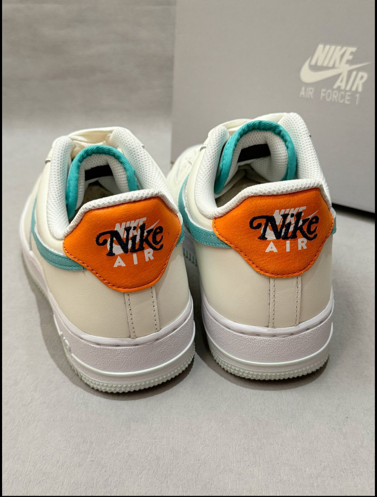 Nike Air Force 1低帮板鞋 男款 米色鞋身,搭载绿色logo,夏日氛围感浓郁后跟处橙色双swoosh点缀,靓丽夺目,hin适合夏日穿着 内置Air气垫,带来舒适jio感 平时配搭牛仔裤、篮球裤帅气十足