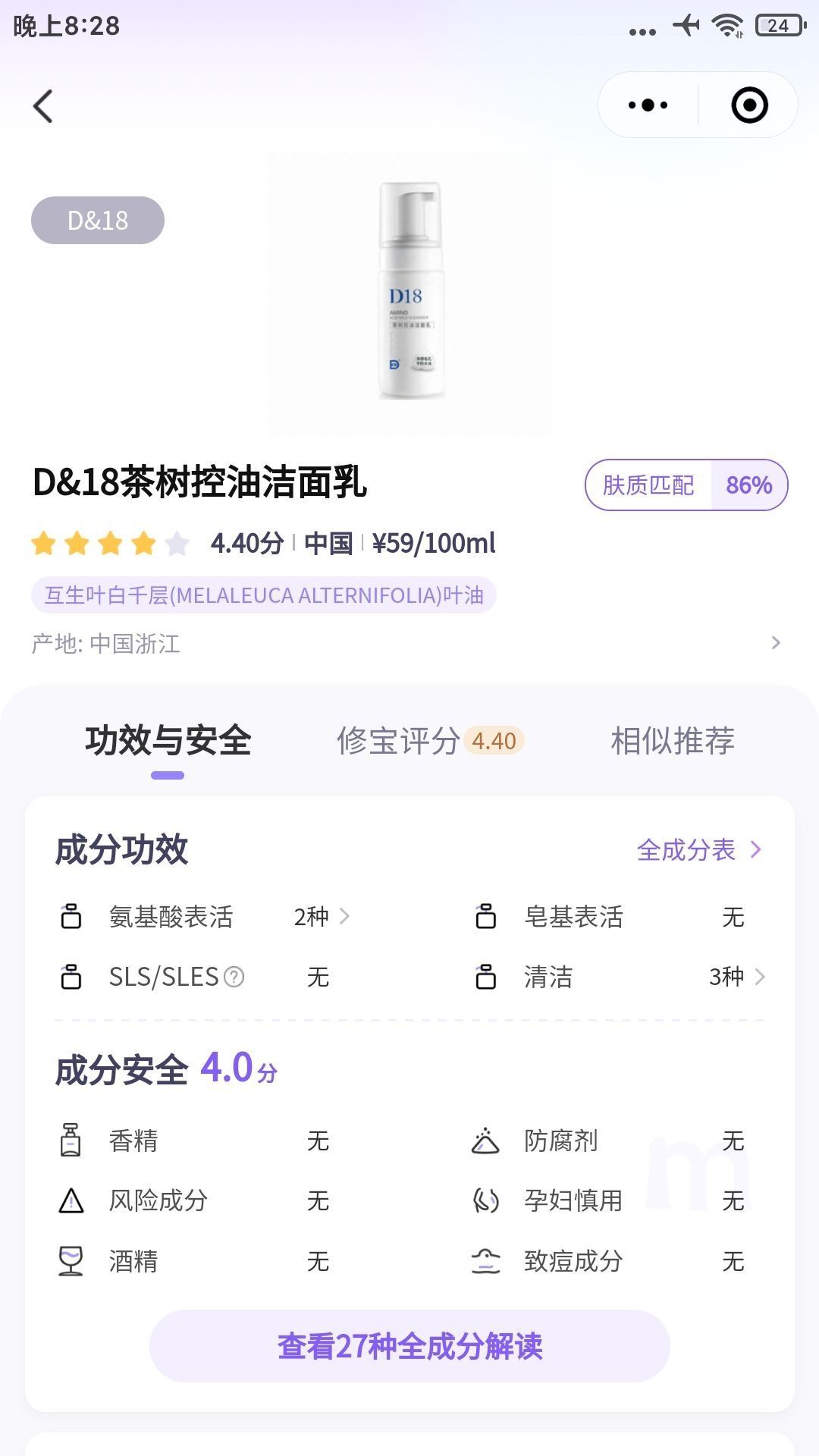 D18茶树控油洗面奶成分安全,无香精无防水腐剂无酒精孕妇安心用。洗完脸不紧绷,有淡淡的茶树香,可以洗掉一些黑头,使用起来很方便,一按就有泡沫。平价洗面奶,学生党放心用。价格便宜用起来完全不心疼,适合大部分肤质的人用。绝对是平价小众,适合学生党日常清洁,专用的一款洗面奶。