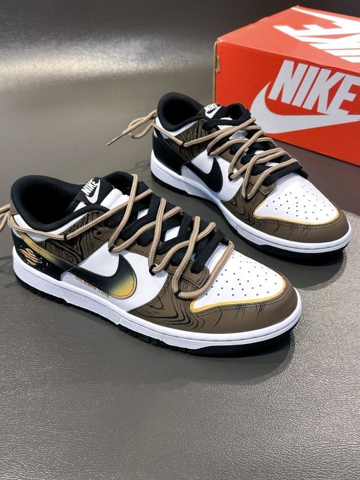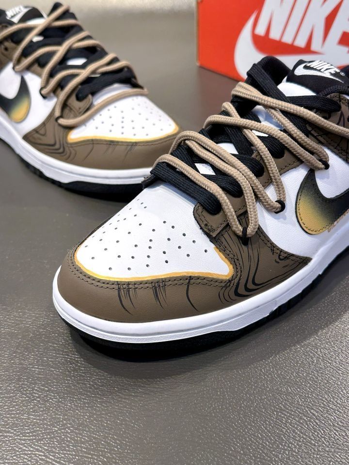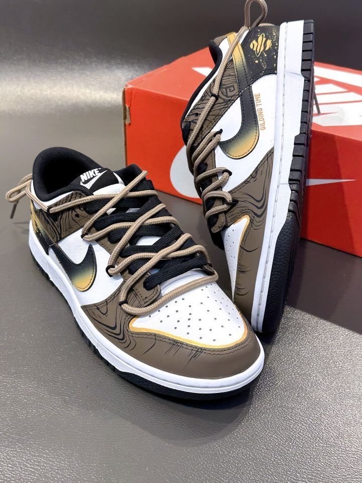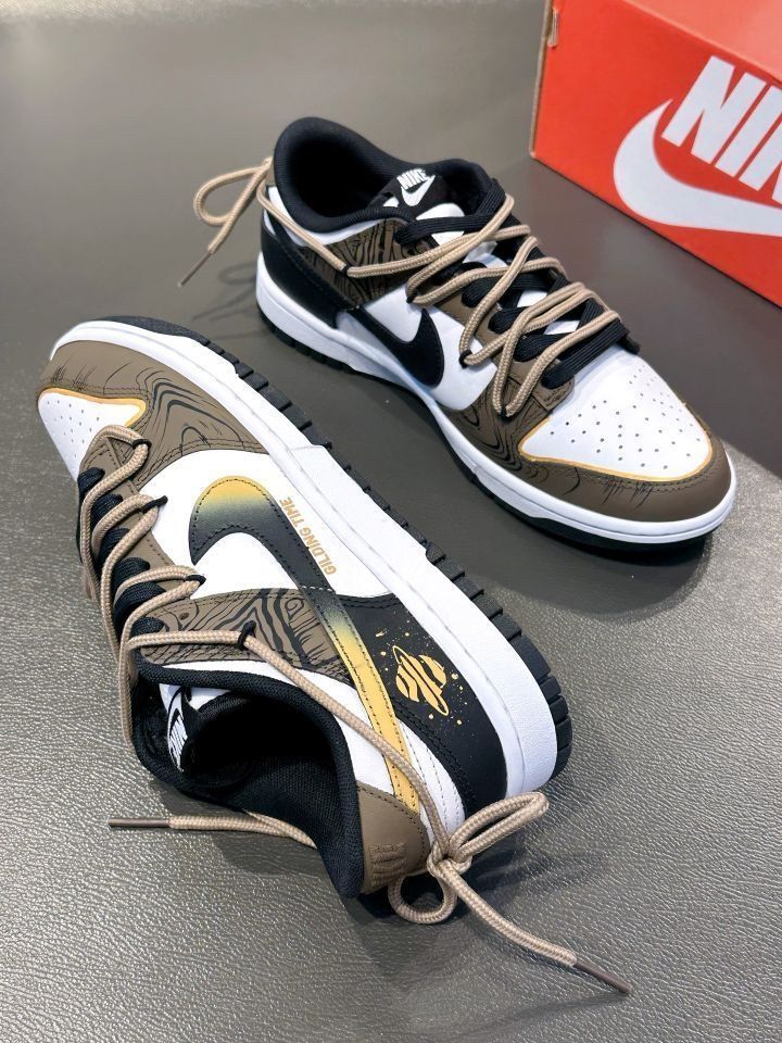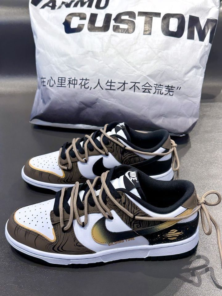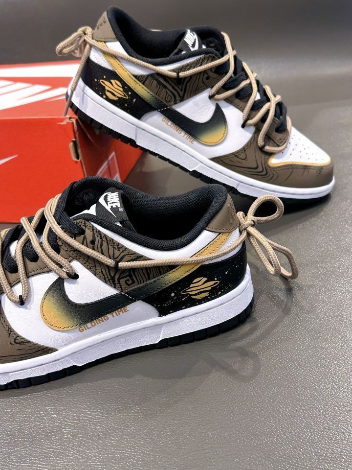 定制款黑棕 Dunk "流金岁月" 黑白棕的配色,金色加以点缀,高级感十足 鞋侧Swoosh 晕染设计,后跟星球涂鸦 有种美式复古感! 双鞋带解构设计,鞋面看起来吼丰富的! 七夕搭个情侣款出街氛围感到位