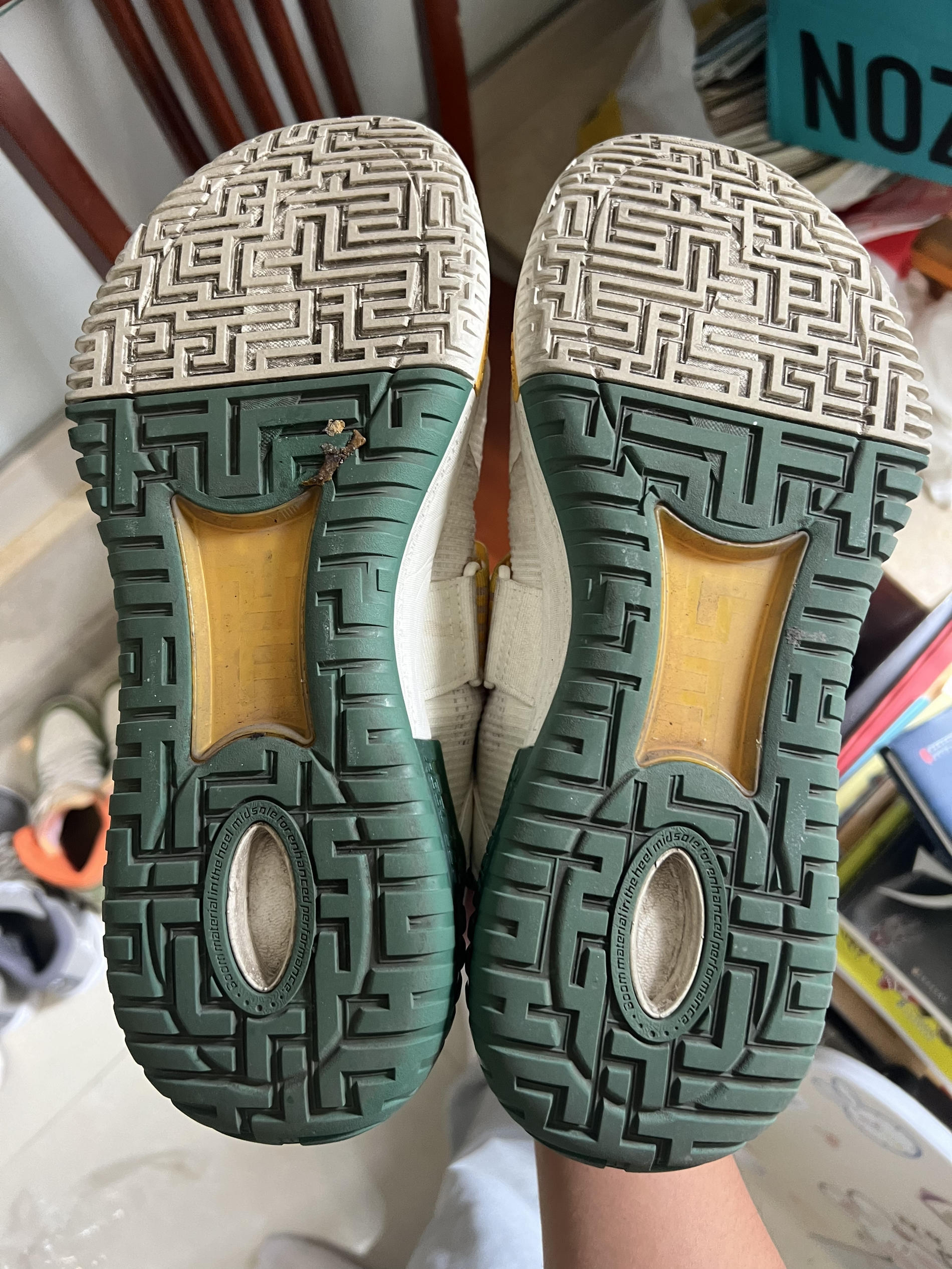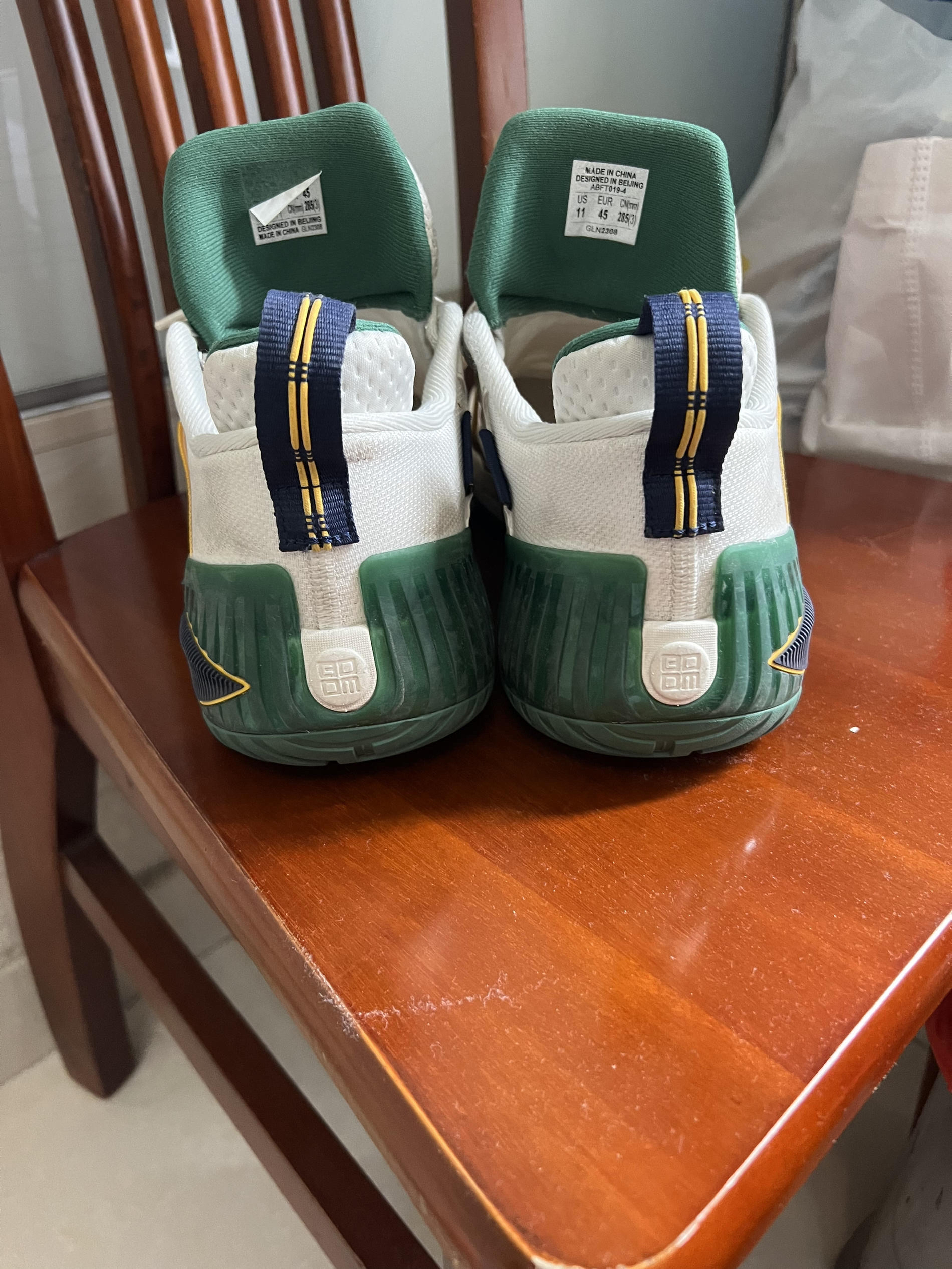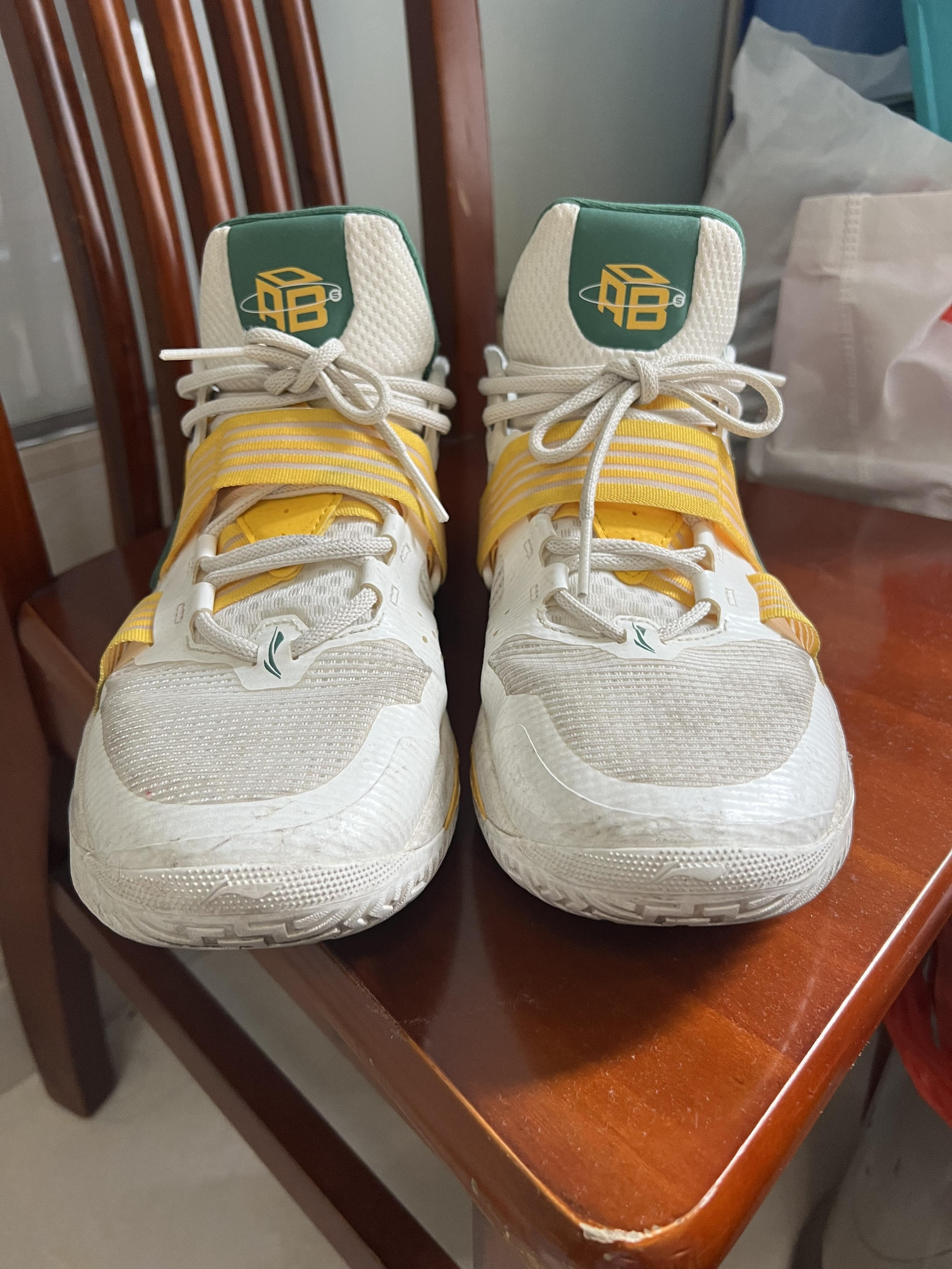 👟球鞋名称:狂怒一代 📌是否偏码【偏大/不偏码/偏小】:偏小 ⛹️性能打分(每项满分均为10): 包裹:10 缓震:8 抓地:10 耐磨:10 稳定:9 防侧翻:9 透气:7 📖总结评价:鞋子本体以白色为主色调,黄色和绿色辅助点缀。 鞋面由多层网纱织物组成,透气性较差,但强度够,鞋面不易清洁。 全掌Light Foam plus泡棉加后掌一块还算大的䨻,踩开后脚感十分明显。 鞋子有一个大魔术...