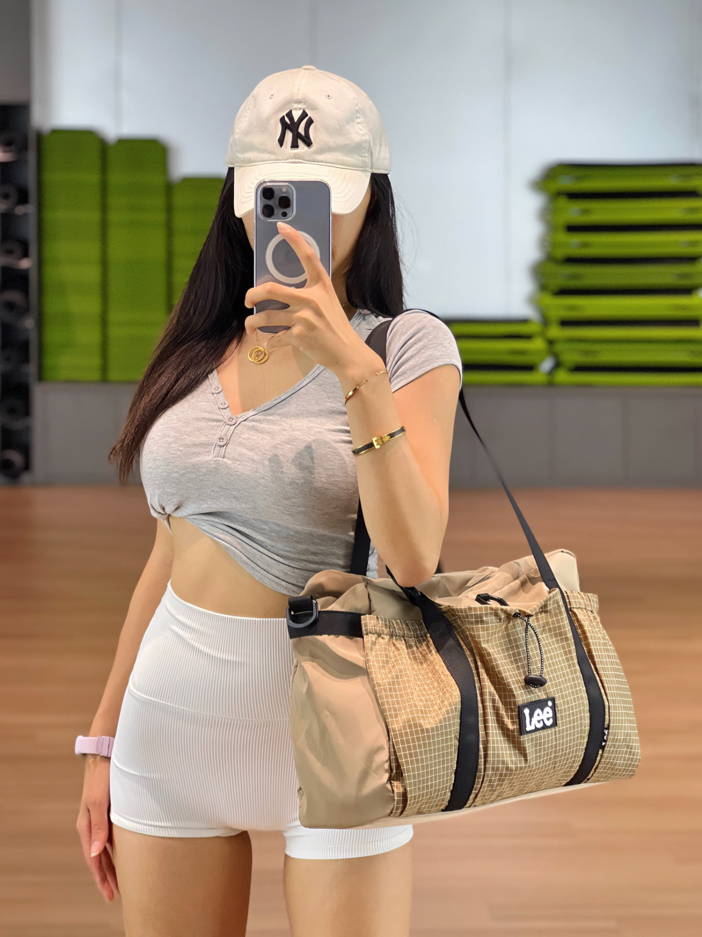 嗨~ 今天也是好好训练的一天哦 练完回家啦 💗今日穿搭 灰色短款上衣➕白色瑜伽短裤➕黑白配色腿袜 一套搭配尊嘟很好看!! 超有Y2k甜酷辣妹风的感觉 💼 #Lee 卡其格子健身包!!上身背着超级好看~ 服装匹配度也很高,日常百搭的一款健身包 容量很大,平时健身毛巾水杯蛋白粉都可以装下,而是一点都不会鼓包哦~ 自重很轻,女生宝宝背上也不会觉得累!! 背法也很多,斜挎单肩手提都可以,宽肩带长时间...