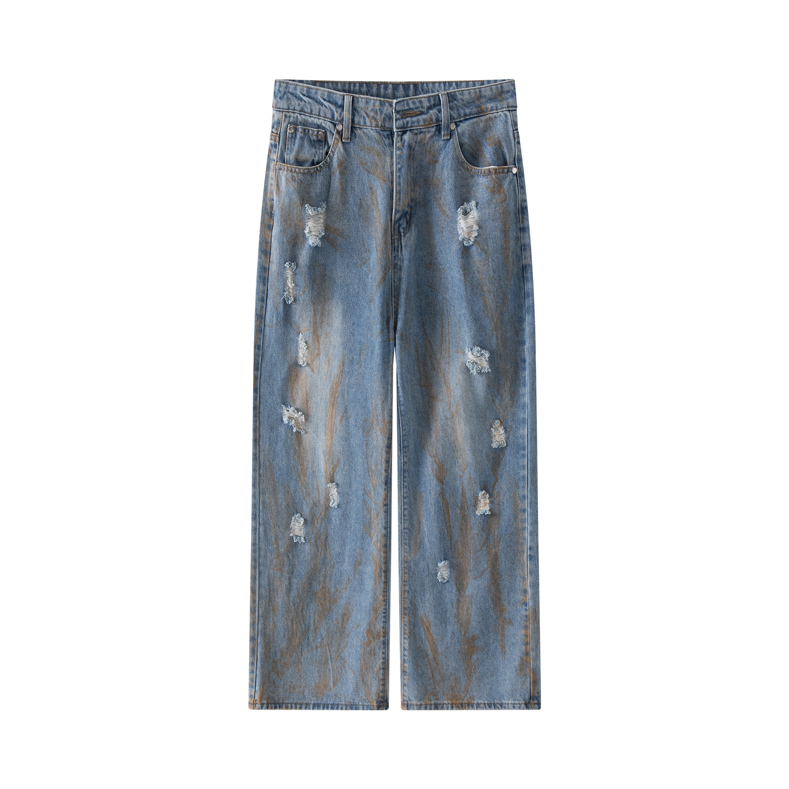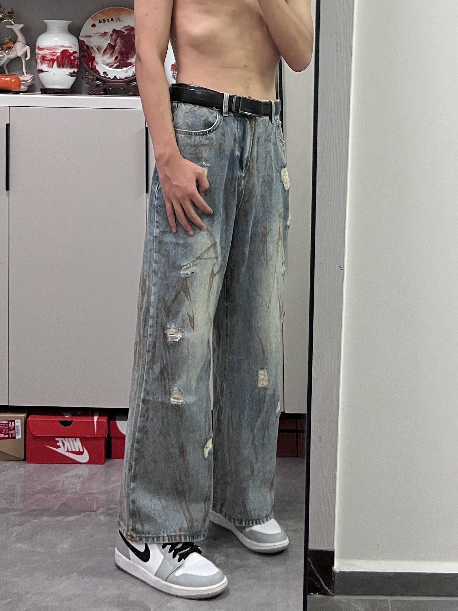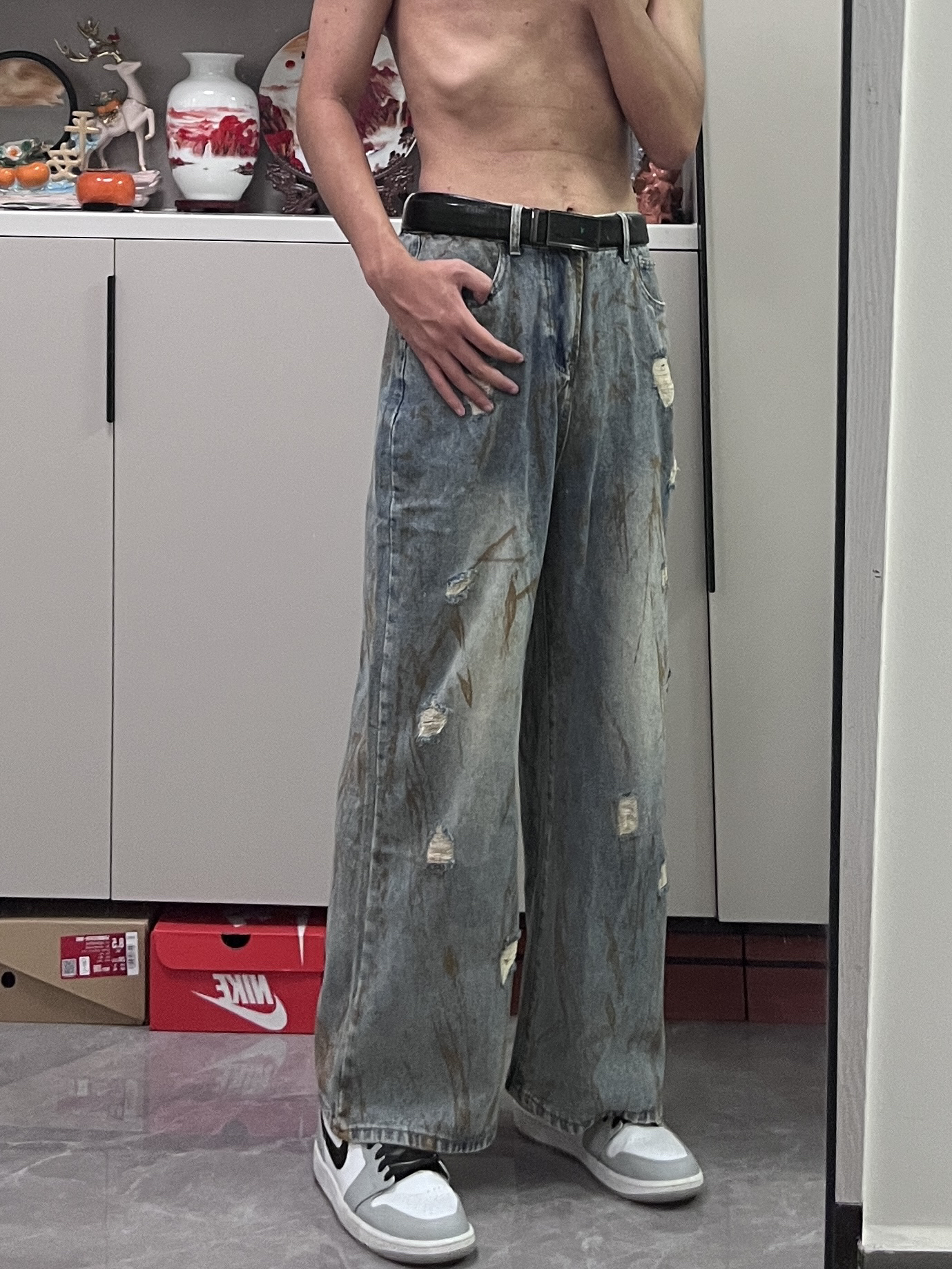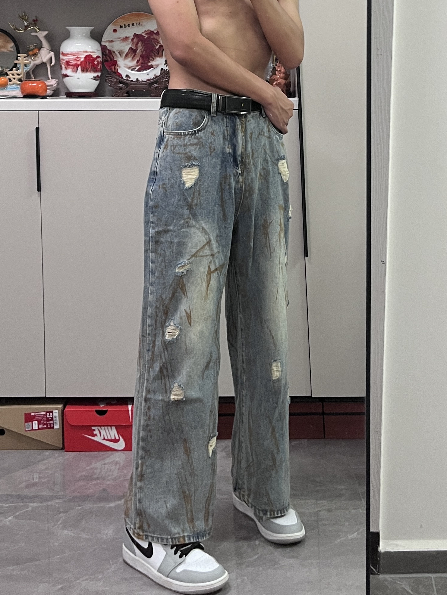 这条牛仔裤真的爱了,宽松直筒的版型上身显高显腿长,破洞和刷漆的设计也很赞