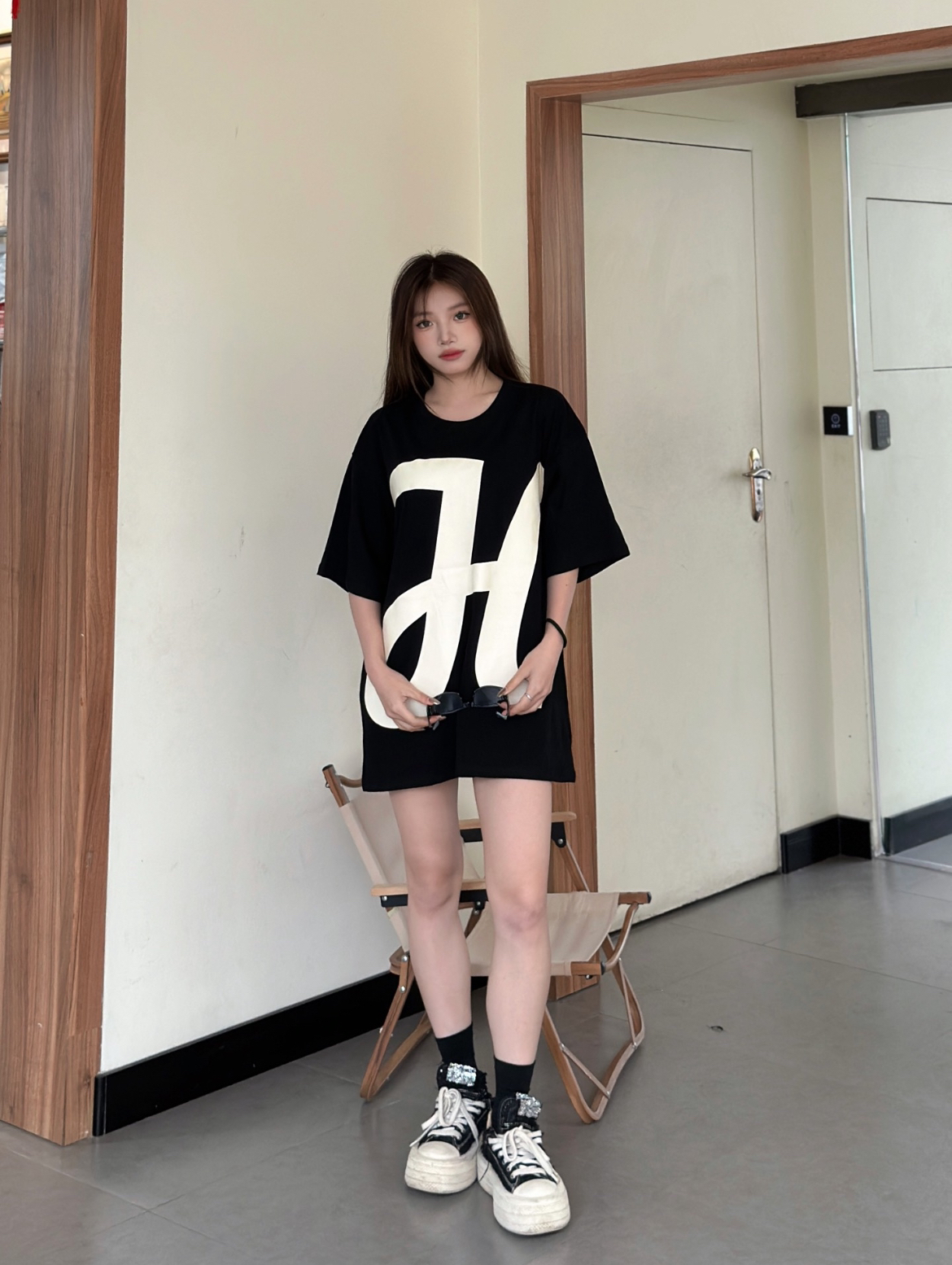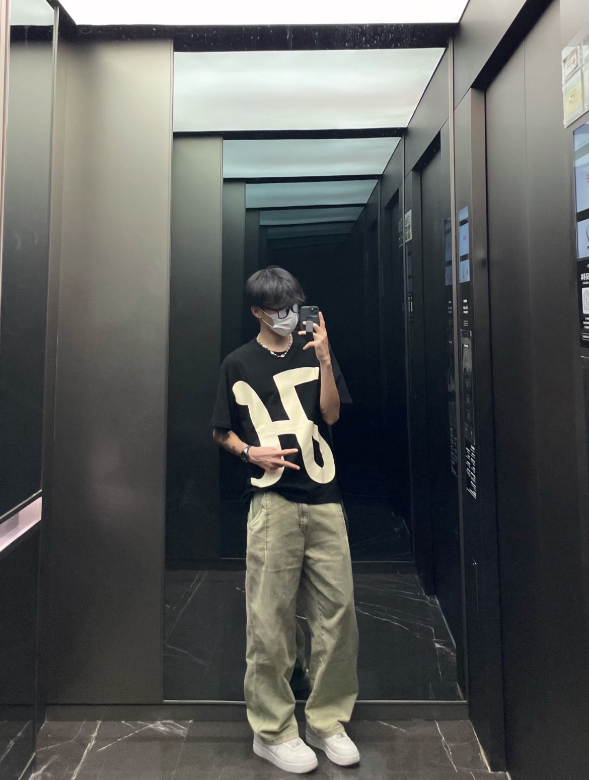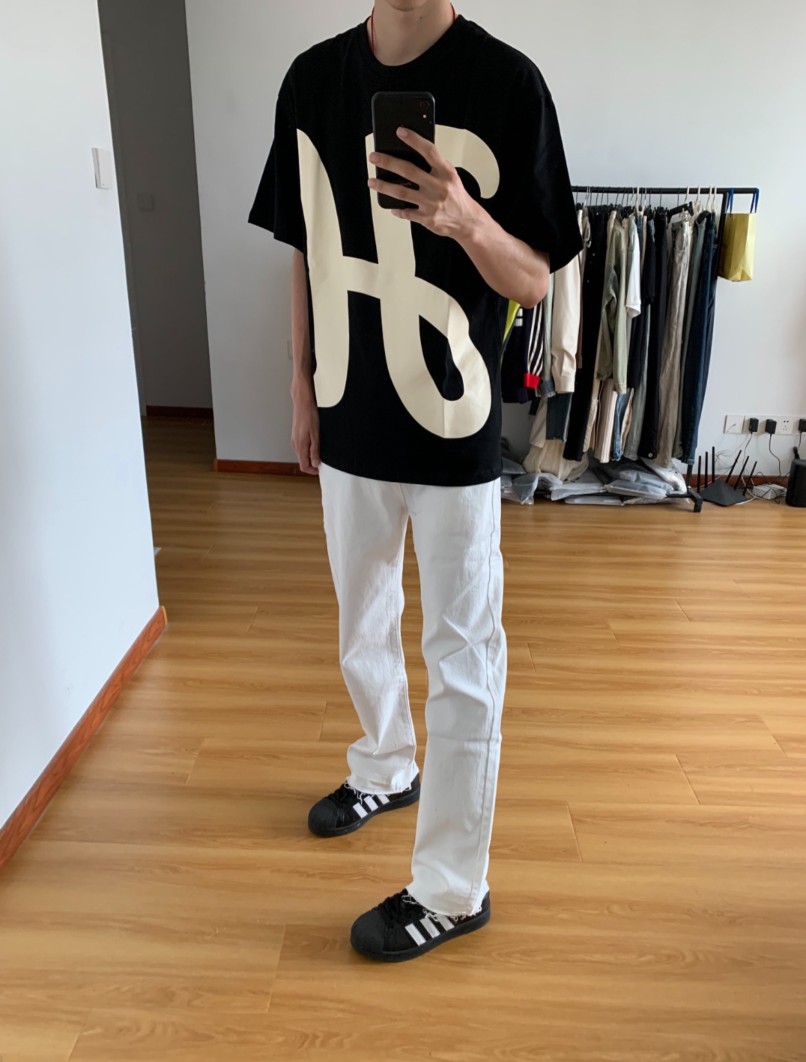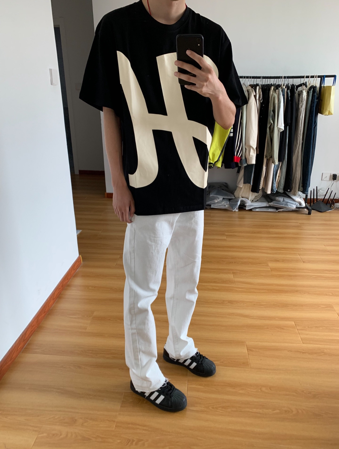 这一套穿起来是真的很酷,T恤上的大面积印花看起来真的帅,搭配上一条牛仔裤,简直就是夏日搭配神器,衣服的宽松加上大写H的印花,让人穿起来很有感觉!
