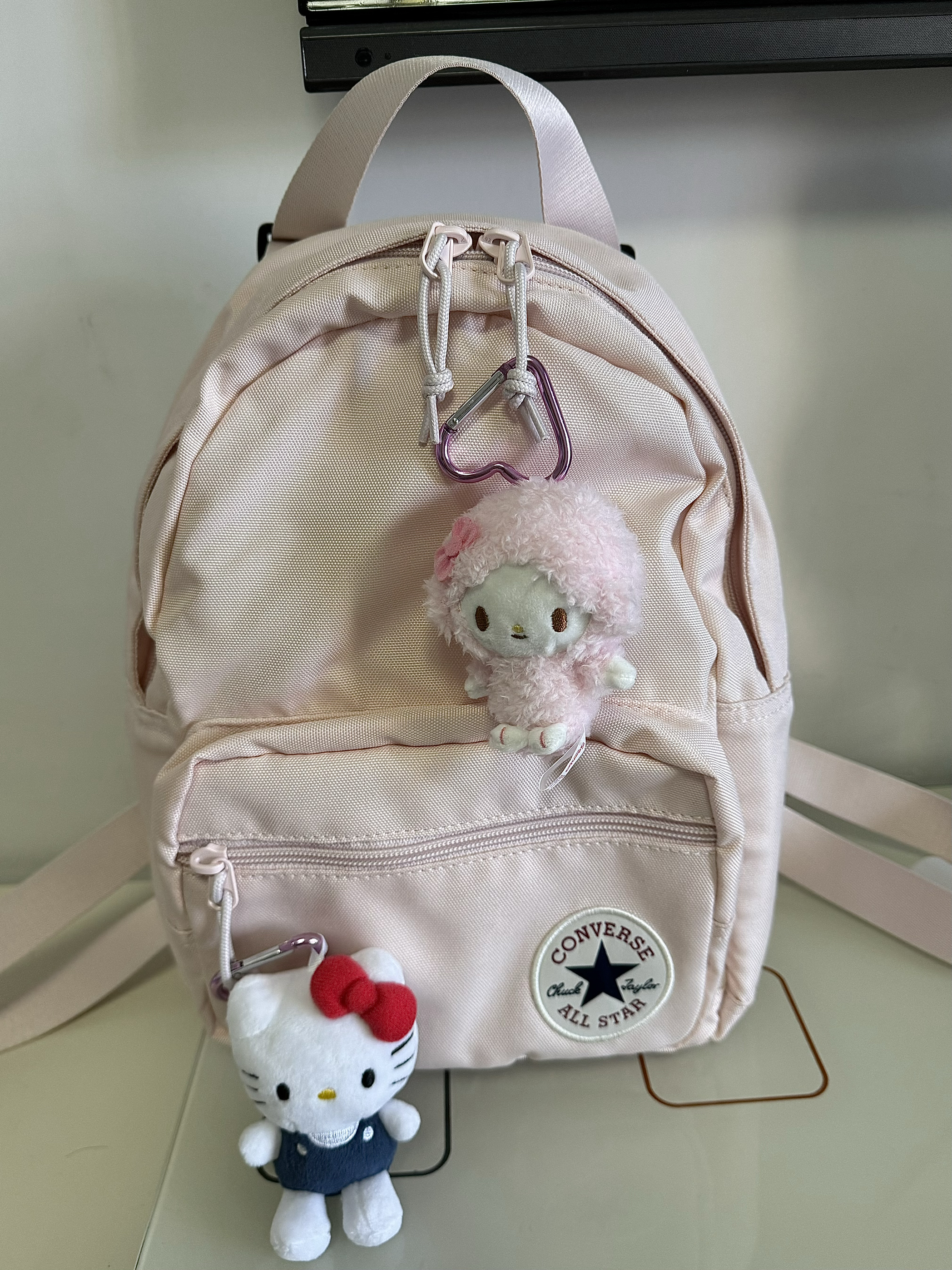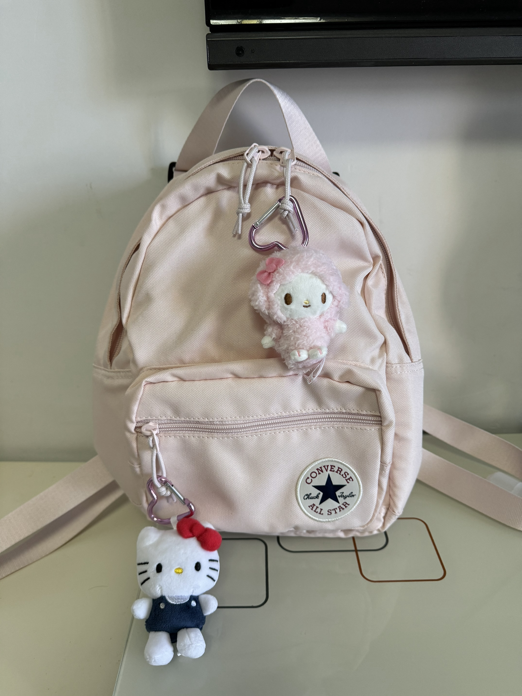今天分享滴是我新买滴匡威小书包 整体上都是粉粉滴特别可爱😻 粉粉滴很安心哈哈哈😆 而且书包也不是特别小! 有A4纸差不多大小噢! 很适合出门旅游或者上学背! 搭配上特意买的挂件太可爱了!