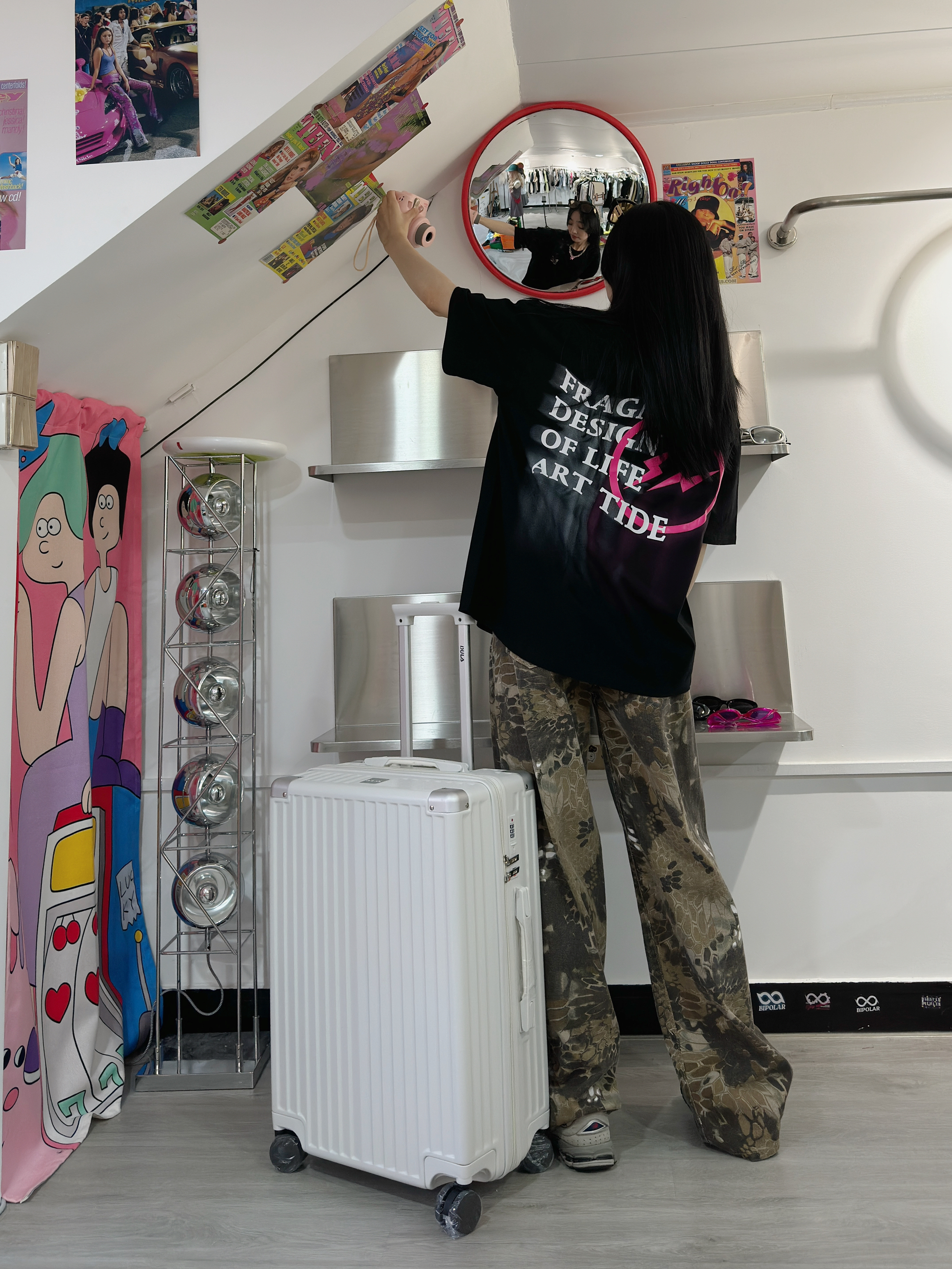 来看看今日份的高街look 黑色的T恤好酷哇 黑粉组合很顶 喜欢背面的字母印花 搭配上迷彩宽松长裤 街头感十足 暑假暑假 出去旅游避暑啦~ 带上我滴奶呼呼的行李箱 大大的容量装下了我七天出行要用的东西 行李箱后面还有个可以放水的杯架 尊嘟很方便啦~