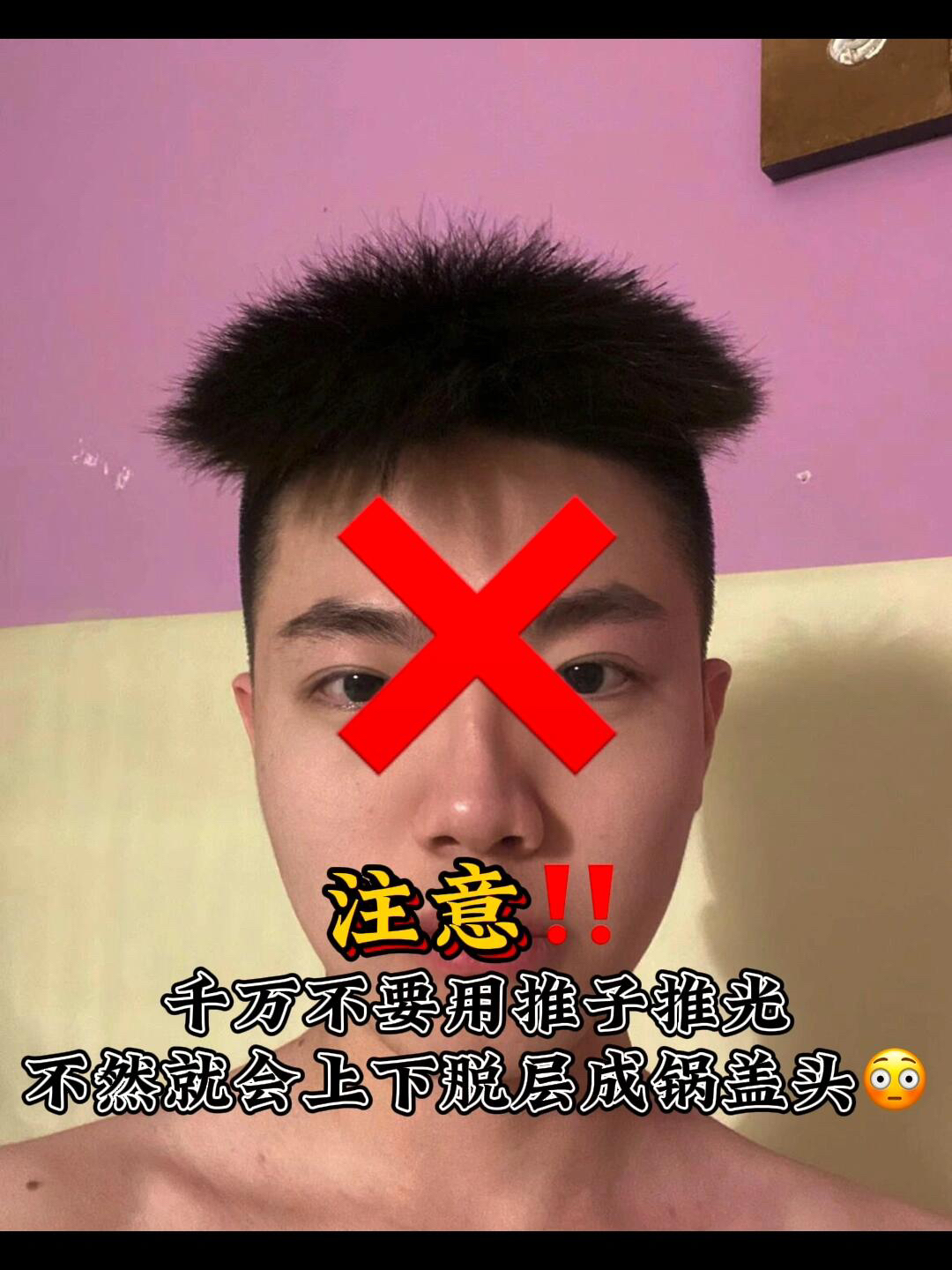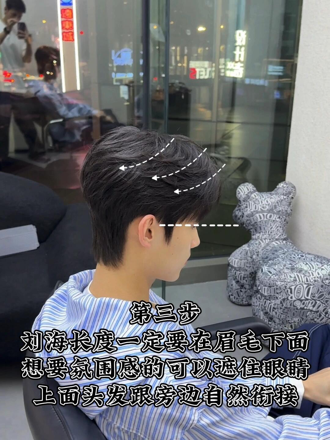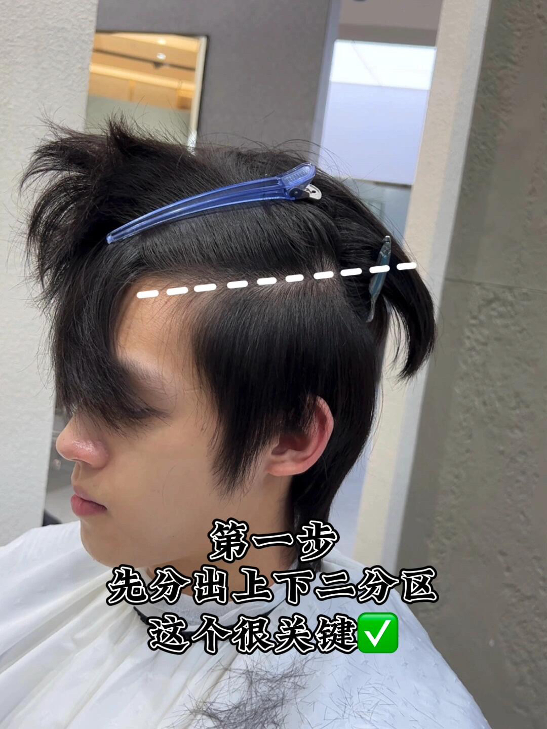 第一步 先分出上下二分区 这个很重要✅ 第二步 两边用剪刀自然修剪✂️ 长度保留在1到2厘米左右 注意‼️‼️ 千万不要用推子推光 不然就会上下脱节变成锅盖头😳 第三步 刘海长度一定要在眉毛下面 想要氛围感的可以遮住眼睛👀 上面头发跟旁边自然衔接 第四步 头发比较直的贴头皮的 可以烫一个气垫烫,烫型不烫卷✅ 看完了可以点赞保存下来 下次剪头发给托尼老师看✅