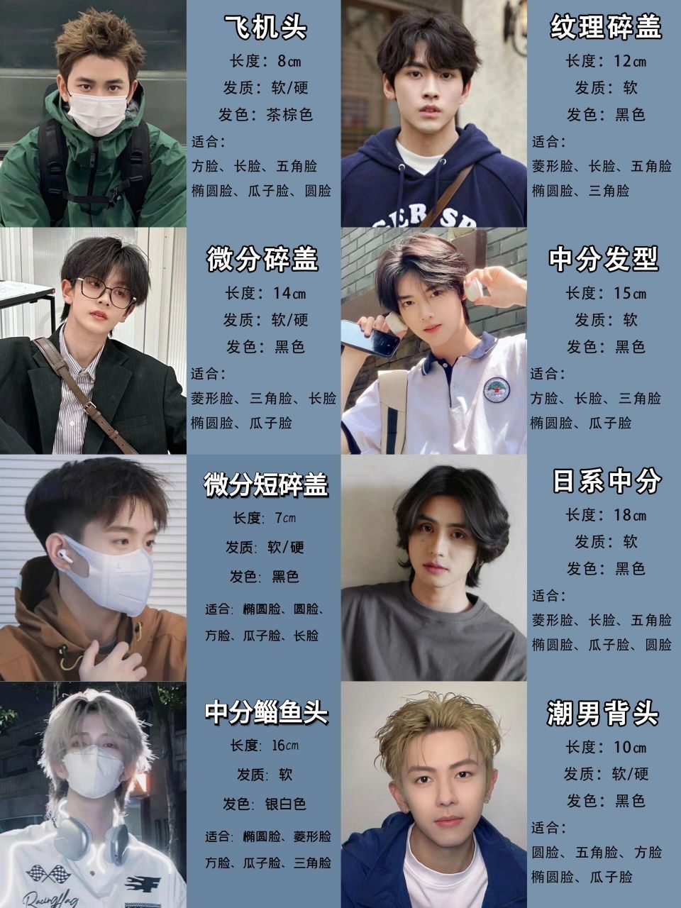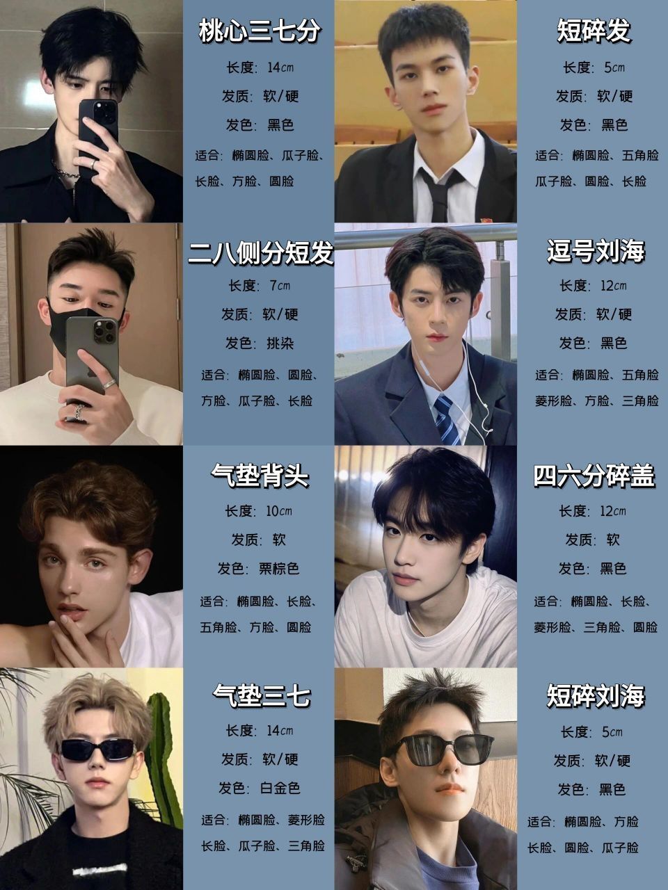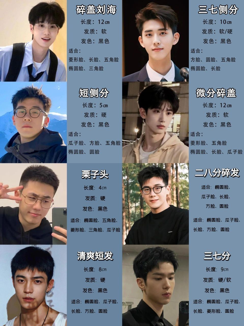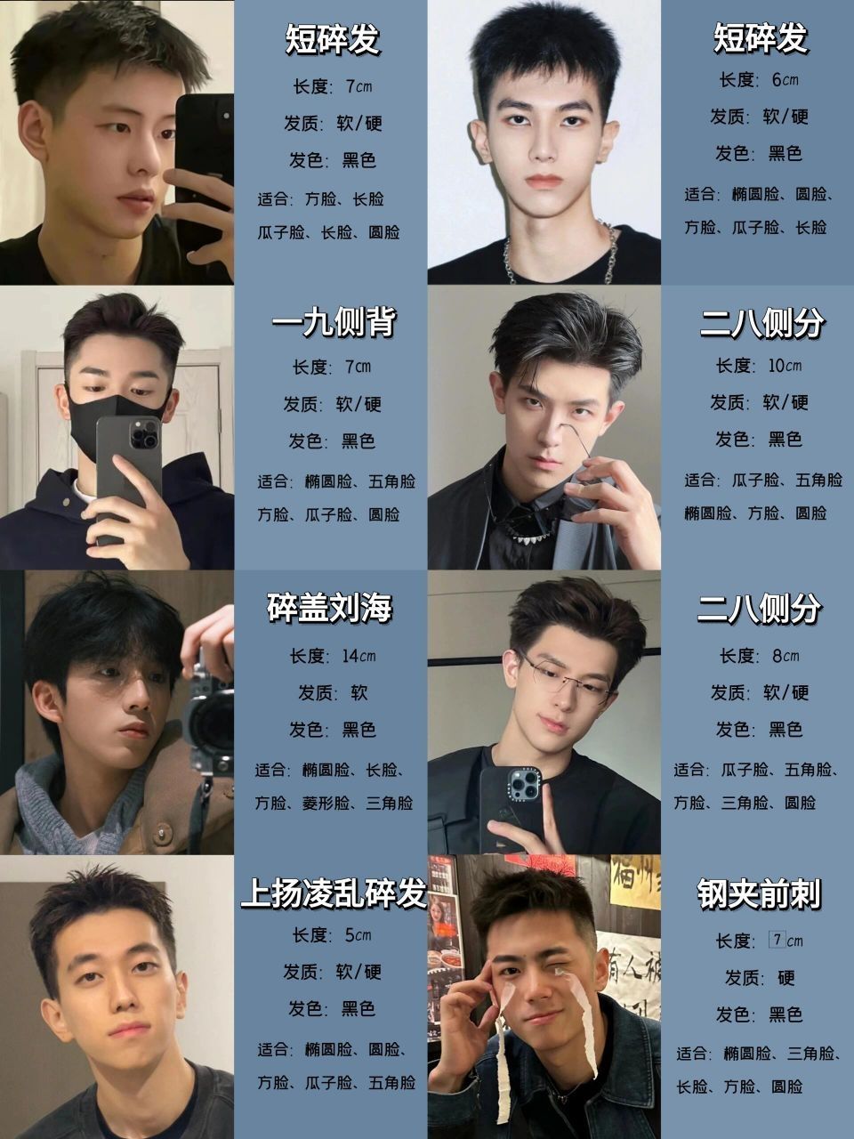 长形脸型的男生适合选择一些能够增加脸部宽度感的发型。可以选择一款有层次感的短发,将头发蓬松起来,增加侧面的宽度感。避免选择过于紧贴头皮的发型,会强调脸部的长度。