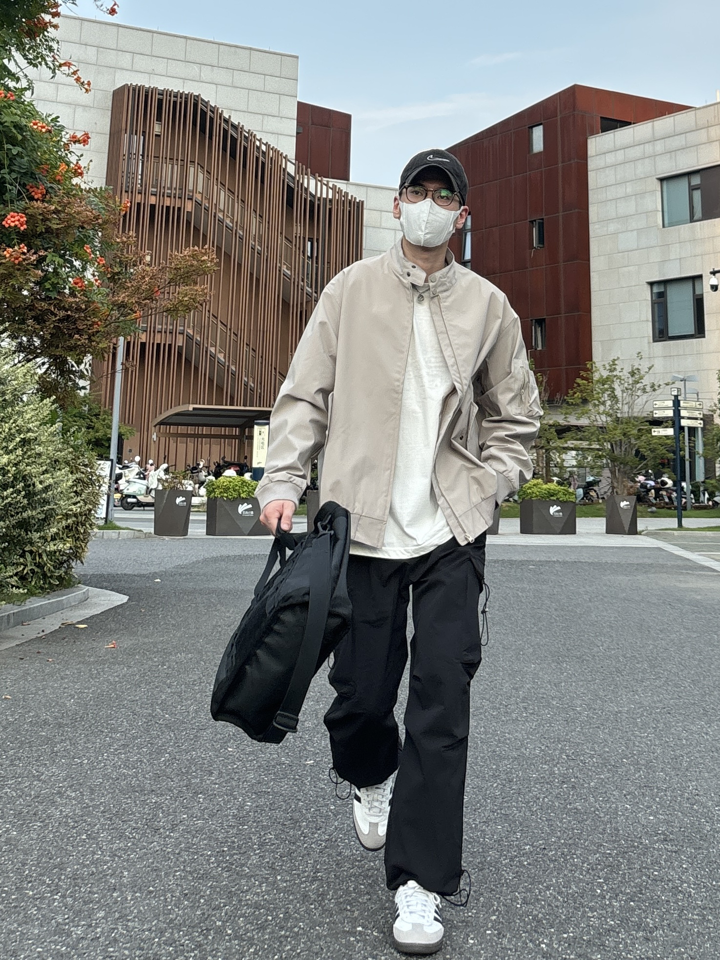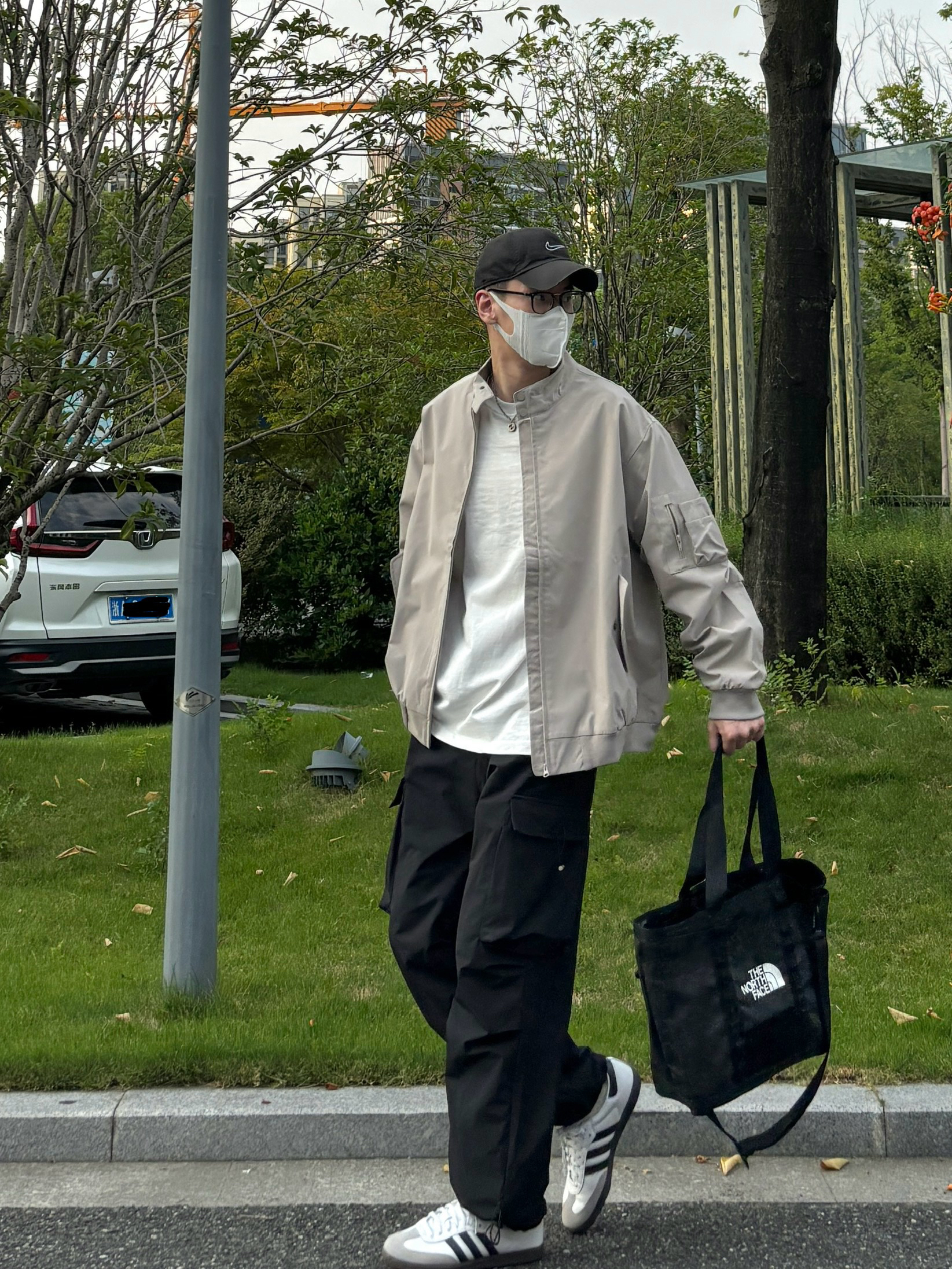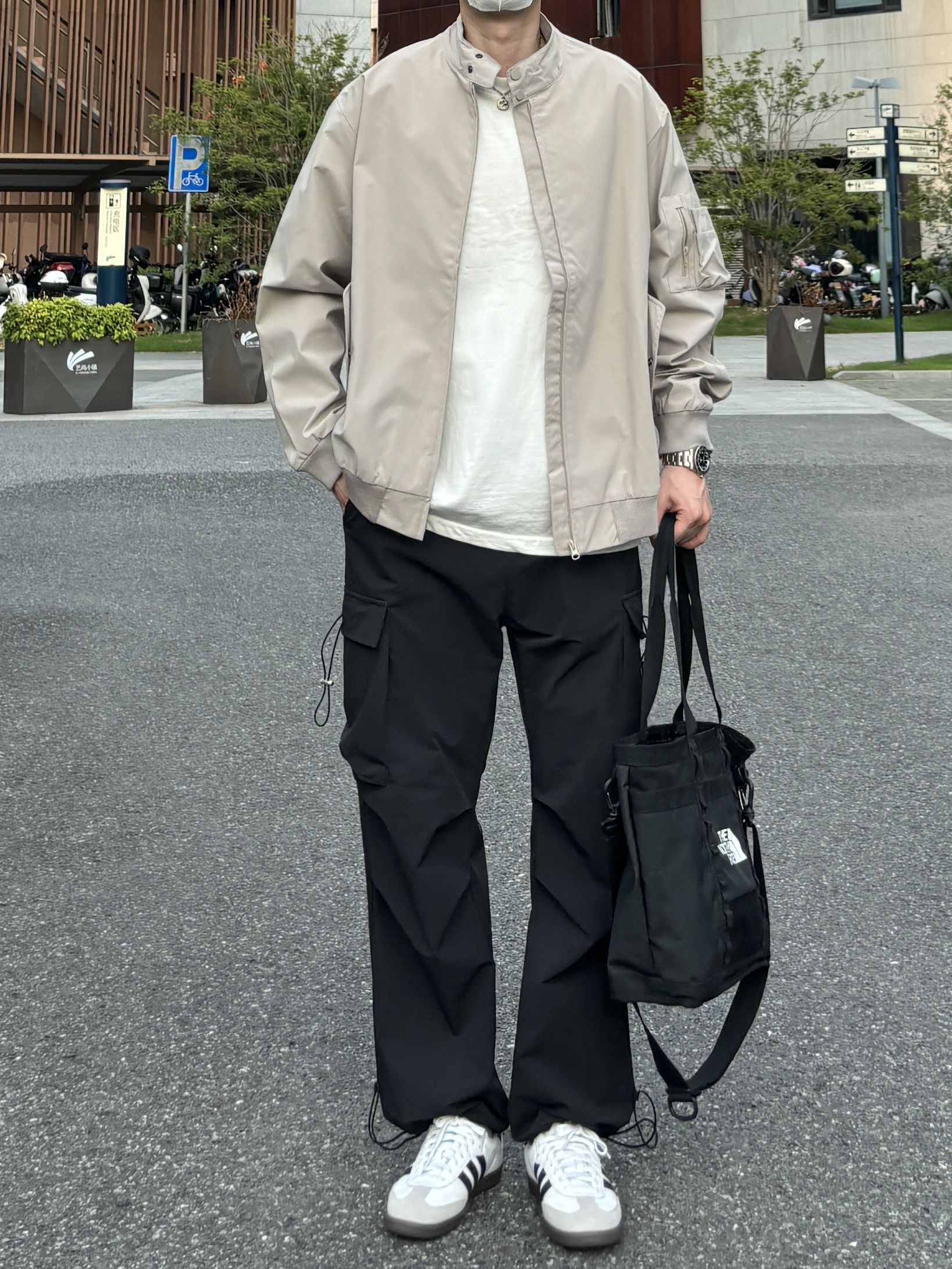 今天这套上衣穿了一件杏色宽松阔版多口袋立领飞行员夹克 ⬇️ 裤子选择不挑腿型的黑色直筒抽绳系带机能伞兵裤 ⬇️ 鞋子上脚简约百搭的黑白samba德训鞋 ⬇️ 最后拿上北面防水托特包 - 今日搭配 衣服裤子都来自:NICE LILI 鞋子:adidas samba