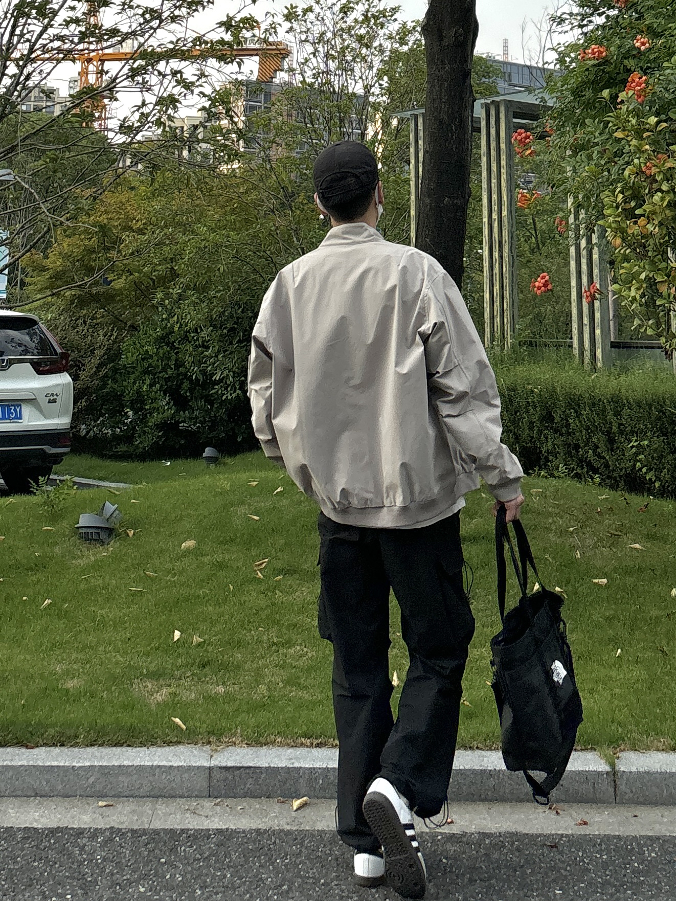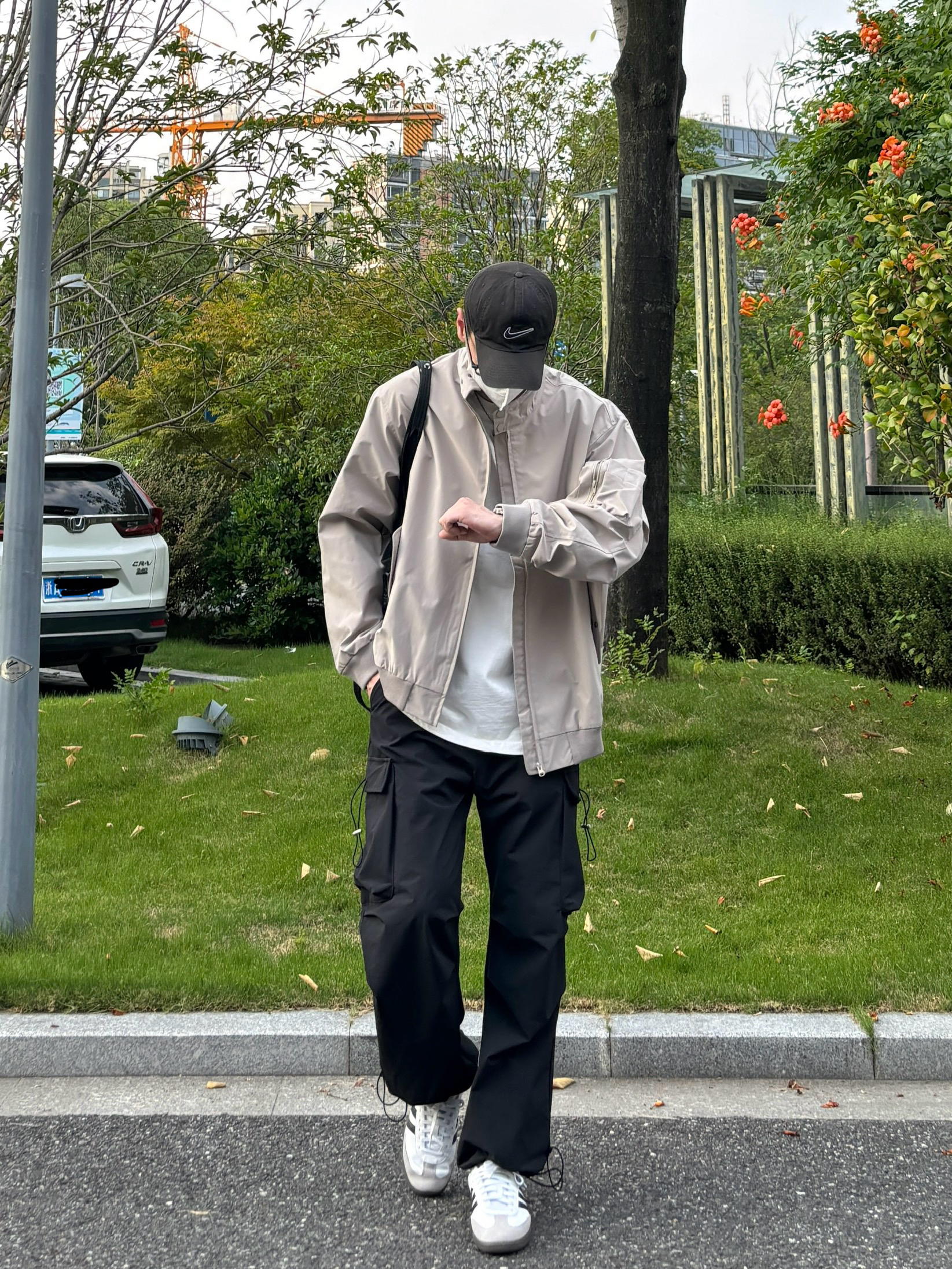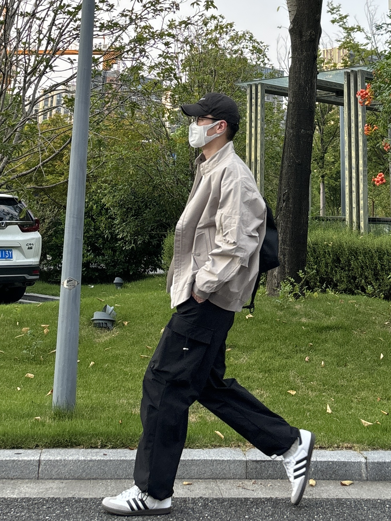 今天这套上衣穿了一件杏色宽松阔版多口袋立领飞行员夹克 ⬇️ 裤子选择不挑腿型的黑色直筒抽绳系带机能伞兵裤 ⬇️ 鞋子上脚简约百搭的黑白samba德训鞋 ⬇️ 最后拿上北面防水托特包 - 今日搭配 衣服裤子都来自:NICE LILI 鞋子:adidas samba