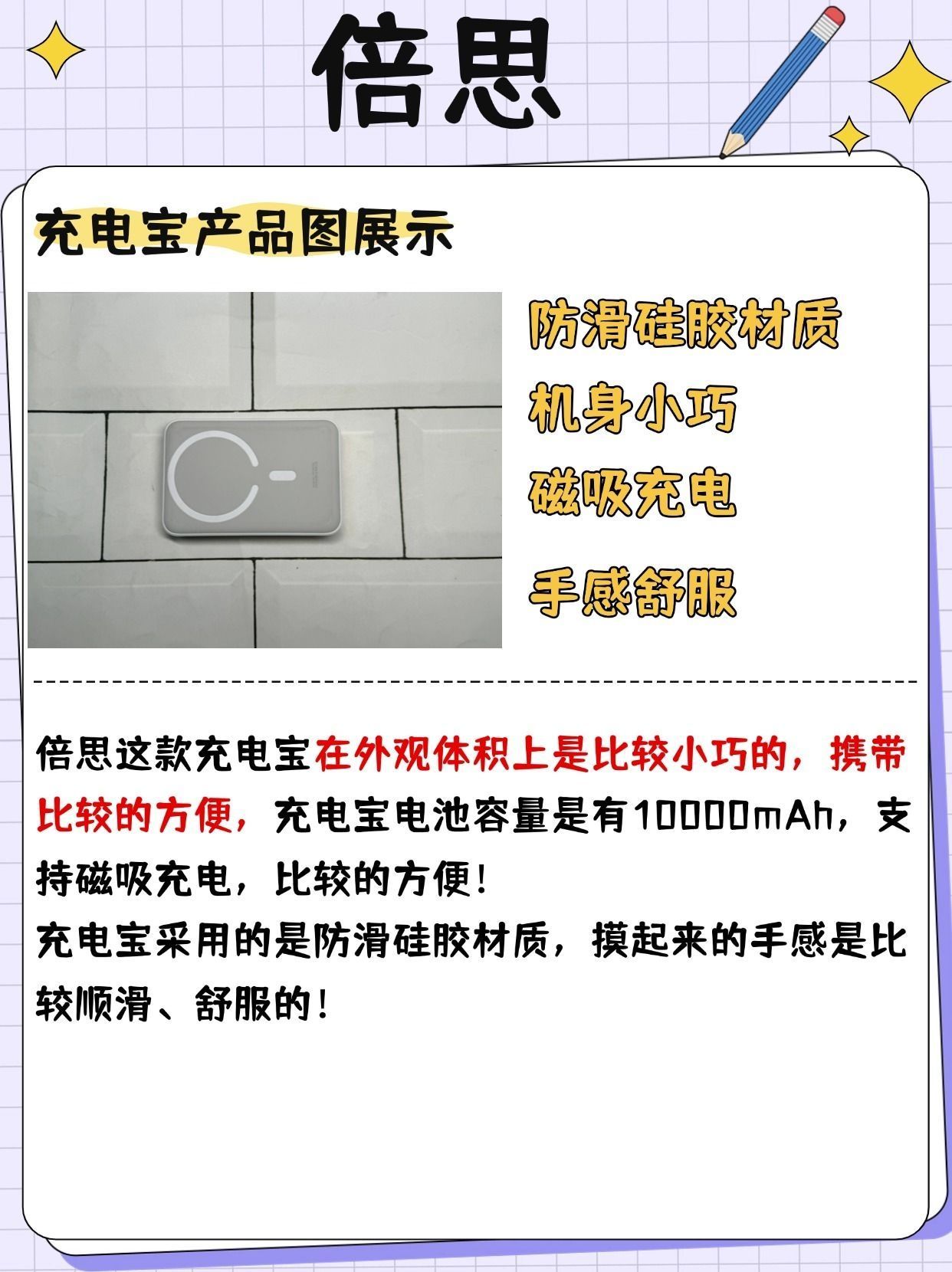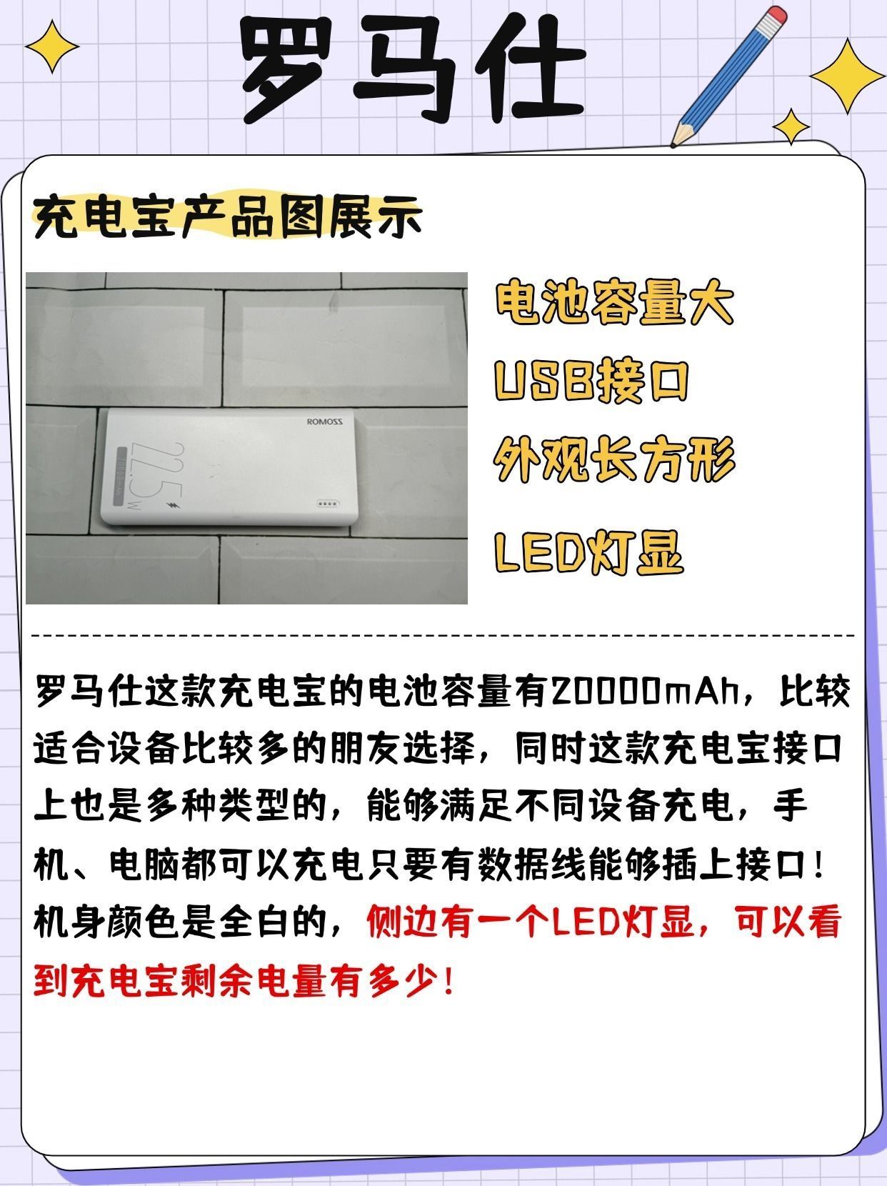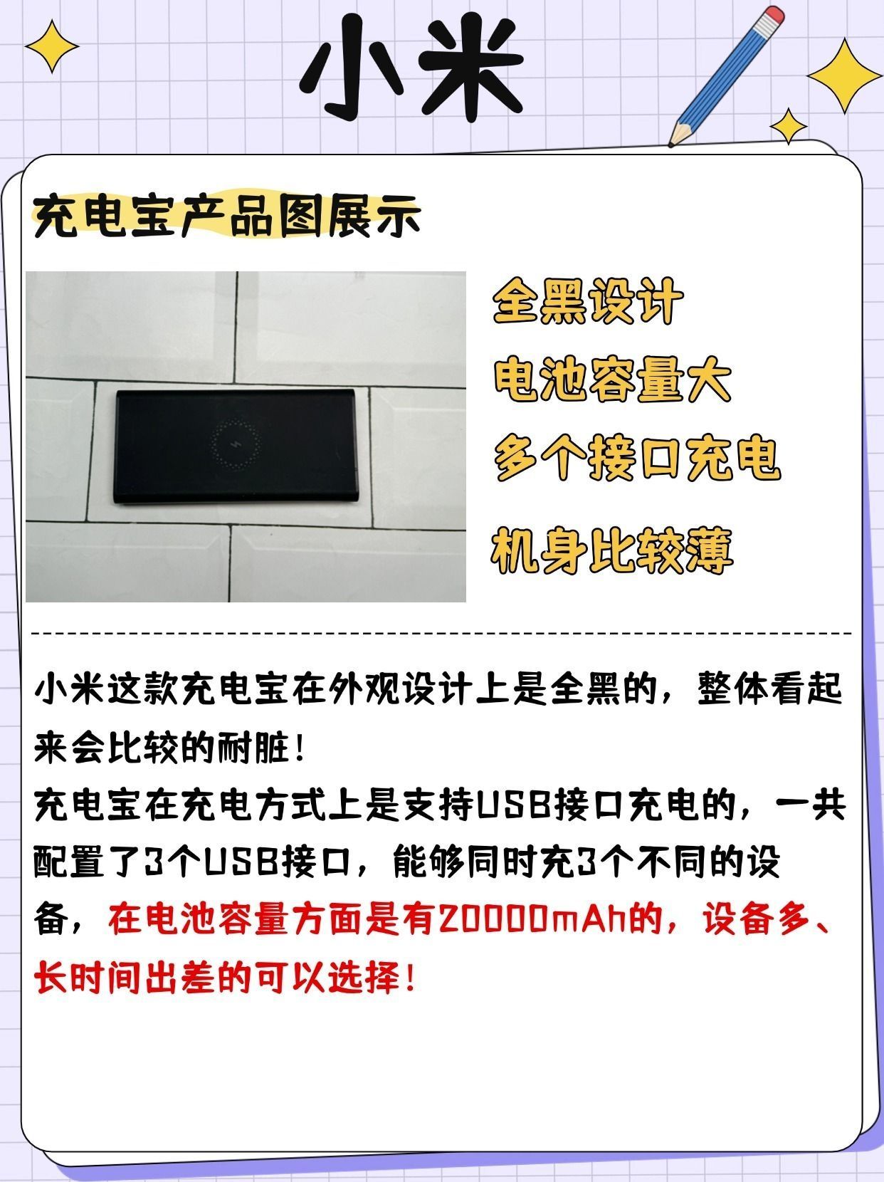 本篇笔记关联了MI/小米 20000mAh 50W 快充 移动电源 三口输出 PD 黑色、ROMOSS/罗马仕 20000mAh PPH80 22.5W 大容量/超级快充移动电源 商务款22.5W、Baseus/倍思 10000mAh 22.5W/30W 磁吸移动电源 快充 超薄 可上飞机 无线充 珍珠白等商品,为用户提供真实的使用体验和购买参考。