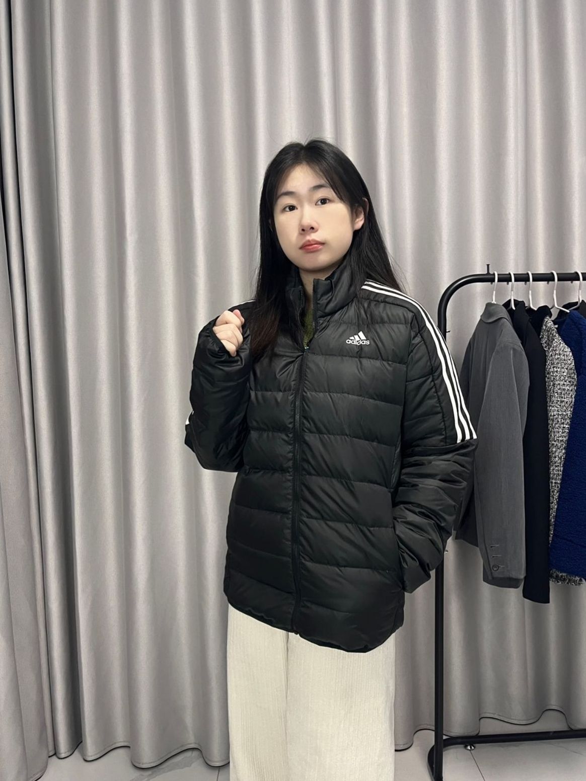 还买了一件戴帽子的🕶️但是太紧身了不好看 退了这个是立领的没有帽子 男女同款宽松一点 可以套卫衣那个套不了1️⃣发现都很薄啊 说的充绒量85但是很轻薄了 不过也挺保暖可能因为是新的 👣特别喜欢这个口袋超级大能装一瓶水! 有一点跑绒& 但是好看的很百搭 通病就是肩膀胖袖子窄像米其林轮胎