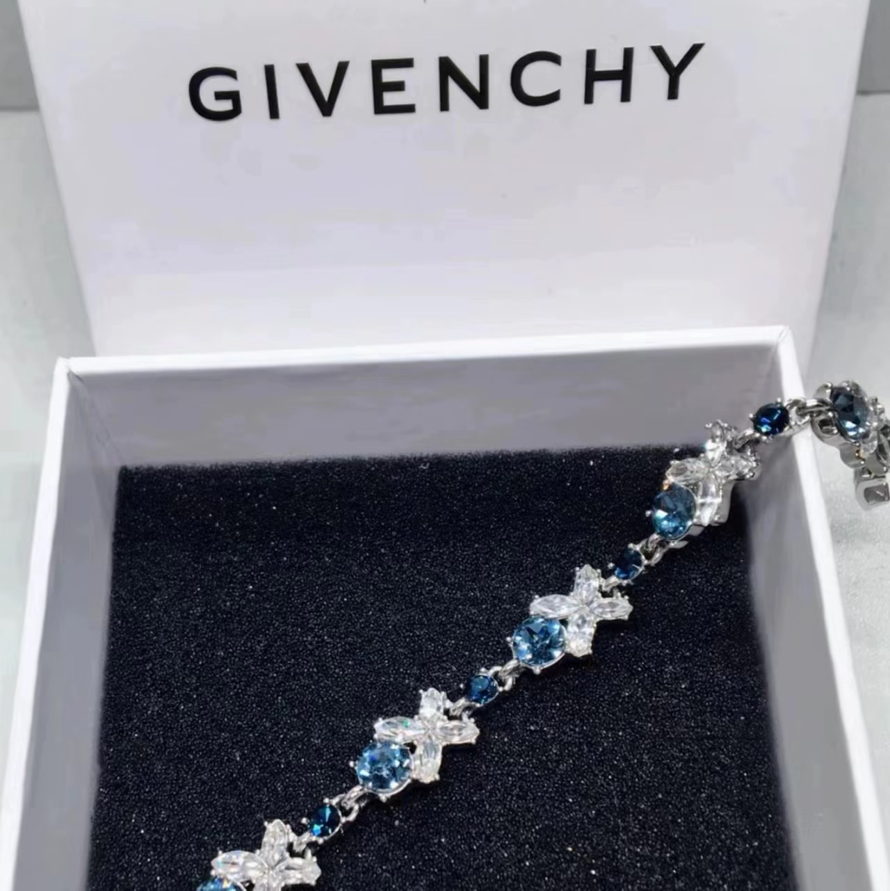 真的好喜欢 🔹蓝色的钻点缀的恰到好处 纪梵希的手链真的很美 非常非常好看!实物blingbling✨✨的很闪,验过了是正品,做工非常精致,很显高级,我手腕比较细,戴上稍微有点大‼️但是不影响什么,超美!