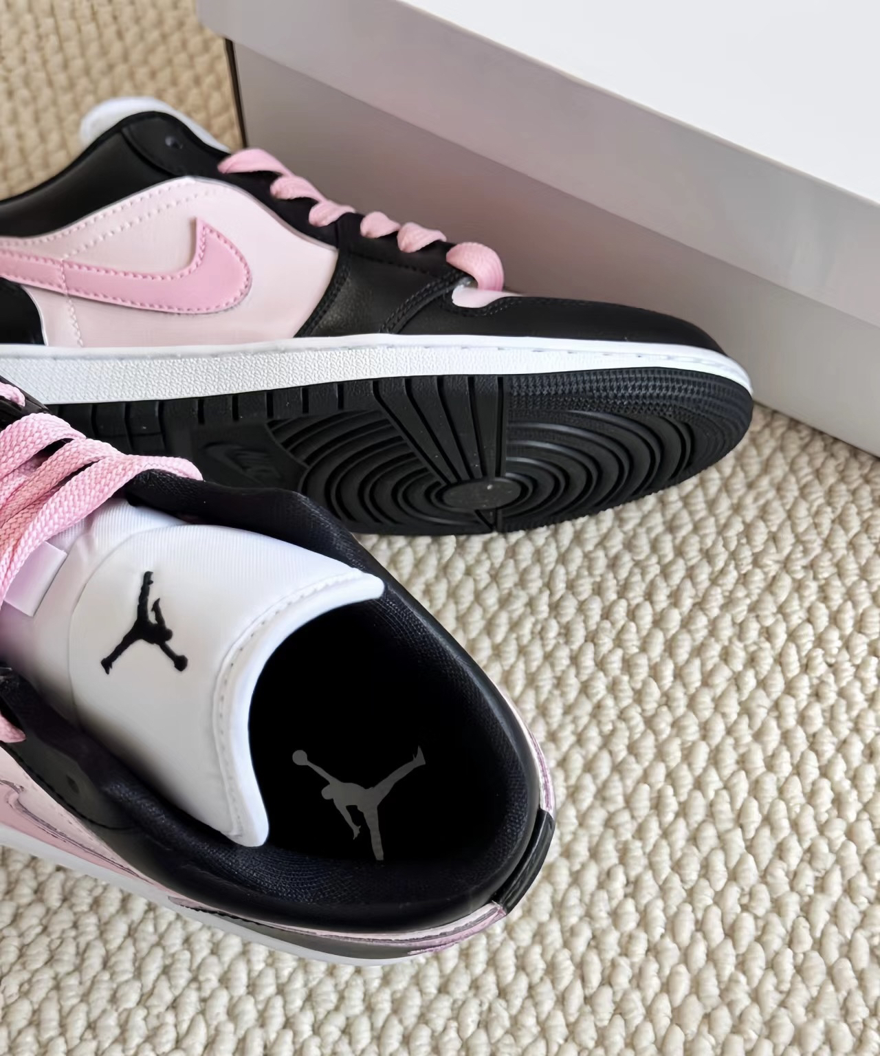 没选错!!我的AJ1好甜好酷!!!520限定黑粉配色 AJ1也有好看的黑粉啦~一下biu中少女心了 夏天穿 不要太适合呀 鞋身是浅浅的淡粉钩子是甜甜的蜜桃粉我很喜欢后跟的小英文蛮别致的, 出门不容易撞款仪式感拉满尺码正常选就好啦~日常搭配短裤或者短裙都很ok穿上就是甜妹了呀 我穿的这双出去玩回头率都很高呢!