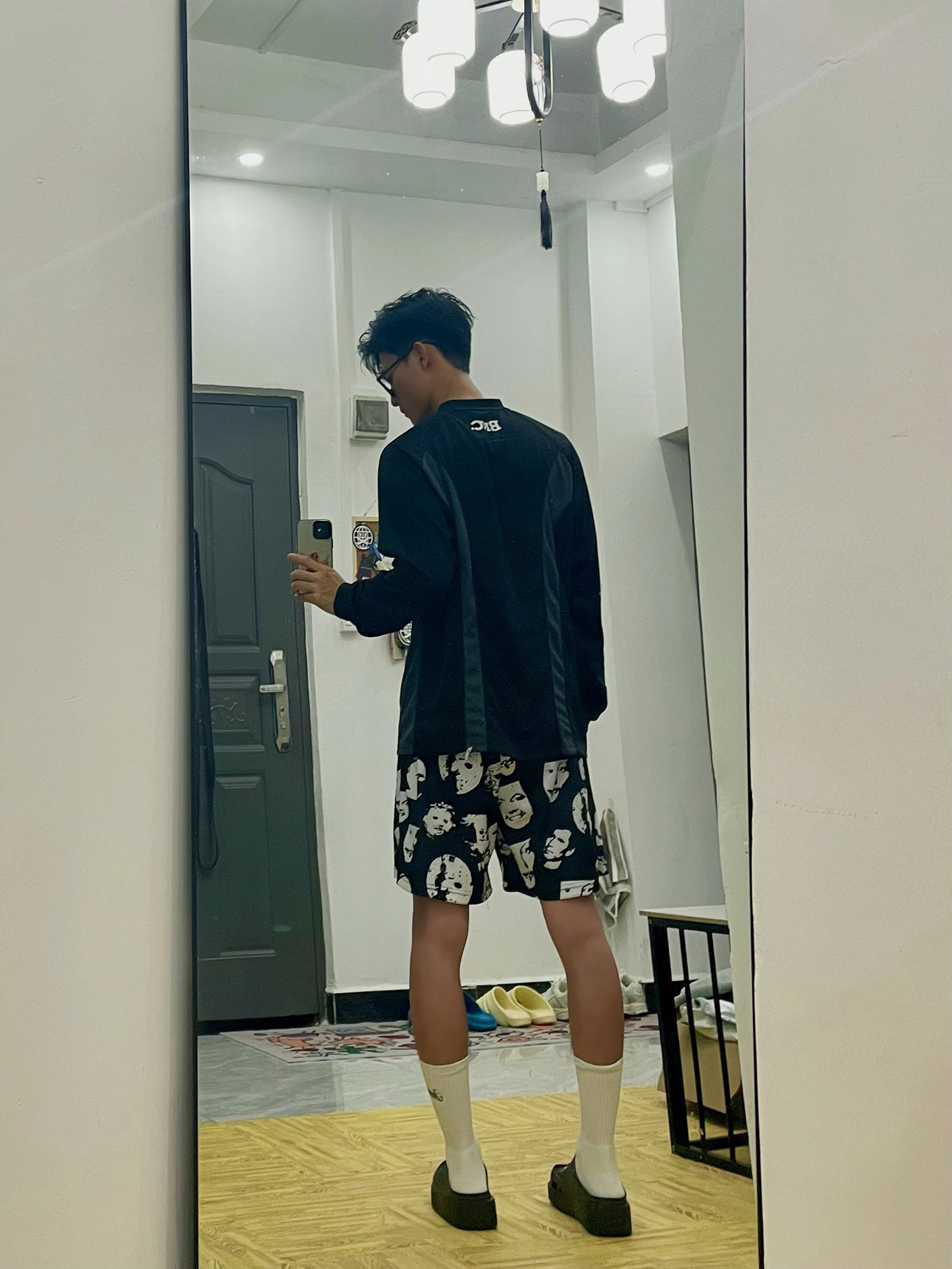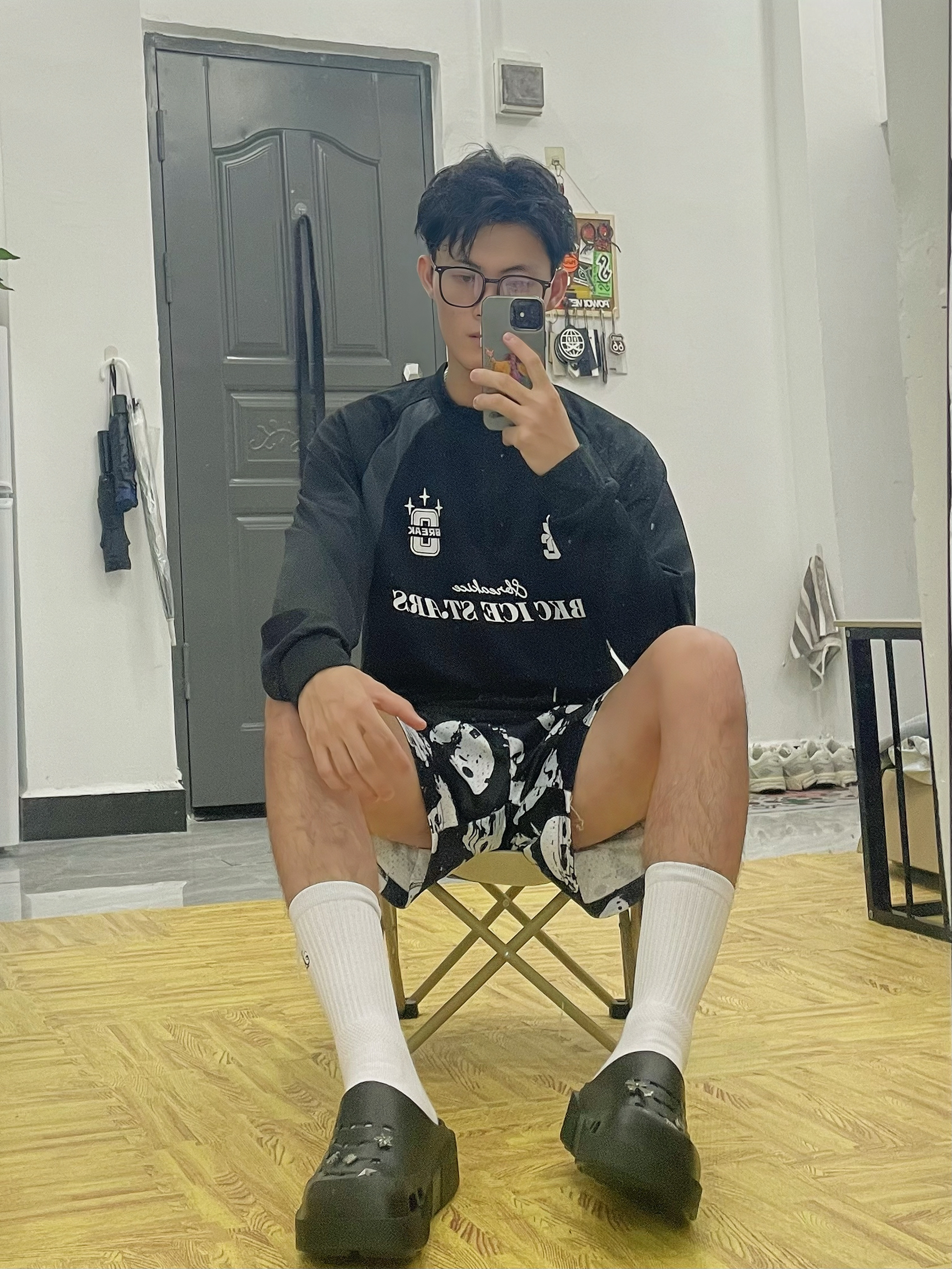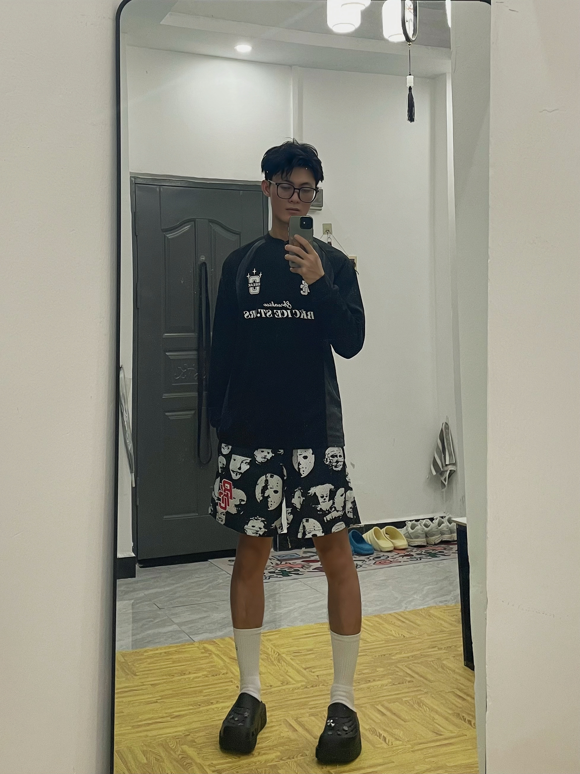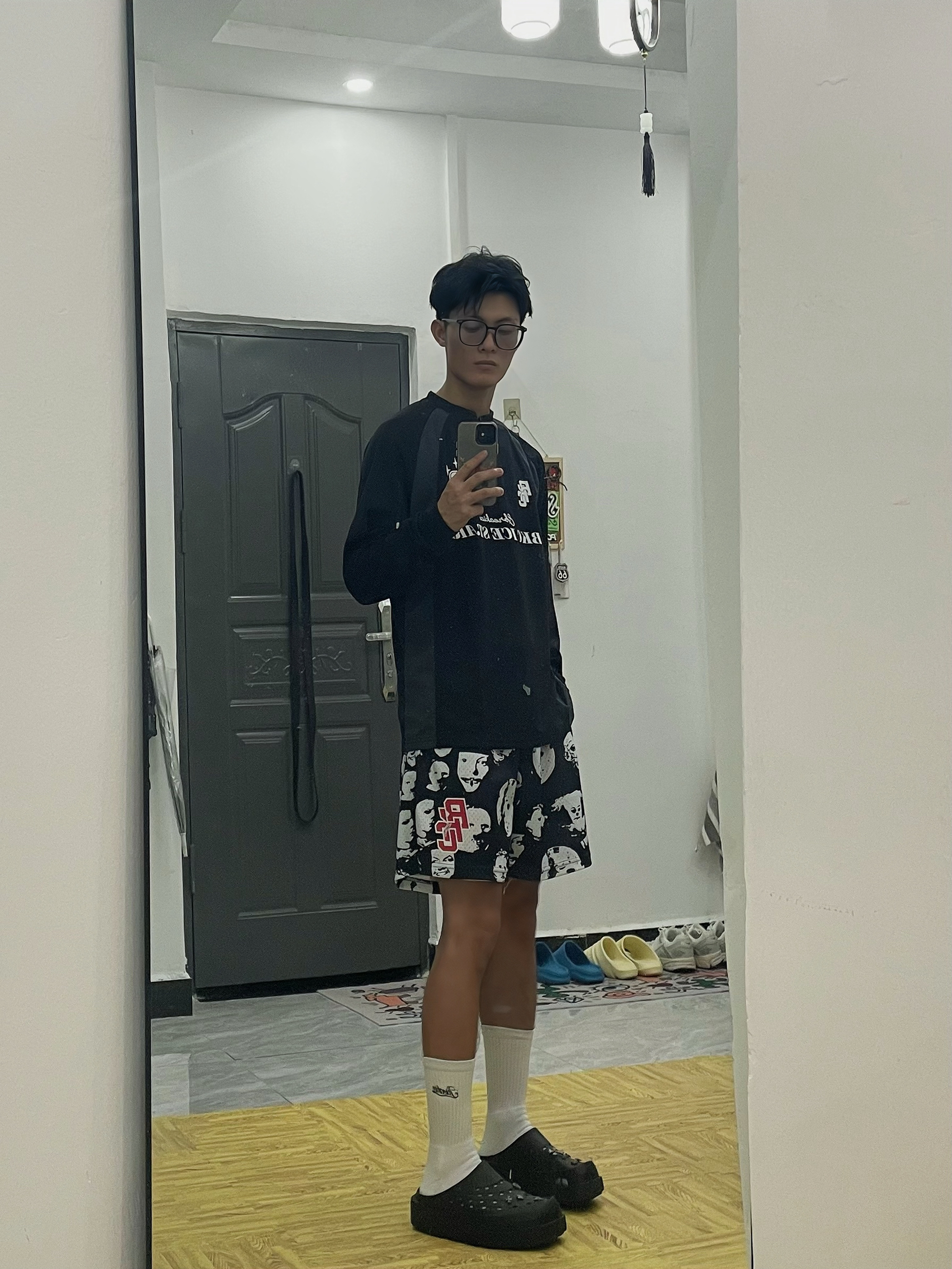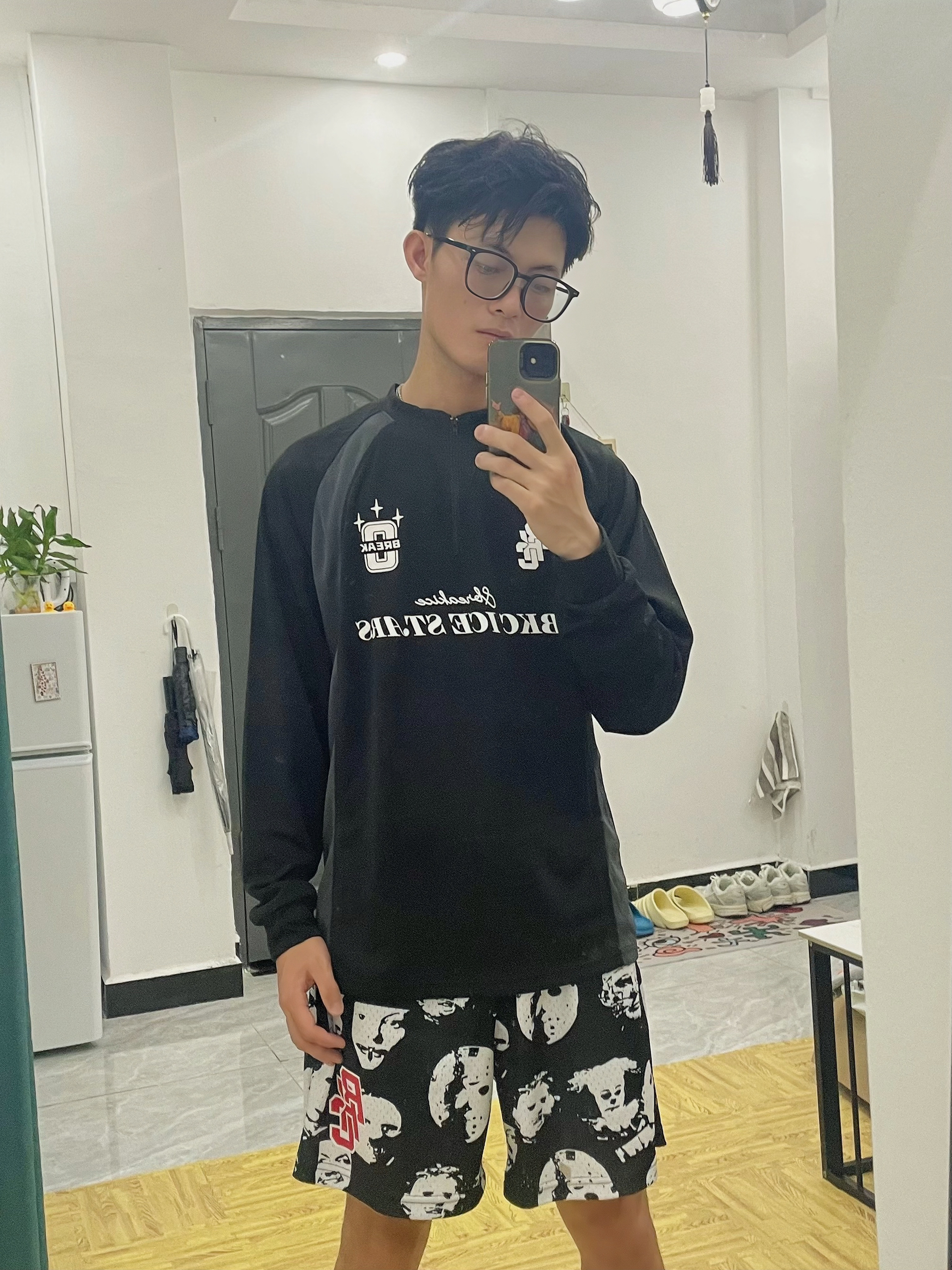 🎱分享一下今天出行穿搭吧[得意_blue] 🪞居宅家对着镜子拍,穿这一身搭洞洞鞋很帅 — — — — — — — — — — — — — — — ①OOTD 👔美式圆领半拉链直筒长袖,速干透气性好的网眼面料,宽松修身的运动版型,健身运动或篮球训练都非常适合,日常出街也非常美式 — 🩳美式复古人像美式复古印花短裤,宽松休闲的风格,双层网眼的透气性好的舒服面料,训练健身与跑步运动时速干极好,平常出门...