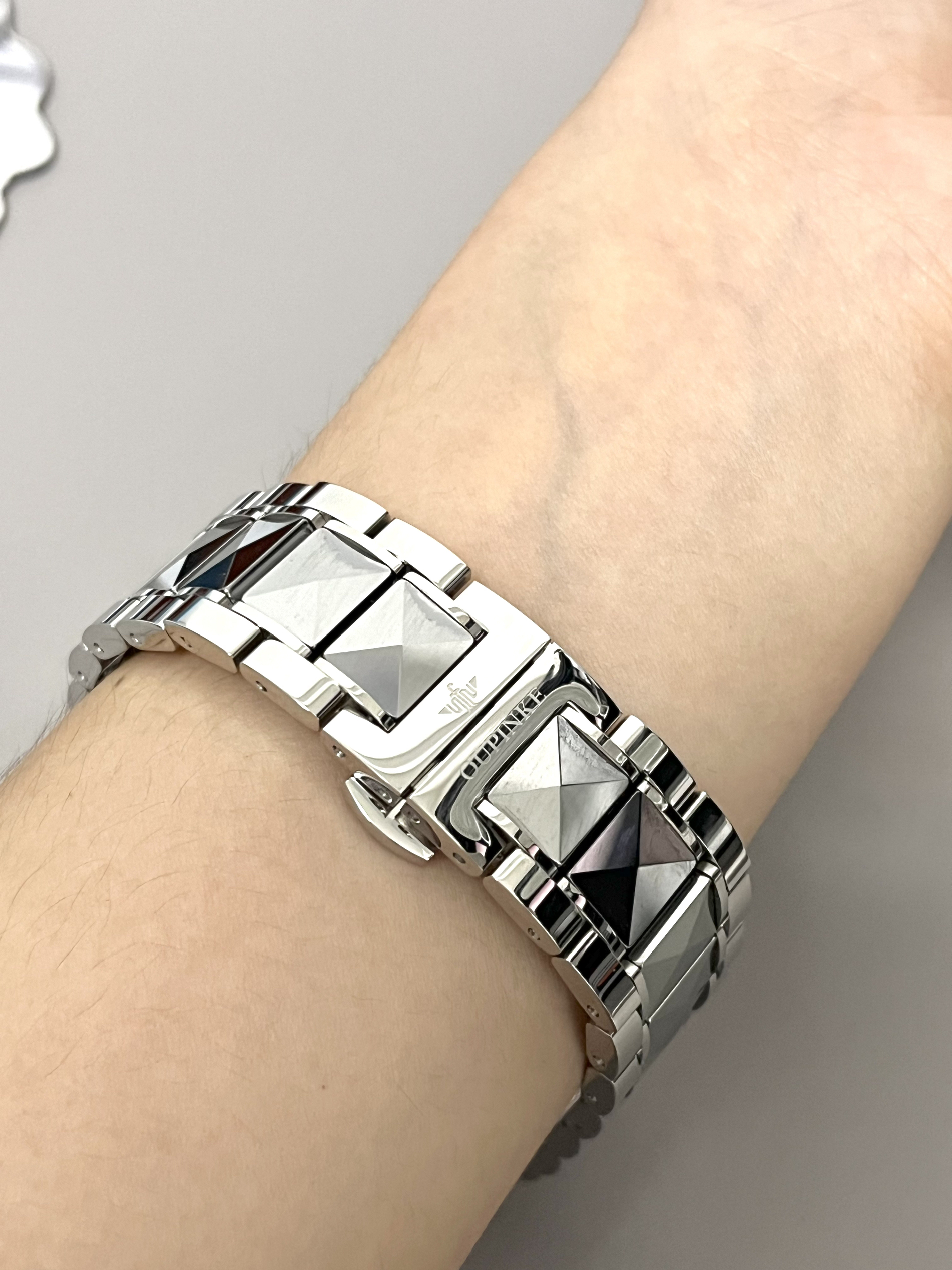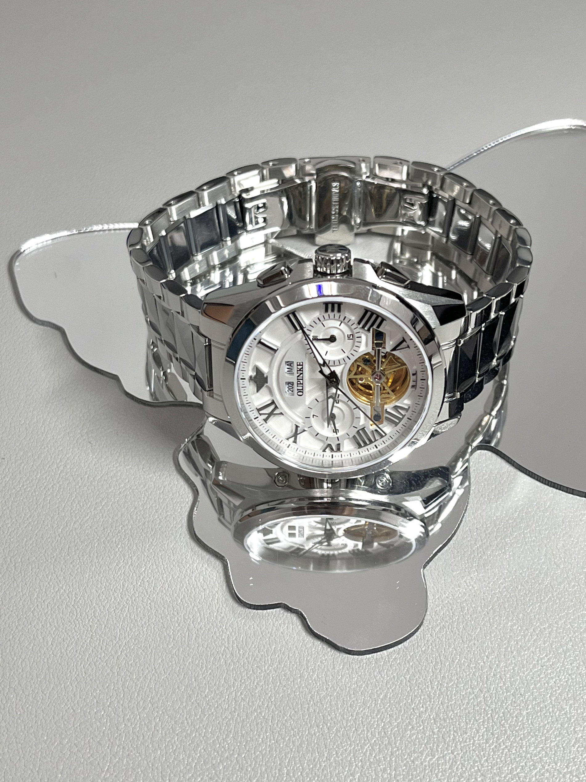 欧品客我劝你别泰帅啦尊嘟很懂商务男的心思呀整体是多功能镂空的设计 还挺适合男孩纸上班戴的精钢表带也挺舒服